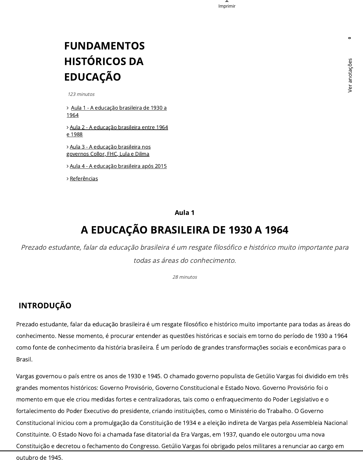 <p>Imprimir</p><p>INTRODUÇÃO</p><p>Prezado estudante, falar da educação brasileira é um resgate �losó�co e histórico muito importante para todas as áreas do</p><p>conhecimento. Nesse momento, é procurar entender as questões históricas e sociais em torno do período de 1930 a 1964</p><p>como fonte de conhecimento da história brasileira. É um período de grandes transformações sociais e econômicas para o</p><p>Brasil.</p><p>Vargas governou o país entre os anos de 1930 e 1945. O chamado governo populista de Getúlio Vargas foi dividido em três</p><p>grandes momentos históricos: Governo Provisório, Governo Constitucional e Estado Novo. Governo Provisório foi o</p><p>momento em que ele criou medidas fortes e centralizadoras, tais como o enfraquecimento do Poder Legislativo e o</p><p>fortalecimento do Poder Executivo do presidente, criando instituições, como o Ministério do Trabalho. O Governo</p><p>Constitucional iniciou com a promulgação da Constituição de 1934 e a eleição indireta de Vargas pela Assembleia Nacional</p><p>Constituinte. O Estado Novo foi a chamada fase ditatorial da Era Vargas, em 1937, quando ele outorgou uma nova</p><p>Constituição e decretou o fechamento do Congresso. Getúlio Vargas foi obrigado pelos militares a renunciar ao cargo em</p><p>outubro de 1945.</p><p>Aula 1</p><p>A EDUCAÇÃO BRASILEIRA DE 1930 A 1964</p><p>Prezado estudante, falar da educação brasileira é um resgate �losó�co e histórico muito importante para</p><p>todas as áreas do conhecimento.</p><p>28 minutos</p><p>FUNDAMENTOS</p><p>HISTÓRICOS DA</p><p>EDUCAÇÃO</p><p> Aula 1 - A educação brasileira de 1930 a</p><p>1964</p><p> Aula 2 - A educação brasileira entre 1964</p><p>e 1988</p><p> Aula 3 - A educação brasileira nos</p><p>governos Collor, FHC, Lula e Dilma</p><p> Aula 4 - A educação brasileira após 2015</p><p> Referências</p><p>123 minutos</p><p>0</p><p>V</p><p>e</p><p>r</p><p>a</p><p>n</p><p>o</p><p>ta</p><p>çõ</p><p>e</p><p>s</p><p>O SENTIDO DO ESTADO NOVO E A EDUCAÇÃO</p><p>O conceito de Estado Novo é muito importante para compreendermos a fase ditatorial de Getúlio Vargas, de 1930 a 1945. Já</p><p>chamado golpe do Estado Novo, ocorreu no período de 1937 a 1945. Ele foi �nalizado quando os militares obrigaram Vargas</p><p>a se retirar da presidência. Getúlio Vargas criou um regime autoritário no Brasil, tomando posturas centralizadoras ao</p><p>poder, como adiar possíveis eleições, com o intuito de formar uma constituinte no Brasil. Ele criou esforços e posturas</p><p>autoritárias, que colocaram o Brasil no caminho do autoritarismo, utilizando-se das “ameaças do comunismo” como ideia de</p><p>ampliar o seu poder no governo. Antes de 1935, ano que �cou marcado como a Intentona Comunista, quando os</p><p>comunistas tentaram tomar o poder no Brasil a partir de lutas armadas, Vargas já tinha em mente medidas autoritárias</p><p>para a sociedade, as quais foram realizadas depois das revoltas comunistas. Assim, ele criou, em 1935, a Lei de Segurança</p><p>Nacional, ampliando os poderes do presidente para combater crimes contra a “ordem social”. Nesse mesmo período, criou</p><p>também o Tribunal de Segurança Nacional, punindo os réus da lei aprovada em 1935, ampliando a perseguição aos grupos</p><p>da esquerda. A política de Vargas alinhava-se às ideias e ao interesse do Exército brasileiro. A sociedade brasileira começava</p><p>a entender a ideia e a força do autoritarismo brasileiro que estava sendo implantado naquele momento.</p><p>Essa característica do Estado Novo era uma tendência mundial de radicalização dessa política autoritária. A Europa estava</p><p>vivendo as mesmas situações de radicalismo às frentes populares nos regimes autoritários e fascistas. Nesse sentido,</p><p>Skidmore (2010, p. 64) a�rma que “o sistema não político do Estado Novo era o veículo perfeito para seus grandes talentos</p><p>de conciliação e manipulação que por sua vez dependem de um contato extremamente pessoal com advertência e aliados</p><p>1”. Nesse período do Estado Novo, Vargas reforçou o nacionalismo falando de “brasilidade”, marcha para o oeste,</p><p>movimento de habitação e desenvolvimento do interior do país como formas de resgatar os reais valores da nação. No</p><p>contexto político do Estado Novo, as conquistas do movimento renovador, in�uenciando a Constituição de 1934, foram</p><p>enfraquecidas na nova Constituição de 1937, que distingue o trabalho intelectual do trabalho manual, levando o ensino</p><p>pro�ssional para as classes mais desfavorecidas. Em 1942, por iniciativa do Ministro Gustavo Capanema, foram reformados</p><p>alguns módulos do ensino. Reformas essas chamadas de Leis Orgânicas do Ensino e são entendidas por decretos/leis que</p><p>criaram o Serviço Nacional de Aprendizagem Industrial (SENAI), valorizando o ensino pro�ssionalizante.</p><p>O �m do Estado Novo determinou a adoção de uma Constituição liberal e democrática. Na área da educação, por exemplo,</p><p>determinava a obrigatoriedade do ensino primário e a legislação sobre diretrizes educacionais. Vargas percebeu que seu</p><p>regime vingaria após o �m da Segunda Guerra Mundial, dando início a uma nova postura política, aproximando-se mais dos</p><p>trabalhadores. Em 1964, um golpe militar abortou todas as iniciativas de mudanças na educação brasileira, sob o pretexto</p><p>de que as propostas eram “subversivas”.</p><p>O OLHAR SOBRE AS RUPTURAS HISTÓRICAS, EDUCACIONAL E PROFISSIONAL</p><p>Nesse momento, torna-se importante para você, pro�ssional das diversas áreas do conhecimento, perceber a importância</p><p>das questões históricas para a análise do social e econômico em que está vivenciando e o quanto se torna válida a</p><p>compreensão do Estado Novo e suas relações com o mundo social e do trabalho e o quanto a história nos permite essas</p><p>re