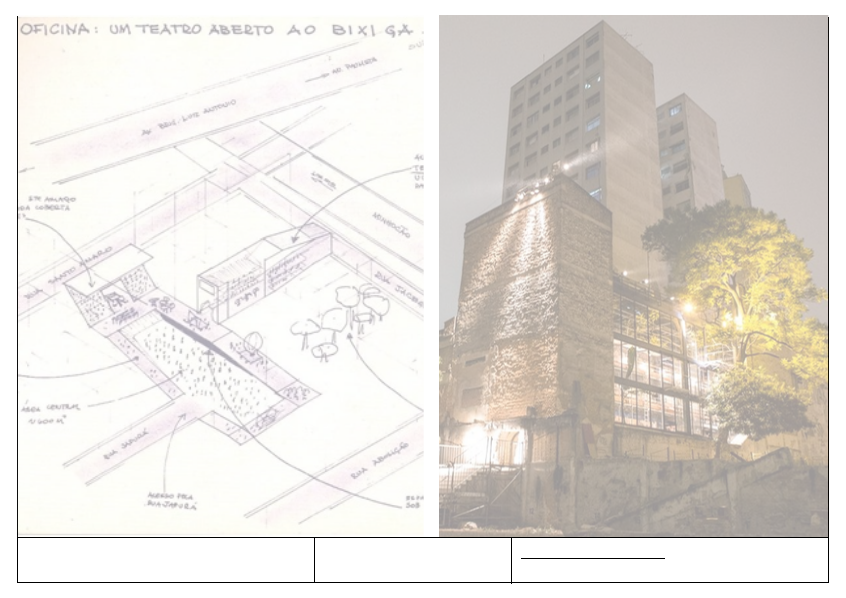 <p>ESTUDO DE CASO</p><p>Proposta para o Parque do Rio Bixiga / Teatro oficina</p><p>UNIP ALPHAVILLE - CURSO DE ARQUITETURA E URBANISMO</p><p>PAIU - Projeto Arquitetônico Intervenção Urbana</p><p>PROFESSOR(A): Mario Caldeira DATA: 28 / 09 / 2024</p><p>NOME: KEVIN ALBERTO C. CORONEL</p><p>MATRÍCULA: D58HJC - 1</p><p>TURMA: TUTELADO</p><p>CONTEXTO GEOGRAFICO, SOCIAL,</p><p>CONCEITO E PARTIDO DA PROPOSTA</p><p>Fig. 3: Proposta de Edson Jorge Elito para o Parque do Rio Bixiga.</p><p>Fonte: https://vitruvius.com.br/revistas/read/entrevista/24.095/8840. 07/2023.</p><p>Proposta de Edson Jorge Elito para o Parque do Rio Bixiga</p><p>Em 1980, devido à instabilidade político-</p><p>econômica do país, às ocupações irregulares</p><p>e a uma disputa legal, o teatro encontrava-se</p><p>em condições precárias, tanto no aspecto</p><p>físico quanto nas suas instalações.</p><p>Com isso os responsáveis começaram um</p><p>movimento para adquirir o imóvel e</p><p>reestruturá-lo, o que levou à elaboração de</p><p>um projeto de reestruturação e reforma por</p><p>Lina Bo Bardi, Marcelo Suzuki e com a</p><p>participação de Edson Elito. Além disso, em</p><p>1981, o espaço foi tombado como patrimônio</p><p>histórico pelo CONDEPHAAT.</p><p>Como primeira proposta de reestruturação</p><p>do teatro, Lina Bardi e Marcelo Suzuki</p><p>realizaram um estudo preliminar que, no</p><p>entanto, não foi implementado. Nesse estudo,</p><p>propunha-se a conexão das ruas Jaceguay,</p><p>Japurá e um acesso pela rua Santo Amaro.</p><p>Essa configuração terminaria em uma</p><p>ampla área livre, com rampas e passarelas</p><p>contornando suas extremidades, além de uma</p><p>arquibancada coberta voltada para esse</p><p>espaço, formando um espaço cênico</p><p>unificado.</p><p>Na proposta de reforma do teatro,</p><p>decidiu-se pela demolição total do seu</p><p>interior, incluindo a laje que cobria o porão.</p><p>Apenas preservando os antigos invólucros de</p><p>tijolos da década de 1920, com seus arcos</p><p>romanos na base e cobertura.</p><p>Fig. 5: Espaço interno demolido.</p><p>Fonte: https://vitruvius.com.br/revistas/read/entrevista/. 07/2023.</p><p>Fig. 4: Fachada externa.</p><p>Fonte: https://vitruvius.com.br/revistas/read/entrevista/. 07/2023.</p><p>DESENVOLVIMENTO DA PROPOSTA</p><p>Fig. 5 e 6: Croquis.</p><p>Fonte: https://vitruvius.com.br/revistas/read/entrevista/24.095/8840. 07/2023.</p><p>O resultado foi a criação de um grande</p><p>corredor aberto, medindo 9m por 50m, com</p><p>paredes laterais altas que chegam a 13m de</p><p>altura. Este novo espaço, oculto pela fachada</p><p>ainda cinzenta e inexpressiva, proporciona</p><p>ao espectador uma verdadeira experiência</p><p>de "rito de passagem" ao atravessar da rua</p><p>para o interior mágico do teatro.</p><p>''Quando iniciamos o projeto e durante</p><p>toda a sua concepção, Lina e eu procuramos</p><p>concretizar as propostas cênica e espacial de</p><p>Zé Celso. De um lado nós arquitetos e nossa</p><p>formação modernista, os conceitos de</p><p>limpeza formal, pureza de elementos,</p><p>racionalismo construtivo, ascetismo e do</p><p>outro, o teatro de Zé Celso, com o</p><p>simbolismo, a iconoclastia, o barroco, a</p><p>antropofagia, o sentido, a emoção e o desejo</p><p>de contato físico, entre atores e platéia, o te-</p><p>ato. Lina ainda fez muito mais do que isso.</p><p>Pensou todo o espaço do teatro como</p><p>elemento cenográfico, como parte da peça</p><p>teatral.’’(ELITO, 1999)</p><p>‘’Do ponto de vista da arquitetura, o</p><p>Oficina vai procurar a verdadeira significação</p><p>do teatro sua estrutura Física e Tactil, sua</p><p>não abstração que o diferencia</p><p>profundamente do cinema e da tevê,</p><p>permitindo ao mesmo tempo o uso total</p><p>desses meios’’. (Lina Bo Bardi)</p><p>PROJETO CONSTRUÍDO</p><p>Inspirada pela simplicidade e clareza</p><p>do teatro Nô japonês, Lina criou as</p><p>galerias com passarelas de tábuas</p><p>interligadas. Em vez de poltronas, são</p><p>usados bancos simples e leves que podem</p><p>ser rearranjados conforme a cena.</p><p>As galerias, passarelas e o palco são</p><p>apoiados em estruturas metálicas,</p><p>conferindo-lhes um caráter provisório, com</p><p>a possibilidade de desmontagem e</p><p>reorganização, resultando em uma</p><p>“arquitetura de andaimes”.</p><p>O projeto também inclui um jardim</p><p>interno, uma cachoeira que deságua em</p><p>um espelho d’água (um elemento</p><p>frequentemente usado por Lina) e uma</p><p>rede de gás que abastece o centro do</p><p>teatro para efeitos de fogo.</p><p>Além disso, há uma grande abertura</p><p>em uma das paredes e uma cobertura</p><p>móvel que permite a conexão com uma</p><p>área verde. Elementos como água, fogo e</p><p>ar são integrados à arquitetura, tornando-</p><p>se parte do cenário do teatro.</p><p>Para superar o desnível do porão, foi</p><p>proposto a inclusão de um “palco rampa” de</p><p>25 metros de comprimento, que se estende</p><p>por toda a extensão do teatro, desde a</p><p>entrada até os fundos.</p><p>Como intervenção estrutural, foram</p><p>sugeridas peças de concreto aplicadas nas</p><p>altas paredes de tijolos para reforçá-las e</p><p>auxiliá-las no com travamento.</p><p>A cobertura foi projetada com uma</p><p>estrutura metálica para suportar uma</p><p>abóbada deslizante.</p><p>Fig. 7: Espetáculo no Teatro Oficina.</p><p>Fonte: https://vitruvius.com.br/revistas/read/entrevista/. 07/2023.</p><p>Fig. 8: Espaço interno atualmente</p><p>Fonte: https://vitruvius.com.br/revistas/read/entrevista/. 07/2023.</p><p>Fig. 9: Espaço interno atualmente</p><p>Fonte: https://vitruvius.com.br/revistas/read/entrevista/. 07/2023.</p><p>FICHA TÉCNICA</p><p>CONTEXTO GEOGRAFICO E SOCIAL</p><p>CONCEITO</p><p>LOCALIZAÇÃO</p><p>Localizado na Rua Jaceguai, no</p><p>bairro Bela Vista, o teatro oficina Uzyna</p><p>Uzona foi restaurado pelos arquitetos</p><p>Lina
