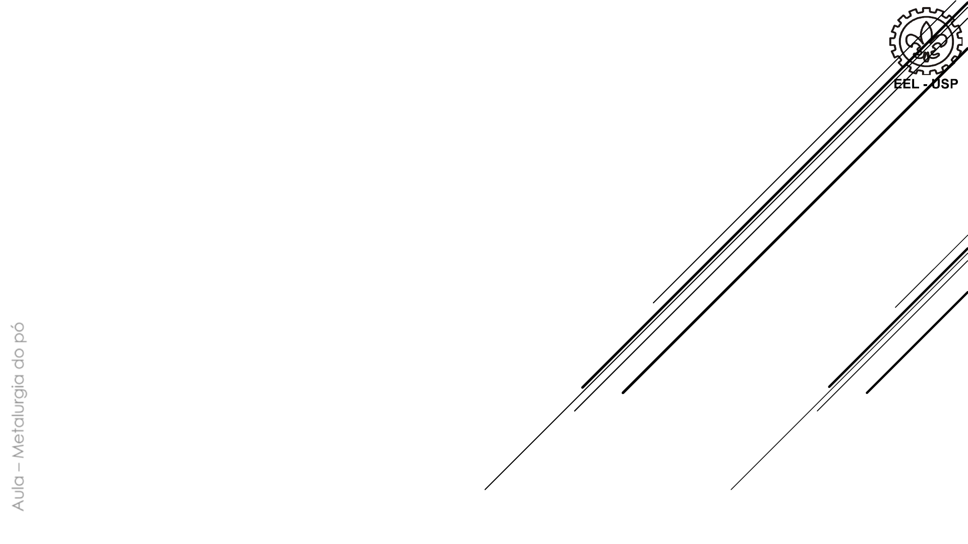 <p>LOM 3236 – Processos de Fabricação</p><p>A</p><p>u</p><p>la</p><p>–</p><p>M</p><p>e</p><p>ta</p><p>lu</p><p>rg</p><p>ia</p><p>d</p><p>o</p><p>p</p><p>ó</p><p>PROCESSOS DE</p><p>FABRICAÇÃO</p><p>LOM 3236</p><p>Profa. Dra. Katia Cristiane Gandolpho Candioto</p><p>Departamento de Engenharia de Materiais</p><p>Escola de Engenharia de Lorena - USP</p><p>LOM 3236 – Processos de Fabricação</p><p>A</p><p>u</p><p>la</p><p>–</p><p>M</p><p>e</p><p>ta</p><p>lu</p><p>rg</p><p>ia</p><p>d</p><p>o</p><p>p</p><p>ó</p><p>AULA</p><p>METALURGIA</p><p>DO PÓ</p><p>LOM 3236 – Processos de Fabricação</p><p>A</p><p>u</p><p>la</p><p>–</p><p>M</p><p>e</p><p>ta</p><p>lu</p><p>rg</p><p>ia</p><p>d</p><p>o</p><p>p</p><p>ó</p><p>Profa. Dra. Katia Cristiane Gandolpho Candioto 3</p><p>METALURGIA DO PÓ</p><p>Metalurgia do Pó é a arte de produzir peças e</p><p>componentes através da aplicação de pressão sobre</p><p>pós metálicos ou cerâmicos. A aplicação de calor</p><p>durante ou após a compactação é utilizada para</p><p>aumentar a ligação entre as partículas. Este</p><p>processo de aquecimento abaixo do ponto de fusão</p><p>é conhecido por sinterização.</p><p>LOM 3236 – Processos de Fabricação</p><p>A</p><p>u</p><p>la</p><p>–</p><p>M</p><p>e</p><p>ta</p><p>lu</p><p>rg</p><p>ia</p><p>d</p><p>o</p><p>p</p><p>ó</p><p>Profa. Dra. Katia Cristiane Gandolpho Candioto 4</p><p> Etapas do processo:</p><p>METALURGIA DO PÓ</p><p>Produção do pó</p><p>Mistura</p><p>Caracterização do pó</p><p>Compactação</p><p>Sinterização</p><p>LOM 3236 – Processos de Fabricação</p><p>A</p><p>u</p><p>la</p><p>–</p><p>M</p><p>e</p><p>ta</p><p>lu</p><p>rg</p><p>ia</p><p>d</p><p>o</p><p>p</p><p>ó</p><p>Profa. Dra. Katia Cristiane Gandolpho Candioto 5</p><p> Etapas do processo:</p><p>➢ Produção do pó</p><p>METALURGIA DO PÓ</p><p>LOM 3236 – Processos de Fabricação</p><p>A</p><p>u</p><p>la</p><p>–</p><p>M</p><p>e</p><p>ta</p><p>lu</p><p>rg</p><p>ia</p><p>d</p><p>o</p><p>p</p><p>ó</p><p>Profa. Dra. Katia Cristiane Gandolpho Candioto 6</p><p> Etapas do processo:</p><p>➢ Produção do pó</p><p>✓ Tamanho de partícula</p><p>✓ Forma</p><p>✓ Microestrutura</p><p>✓ Composição</p><p>✓ Fricção</p><p>METALURGIA DO PÓ</p><p>LOM 3236 – Processos de Fabricação</p><p>A</p><p>u</p><p>la</p><p>–</p><p>M</p><p>e</p><p>ta</p><p>lu</p><p>rg</p><p>ia</p><p>d</p><p>o</p><p>p</p><p>ó</p><p>Profa. Dra. Katia Cristiane Gandolpho Candioto 7</p><p> Etapas do processo:</p><p>➢ Compactação</p><p>METALURGIA DO PÓ</p><p>LOM 3236 – Processos de Fabricação</p><p>A</p><p>u</p><p>la</p><p>–</p><p>M</p><p>e</p><p>ta</p><p>lu</p><p>rg</p><p>ia</p><p>d</p><p>o</p><p>p</p><p>ó</p><p>Profa. Dra. Katia Cristiane Gandolpho Candioto 8</p><p> Etapas do processo:</p><p>➢ Sinterização</p><p>METALURGIA DO PÓ</p><p>LOM 3236 – Processos de Fabricação</p><p>A</p><p>u</p><p>la</p><p>–</p><p>M</p><p>e</p><p>ta</p><p>lu</p><p>rg</p><p>ia</p><p>d</p><p>o</p><p>p</p><p>ó</p><p>Profa. Dra. Katia Cristiane Gandolpho Candioto 9</p><p> Etapas do processo:</p><p>➢ Processo</p><p>✓ Compressão</p><p>✓ Compressão a quente</p><p>✓ Extrusão</p><p>✓ Forja</p><p>✓ Sinterização (temperatura e tempo)</p><p>METALURGIA DO PÓ</p><p>LOM 3236 – Processos de Fabricação</p><p>A</p><p>u</p><p>la</p><p>–</p><p>M</p><p>e</p><p>ta</p><p>lu</p><p>rg</p><p>ia</p><p>d</p><p>o</p><p>p</p><p>ó</p><p>Profa. Dra. Katia Cristiane Gandolpho Candioto 10</p><p> Propriedades:</p><p>➢ Densidade</p><p>➢ Resistência</p><p>➢ Ductilidade</p><p>➢ Condutividade</p><p>➢ Microestrutura</p><p>METALURGIA DO PÓ</p><p>LOM 3236 – Processos de Fabricação</p><p>A</p><p>u</p><p>la</p><p>–</p><p>M</p><p>e</p><p>ta</p><p>lu</p><p>rg</p><p>ia</p><p>d</p><p>o</p><p>p</p><p>ó</p><p>Profa. Dra. Katia Cristiane Gandolpho Candioto 11</p><p>Alguns fatores econômicos contribuem para que</p><p>atualmente a MP venha sendo utilizada em larga</p><p>escala, tais como, o número reduzido de</p><p>operações na produção da peça acabada, em</p><p>relação a outros processos e o aproveitamento</p><p>quase total da matéria prima.</p><p>METALURGIA DO PÓ</p><p>LOM 3236 – Processos de Fabricação</p><p>A</p><p>u</p><p>la</p><p>–</p><p>M</p><p>e</p><p>ta</p><p>lu</p><p>rg</p><p>ia</p><p>d</p><p>o</p><p>p</p><p>ó</p><p>Profa. Dra. Katia Cristiane Gandolpho Candioto 12</p><p> Vantagens:</p><p>➢ Temperaturas baixas, fornos simples</p><p>➢ Apresenta boa tolerância dimensional</p><p>➢ Excelente acabamento superficial</p><p>➢ Formas complexas</p><p>➢ Alto controle de composi��ão química</p><p>METALURGIA DO PÓ</p><p>LOM 3236 – Processos de Fabricação</p><p>A</p><p>u</p><p>la</p><p>–</p><p>M</p><p>e</p><p>ta</p><p>lu</p><p>rg</p><p>ia</p><p>d</p><p>o</p><p>p</p><p>ó</p><p>Profa. Dra. Katia Cristiane Gandolpho Candioto 13</p><p> Vantagens:</p><p>➢ Controle das propriedades físicas</p><p>(material poroso, metal duro, material</p><p>refratário)</p><p>➢ Alta produtividade na fabricação de</p><p>grande quantidade</p><p>➢ Permite automação</p><p>➢ Minimiza controle de qualidade</p><p>METALURGIA DO PÓ</p><p>LOM 3236 – Processos de Fabricação</p><p>A</p><p>u</p><p>la</p><p>–</p><p>M</p><p>e</p><p>ta</p><p>lu</p><p>rg</p><p>ia</p><p>d</p><p>o</p><p>p</p><p>ó</p><p>Profa. Dra. Katia Cristiane Gandolpho Candioto 14</p><p> Desvantagens:</p><p>➢ Necessidade de extração de matriz</p><p>(geometria limitada)</p><p>➢ Tamanho de peça (área transversal)</p><p>➢ Porosidade residual</p><p>METALURGIA DO PÓ</p><p>LOM 3236 – Processos de Fabricação</p><p>A</p><p>u</p><p>la</p><p>–</p><p>M</p><p>e</p><p>ta</p><p>lu</p><p>rg</p><p>ia</p><p>d</p><p>o</p><p>p</p><p>ó</p><p>Profa. Dra. Katia Cristiane Gandolpho Candioto 15</p><p>METALURGIA DO PÓ</p><p>LOM 3236 – Processos de Fabricação</p><p>A</p><p>u</p><p>la</p><p>–</p><p>M</p><p>e</p><p>ta</p><p>lu</p><p>rg<