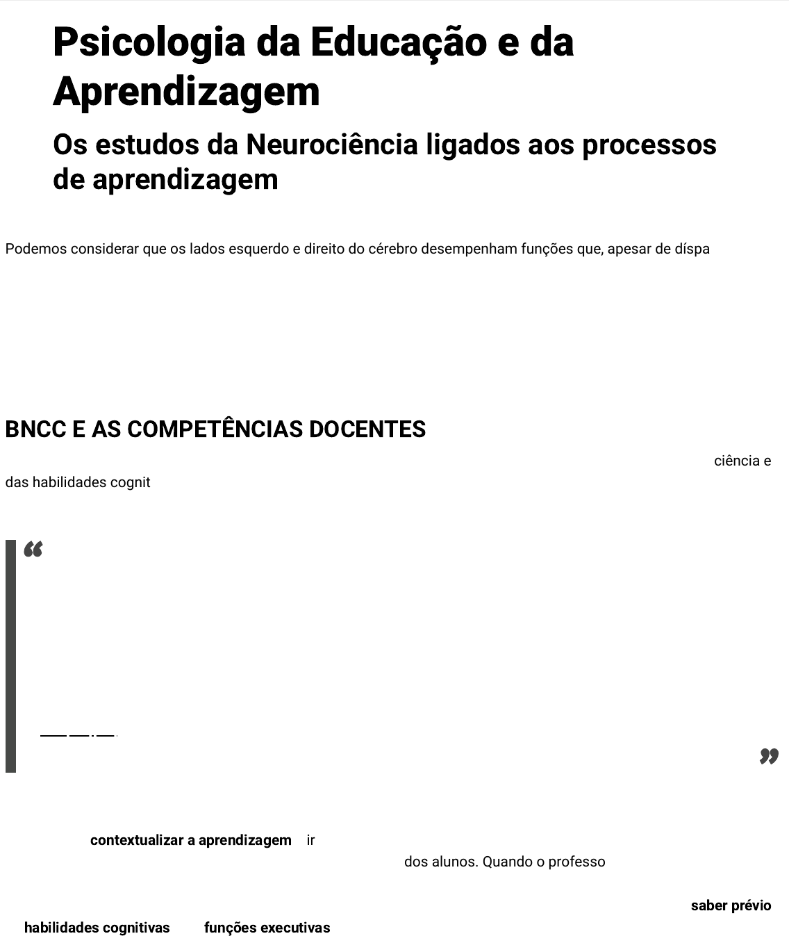 <p>Você sabia que seu material didático é interativo e multimídia? Isso significa que você pode interagir com o conteúdo de diversas formas, a qualquer</p><p>hora e lugar. Na versão impressa, porém, alguns conteúdos interativos ficam desabilitados. Por essa razão, fique atento: sempre que possível, opte pela</p><p>versão digital. Bons estudos!</p><p>Psicologia da Educação e da</p><p>Aprendizagem</p><p>Os estudos da Neurociência ligados aos processos</p><p>de aprendizagem</p><p>Podemos considerar que os lados esquerdo e direito do cérebro desempenham funções que, apesar de díspares,</p><p>complementam-se. Antigamente o raciocínio lógico era considerado a principal função do cérebro. Hoje sabemos que a</p><p>criatividade é uma habilidade cerebral importante e que manter o equilíbrio entre razão e emoção é um desafio do ser</p><p>humano. Mas como considerar todos esses aspectos e conseguir estimular todas essas habilidades em nossos alunos?</p><p>Para ajudá-lo nesta tarefa, esta webaula apresentará possibilidades de estimular habilidades por meio de jogos e</p><p>brincadeiras.</p><p>BNCC E AS COMPETÊNCIAS DOCENTES</p><p>Na formação do docente, as competências gerais trazem informações das quais podemos fazer uso da neurociência e</p><p>das habilidades cognitivas tanto para o aperfeiçoamento do professor quanto do aluno.</p><p>COMPETÊNCIAS GERAIS DOCENTES</p><p>Utilizar diferentes linguagens – verbal, corporal, visual, sonora e digital – para se expressar e fazer com que o estudante amplie seu modelo de</p><p>expressão ao partilhar informações, experiências, ideias e sentimentos em diferentes contextos, produzindo sentidos que levem ao</p><p>entendimento mútuo.</p><p>Valorizar a formação permanente para o exercício profissional, buscar atualização na sua área e afins, apropriar-se de novos conhecimentos e</p><p>experiências que lhes possibilitem aperfeiçoamento profissional e eficácia e fazer escolhas alinhadas ao exercício da cidadania, ao seu projeto</p><p>de vida, com liberdade, autonomia, consciência crítica e responsabilidade.</p><p>— Brasil (2018, p. 13)</p><p>“</p><p>”</p><p>Entender sobre o desenvolvimento cognitivo da criança e suas aptidões relacionadas ao nível de aprendizagem permite</p><p>ao professor contextualizar a aprendizagem, direcionando suas estratégias didáticas dentro da demanda que a turma</p><p>apresenta ou, ainda, permite melhorar o nível de escolaridade dos alunos. Quando o professor está atento não só ao</p><p>conteúdo a ser dado, mas também ao nível cognitivo, social e econômico de seus alunos, a proposta da aprendizagem</p><p>será direcionada de maneira a contribuir com o processo de aquisições do conhecimento, considerando o saber prévio,</p><p>as habilidades cognitivas e as funções executivas.</p><p>Estímulos produzidos por jogos</p><p>Jogo Faixa etária Habilidades (funções executivas)</p><p>Jogo de damas A partir dos 6</p><p>anos</p><p>Objetivar, monitorar, iniciar, focar, operacionalizar e perseverar.</p><p>Jogo da velha A partir dos 4</p><p>anos</p><p>Planejar, objetivar, operacionalizar, controle inibitório e</p><p>perseverar.</p><p>Jogo de cartas (Uno, Can-</p><p>Can)</p><p>A partir dos 6</p><p>anos</p><p>Iniciar, regular, flexibilizar, monitorar e organizar.</p><p>Fonte: elaborado pela autora.</p><p>ATIVIDADES PEDAGÓGICAS</p><p>Na escola, podemos estimular habilidades por meio de jogos e brincadeiras, para além das atividades pedagógicas</p><p>propostas. Para cada faixa etária existem estímulos produzidos por jogos, que podem trazer para o aluno mais</p><p>habilidades, ajudando-o a aprender. Conheça alguns exemplos:</p><p>De modo geral, é importante conhecer as fases de desenvolvimento de habilidades das crianças para atividades</p><p>cotidianas.</p><p>Crianças de 4 a 5 anos</p><p>Capazes de cumprir tarefas de uma etapa.</p><p>Realizam pequenas tarefas domésticas.</p><p>Realizam atividades diárias como alimentar-se, vestir-se, tomar banho.</p><p>Capazes de inibir um comportamento simples, como levantar a mão antes de falar.</p><p>Crianças de 5 a 7 anos</p><p>Capazes de cumprir tarefas de duas a três etapas, com monitoria.</p><p>Realizam pequenas tarefas domésticas, como arrumar o quarto.</p><p>Realizam tarefas que exijam atenção, como a lição de casa, com duração máxima de 20 minutos.</p><p>Capazes de inibir um comportamento, como seguir regras de segurança, esperar a vez para falar.</p><p>Capazes de fazer pequenas escolhas: como gastar seu dinheiro ou controlar a mesada recebida.</p><p>Crianças de 7 a 10 anos</p><p>Capazes de cumprir tarefas de múltiplas etapas com mais tempo e sem a presença de um adulto.</p><p>Realizam tarefas domésticas de colaboração.</p><p>Capazes de organizar seus pertences sem a presença de um adulto.</p><p>Controlam-se em sala de aula sem a presença do professor.</p><p>Crianças de 10 a 14 anos</p><p>Realizam tarefas que exijam atenção, como a lição de casa, com duração entre 60 a 90 minutos, sem a</p><p>supervisão de um adulto.</p><p>Capazes de inibir o comportamento autônomo.</p><p>Temos de compreender que em uma sala de aula há alunos com diversas características para a aprendizagem. Alguns</p><p>são mais auditivos, outros mais visuais. Precisamos pensar também nos alunos que apresentam alguma dificuldade de</p><p>aprendizagem simples ou no âmbito neurológico, como TDAH, dislexia, TEA e outros.</p><p>Durante a prática docente, certamente esbarraremos em situações em que a criança apresenta dificuldades de</p><p>aprendizagem. Para esses casos, é preciso estudar, pesquisar e buscar ajuda para encontrar soluções efetivas, de modo</p><p>que a criança consiga aprender e acompanhar o restante dos alunos.</p><p>Pesquise mais</p><p>O Instituto ABCD é uma organização social e sem fins lucrativos que promove cursos, disseminando</p><p>conhecimentos para que tanto pais quanto professores pos