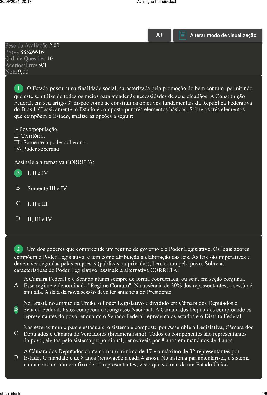 <p>30/09/2024, 20:17 Avaliação Individual A+ Alterar modo de visualização Peso da Avaliação 2,00 Prova 88526616 Qtd. de Questões 10 Acertos/Erros 9/1 Nota 9,00 1 O Estado possui uma finalidade social, caracterizada pela promoção do bem comum, permitindo que este se utilize de todos os meios para atender às necessidades de seus cidadãos. A Constituição Federal, em seu artigo 3° dispõe como se constitui os objetivos fundamentais da República Federativa do Brasil. Classicamente, Estado é composto por três elementos básicos. Sobre os três elementos que compõem Estado, analise as opções a seguir: I- Povo/população. II- Território. III- Somente poder soberano. IV- Poder soberano. Assinale a alternativa CORRETA: A I, II e IV B Somente III e IV C I. II e III D II, III e IV 2 Um dos poderes que compreende um regime de governo é Poder Legislativo. Os legisladores compõem Poder Legislativo, e tem como atribuição a elaboração das leis. As leis são imperativas e devem ser seguidas pelas empresas (públicas ou privadas), bem como pelo povo. Sobre as características do Poder Legislativo, assinale a alternativa CORRETA: A Câmara Federal e Senado atuam sempre de forma coordenada, ou seja, em seção conjunta. A Esse regime é denominado "Regime Na ausência de 30% dos representantes, a sessão é anulada. A data da nova sessão deve ter anuência do Presidente. No Brasil, no âmbito da União, Poder Legislativo é dividido em Câmara dos Deputados e B Senado Federal. Estes compõem Congresso Nacional. A Câmara dos Deputados compreende os representantes do povo, enquanto Senado Federal representa os estados e Distrito Federal. Nas esferas municipais e estaduais. sistema é composto por Assembleia Legislativa, Câmara dos C Deputados e Câmara de Vereadores (bicameralismo). Todos os componentes são representantes do povo, eleitos pelo sistema proporcional, renováveis por 8 anos em mandatos de 4 anos. A Câmara dos Deputados conta com um mínimo de 17 e máximo de 32 representantes por D Estado. O mandato é de 8 anos (renovação a cada 4 anos). No sistema parlamentarista, sistema conta com um número fixo de 10 representantes, visto que se trata de um Estado Único. about:blank 1/5</p><p>30/09/2024, 20:17 Avaliação Individual 3 Quando estudamos as fontes do direito, buscamos, na verdade, sua origem, seu nascedouro. Assim sendo, as fontes do Direito são as origens da norma jurídica. Sobre as fontes clássicas do Direito, classifique V para as sentenças verdadeiras e F para as falsas: ( ) O costume. ( ) A jurisprudência. ( ) A lei. ( ) A ética e a moral. Assinale a alternativa que apresenta a sequência CORRETA: A B F-F-V-V C D V-F-F-V 4 Conforme artigo 218 da Constituição Federal de 1988, Estado deve promover desenvolvimento da ciência e da tecnologia. A Ciência, nesse caso, tem um significado abrangente, englobando todas as especificidades. Para crescimento e desenvolvimento do país, faz-se necessário investimento nessa área. Sobre esse artigo, classifique V para as sentenças verdadeiras e F para as falsas: ( ) De acordo com referido artigo, a pesquisa tecnológica deverá ser voltada exclusivamente para desenvolvimento de empreendimentos do setor público. ( A lei apoiará desenvolvimento tecnológico de empresas que desenvolvam tecnologias que estejam alinhadas com desenvolvimento adequado ao crescimento do país, ou seja, vinculadas à solução dos problemas do Brasil. ( ) A pesquisa tecnológica deve ser vinculada, em termos orçamentários, direta e exclusivamente às entidades públicas de fomento à pesquisa científica e tecnológica. Assim, as entidades privadas recebem indiretamente investimento através de artigos científicos publicados. ( ) O Ministério da Ciência, Tecnologia e Inovação, por meio de licitação, elege uma empresa privada para desenvolvimento da Política Anual de Ciência e Tecnologia. A partir deste documento, realizam-se os repasses dos investimentos em tecnologia e inovação. Agora, assinale a alternativa que apresenta a sequência CORRETA: A B C D V-F-V-V 5 O Estado, enquanto organização, é uma sociedade política. Sendo assim, ao buscar a unificação e a harmonia das ações humanas apresenta-se de várias formas, sempre em busca do bem comum. about:blank 2/5</p><p>30/09/2024, 20:17 Avaliação Individual Sobre as formas do Estado, analise as opções a seguir: I- Estado simples ou II- Estado composto. III- Estado soberano. IV- Estado maior. Assinale a alternativa CORRETA: A III e IV B I e II C I e III D II e IV Revisar Conteúdo do Livro 6 Conhecemos os Poderes Legislativo, Executivo e Judiciário. Cada um possui atribuições específicas. Sobre a função precípua de aplicar as Leis, exercendo seu poder de forma imparcial e isenta, classifique V para as sentenças verdadeiras e F para as falsas: ( ) Não cabe a nenhum dos três poderes. ( ) Poder Legislativo. ( ) Poder Executivo. ( ) Poder Judiciário. Assinale a alternativa que apresenta a sequência CORRETA: A V. B C V-F-V-F D V F - F - V. 7 O direito regula as relações entre os seres humanos na sociedade. Apesar de ele ser tratado de forma separada durante seu estudo, em função das diversas áreas que compreende, não deve ser tratado fragmentadamente, porque direito é interdependente. Daí fala-se até na interpretação sistêmica do direito, ou seja, analisa-se fato diante do todo. Cada ramo do direito possui noções próprias e, por vezes, até princípios próprios. Inicialmente, podemos dividir direito em dois grandes grupos: direito público e direito privado, e dentro de cada um desses grupos, subdivisões existem, cada qual abordando temas próprios. Sobre os diferentes ramos do direito, analise as sentenças a seguir: I- Direito constitucional é que regula a estrutura básica do Estado fixada na Constituição, que é a lei maior de um país. II- Direito penal é que regula os crimes e contravenções, determinando as penas e as medida