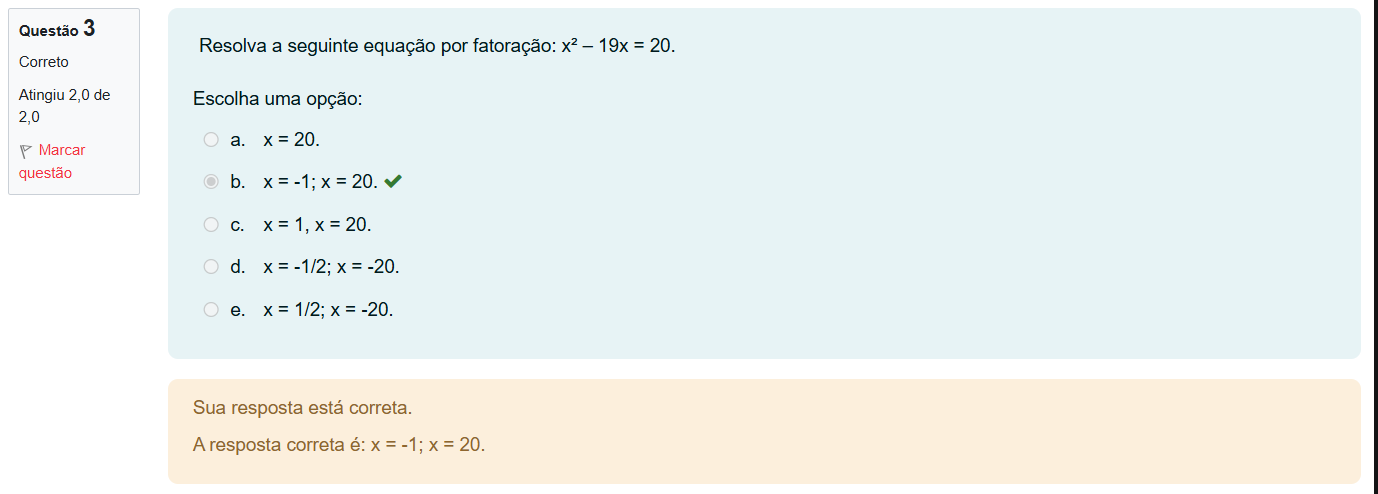 <p>Questão 3 Resolva a seguinte equação por fatoração: - Correto Atingiu 2,0 de Escolha uma opção: 2,0 a. Marcar questão b. C. 20. Sua resposta está correta. A resposta correta X = 20.</p>