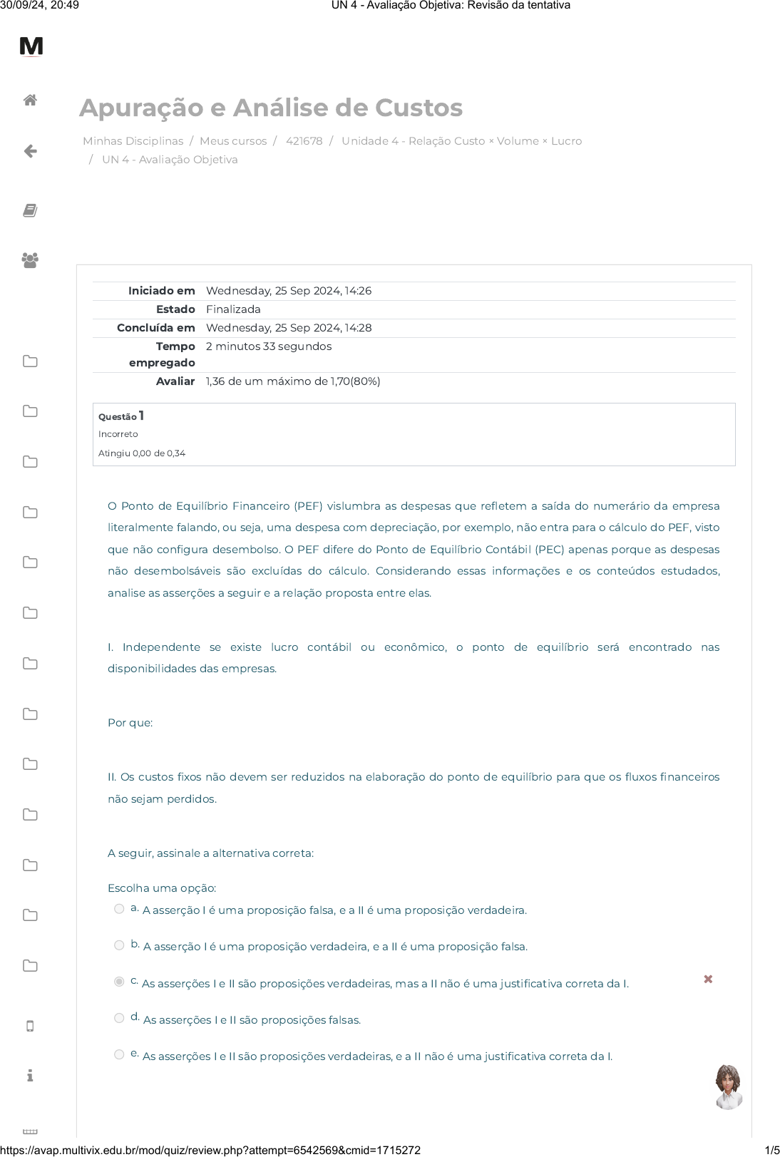 <p>Minhas Disciplinas / Meus cursos / 421678 / Unidade 4 - Relação Custo × Volume × Lucro</p><p>/ UN 4 - Avaliação Objetiva</p><p>Apuração e Análise de Custos</p><p>Iniciado em Wednesday, 25 Sep 2024, 14:26</p><p>Estado Finalizada</p><p>Concluída em Wednesday, 25 Sep 2024, 14:28</p><p>Tempo</p><p>empregado</p><p>2 minutos 33 segundos</p><p>Avaliar 1,36 de um máximo de 1,70(80%)</p><p>Questão 1</p><p>Incorreto</p><p>Atingiu 0,00 de 0,34</p><p>O Ponto de Equilíbrio Financeiro (PEF) vislumbra as despesas que re�etem a saída do numerário da empresa</p><p>literalmente falando, ou seja, uma despesa com depreciação, por exemplo, não entra para o cálculo do PEF, visto</p><p>que não con�gura desembolso. O PEF difere do Ponto de Equilíbrio Contábil (PEC) apenas porque as despesas</p><p>não desembolsáveis são excluídas do cálculo. Considerando essas informações e os conteúdos estudados,</p><p>analise as asserções a seguir e a relação proposta entre elas.</p><p>I. Independente se existe lucro contábil ou econômico, o ponto de equilíbrio será encontrado nas</p><p>disponibilidades das empresas.</p><p>Por que:</p><p>II. Os custos �xos não devem ser reduzidos na elaboração do ponto de equilíbrio para que os �uxos �nanceiros</p><p>não sejam perdidos.</p><p>A seguir, assinale a alternativa correta:</p><p>Escolha uma opção:</p><p>a. A asserção I é uma proposição falsa, e a II é uma proposição verdadeira.</p><p>b. A asserção I é uma proposição verdadeira, e a II é uma proposição falsa.</p><p>c. As asserções I e II são proposições verdadeiras, mas a II não é uma justi�cativa correta da I. </p><p>d. As asserções I e II são proposições falsas.</p><p>e. As asserções I e II são proposições verdadeiras, e a II não é uma justi�cativa correta da I.</p><p></p><p></p><p></p><p></p><p></p><p></p><p></p><p></p><p></p><p></p><p></p><p></p><p></p><p></p><p></p><p></p><p></p><p></p><p></p><p></p><p>30/09/24, 20:49 UN 4 - Avaliação Objetiva: Revisão da tentativa</p><p>https://avap.multivix.edu.br/mod/quiz/review.php?attempt=6542569&cmid=1715272 1/5</p><p>https://avap.multivix.edu.br/my/</p><p>https://avap.multivix.edu.br/course/view.php?id=29335</p><p>https://avap.multivix.edu.br/course/view.php?id=29335§ion=5</p><p>https://avap.multivix.edu.br/mod/quiz/view.php?id=1715272</p><p>https://avap.multivix.edu.br/my/</p><p>https://avap.multivix.edu.br/course/view.php?id=29335</p><p>https://avap.multivix.edu.br/user/index.php?id=29335</p><p>https://avap.multivix.edu.br/course/view.php?id=29335§ion=1</p><p>https://avap.multivix.edu.br/course/view.php?id=29335§ion=2</p><p>https://avap.multivix.edu.br/course/view.php?id=29335§ion=3</p><p>https://avap.multivix.edu.br/course/view.php?id=29335§ion=4</p><p>https://avap.multivix.edu.br/course/view.php?id=29335§ion=5</p><p>https://avap.multivix.edu.br/course/view.php?id=29335§ion=6</p><p>https://avap.multivix.edu.br/course/view.php?id=29335§ion=7</p><p>https://avap.multivix.edu.br/course/view.php?id=29335§ion=8</p><p>https://avap.multivix.edu.br/course/view.php?id=29335§ion=9</p><p>https://avap.multivix.edu.br/course/view.php?id=29335§ion=10</p><p>https://avap.multivix.edu.br/course/view.php?id=29335§ion=11</p><p>https://avap.multivix.edu.br/course/view.php?id=29335§ion=12</p><p>https://avap.multivix.edu.br/course/view.php?id=29335§ion=13</p><p>https://avap.multivix.edu.br/hooks/portal/</p><p>https://avap.multivix.edu.br/mod/page/view.php?id=1252%2F%22%20target%3D%22_blank</p><p>https://avap.multivix.edu.br/calendar/view.php/</p><p>https://avap.multivix.edu.br/</p><p>https://avap.multivix.edu.br/</p><p>https://avap.multivix.edu.br/</p><p>https://avap.multivix.edu.br/</p><p>https://avap.multivix.edu.br/</p><p>https://avap.multivix.edu.br/</p><p>Questão 2</p><p>Correto</p><p>Atingiu 0,34 de 0,34</p><p>De acordo com Martins (2010, p. 196), “no Ponto de Equilíbrio Econômico, receitas menos custos e despesas dão</p><p>como resultado o custo de oportunidade do Capital Próprio empregado.” É uma visão de remuneração</p><p>equivalente àquela que um investidor teria se tivesse aplicado o capital no mercado.</p><p>MARTINS, E. Contabilidade de custos. 9. ed. São Paulo: Atlas, 2003, p. 196.</p><p>A partir dessas informações e do conteúdo estudado a respeito do Ponto de Equilíbrio Econômico (PEE), pode-se</p><p>a�rmar que, em relação aos Pontos de Equilíbrio Contábil (PEC) e Financeiro (PEF), o PEE é mais:</p><p>Escolha uma opção:</p><p>a. Complexo, já que depende de informações externas da empresa.</p><p>b. Complexo, porque inclui uma correção monetária. </p><p>c. Simples, porque inclui uma correção monetária.</p><p>d. Fácil, pois não precisa calcular a margem de segurança.</p><p>e. Complexo, visto que con�gura desembolso �nanceiro da empresa.</p><p></p><p></p><p></p><p></p><p></p><p></p><p></p><p></p><p></p><p></p><p></p><p></p><p></p><p></p><p></p><p></p><p></p><p></p><p></p><p></p><p>30/09/24, 20:49 UN 4 - Avaliação Objetiva: Revisão da tentativa</p><p>https://avap.multivix.edu.br/mod/quiz/review.php?attempt=6542569&cmid=1715272 2/5</p><p>https://avap.multivix.edu.br/my/</p><p>https://avap.multivix.edu.br/course/view.php?id=29335</p><p>https://avap.multivix.edu.br/user/index.php?id=29335</p><p>https://avap.multivix.edu.br/course/view.php?id=29335§ion=1</p><p>https://avap.multivix.edu.br/course/view.php?id=29335§ion=2</p><p>https://avap.multivix.edu.br/course/view.php?id=29335§ion=3</p><p>https://avap.multivix.edu.br/course/view.php?id=29335§ion=4</p><p>https://avap.multivix.edu.br/course/view.php?id=29335§ion=5</p><p>https://avap.multivix.edu.br/course/view.php?id=29335§ion=6</p><p>https://avap.multivix.edu.br/course/view.php?id=29335§ion=7</p><p>https://avap.multivix.edu.br/course/view.php?id=29335§ion=8</p><p>https://avap.multivix.edu.br/course/view.php?id=29335§ion=9</p><p>https://avap.multivix.edu.br/course/view.php?id=29335§ion