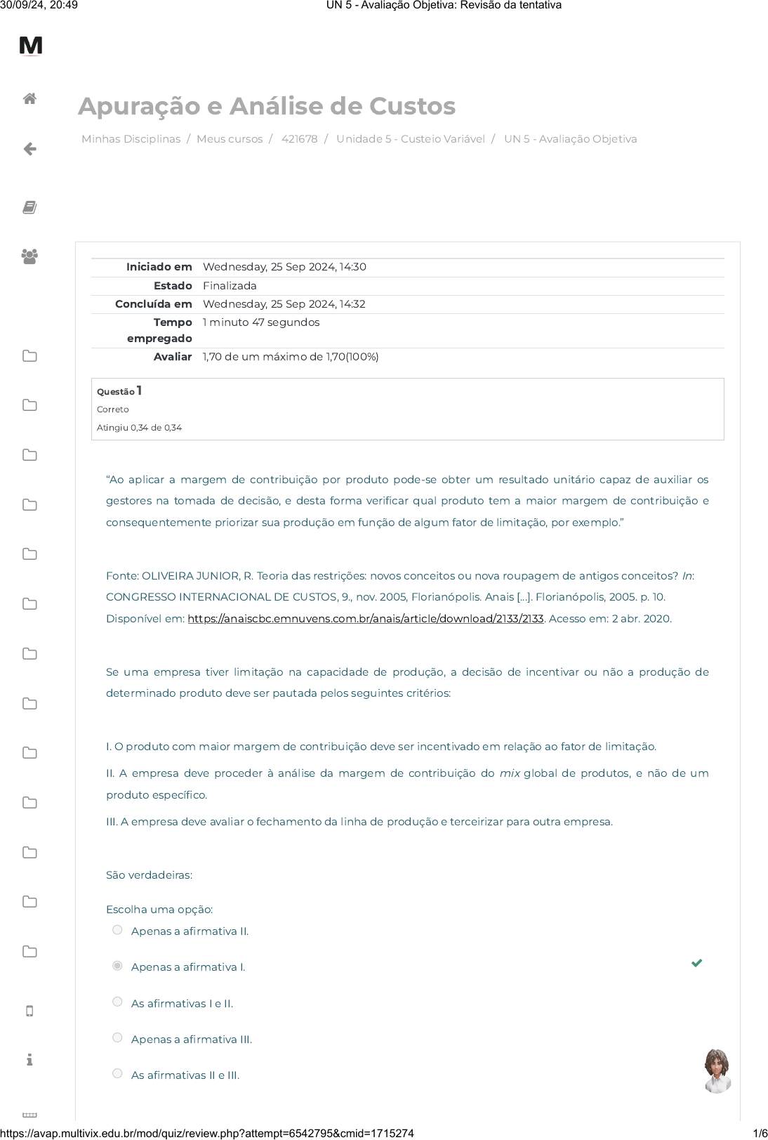 <p>Minhas Disciplinas / Meus cursos / 421678 / Unidade 5 - Custeio Variável / UN 5 - Avaliação Objetiva</p><p>Apuração e Análise de Custos</p><p>Iniciado em Wednesday, 25 Sep 2024, 14:30</p><p>Estado Finalizada</p><p>Concluída em Wednesday, 25 Sep 2024, 14:32</p><p>Tempo</p><p>empregado</p><p>1 minuto 47 segundos</p><p>Avaliar 1,70 de um máximo de 1,70(100%)</p><p>Questão 1</p><p>Correto</p><p>Atingiu 0,34 de 0,34</p><p>“Ao aplicar a margem de contribuição por produto pode-se obter um resultado unitário capaz de auxiliar os</p><p>gestores na tomada de decisão, e desta forma veri�car qual produto tem a maior margem de contribuição e</p><p>consequentemente priorizar sua produção em função de algum fator de limitação, por exemplo.”</p><p>Fonte: OLIVEIRA JUNIOR, R. Teoria das restrições: novos conceitos ou nova roupagem de antigos conceitos? In:</p><p>CONGRESSO INTERNACIONAL DE CUSTOS, 9., nov. 2005, Florianópolis. Anais [...]. Florianópolis, 2005. p. 10.</p><p>Disponível em: https://anaiscbc.emnuvens.com.br/anais/article/download/2133/2133. Acesso em: 2 abr. 2020.</p><p>Se uma empresa tiver limitação na capacidade de produção, a decisão de incentivar ou não a produção de</p><p>determinado produto deve ser pautada pelos seguintes critérios:</p><p>I. O produto com maior margem de contribuição deve ser incentivado em relação ao fator de limitação.</p><p>II. A empresa deve proceder à análise da margem de contribuição do mix global de produtos, e não de um</p><p>produto especí�co.</p><p>III. A empresa deve avaliar o fechamento da linha de produção e terceirizar para outra empresa.</p><p>São verdadeiras:</p><p>Escolha uma opção:</p><p>Apenas a a�rmativa II.</p><p>Apenas a a�rmativa I. </p><p>As a�rmativas I e II.</p><p>Apenas a a�rmativa III.</p><p>As a�rmativas II e III.</p><p></p><p></p><p></p><p></p><p></p><p></p><p></p><p></p><p></p><p></p><p></p><p></p><p></p><p></p><p></p><p></p><p></p><p></p><p></p><p></p><p>30/09/24, 20:49 UN 5 - Avaliação Objetiva: Revisão da tentativa</p><p>https://avap.multivix.edu.br/mod/quiz/review.php?attempt=6542795&cmid=1715274 1/6</p><p>https://avap.multivix.edu.br/my/</p><p>https://avap.multivix.edu.br/course/view.php?id=29335</p><p>https://avap.multivix.edu.br/course/view.php?id=29335§ion=6</p><p>https://avap.multivix.edu.br/mod/quiz/view.php?id=1715274</p><p>https://anaiscbc.emnuvens.com.br/anais/article/download/2133/2133</p><p>https://avap.multivix.edu.br/my/</p><p>https://avap.multivix.edu.br/course/view.php?id=29335</p><p>https://avap.multivix.edu.br/user/index.php?id=29335</p><p>https://avap.multivix.edu.br/course/view.php?id=29335§ion=1</p><p>https://avap.multivix.edu.br/course/view.php?id=29335§ion=2</p><p>https://avap.multivix.edu.br/course/view.php?id=29335§ion=3</p><p>https://avap.multivix.edu.br/course/view.php?id=29335§ion=4</p><p>https://avap.multivix.edu.br/course/view.php?id=29335§ion=5</p><p>https://avap.multivix.edu.br/course/view.php?id=29335§ion=6</p><p>https://avap.multivix.edu.br/course/view.php?id=29335§ion=7</p><p>https://avap.multivix.edu.br/course/view.php?id=29335§ion=8</p><p>https://avap.multivix.edu.br/course/view.php?id=29335§ion=9</p><p>https://avap.multivix.edu.br/course/view.php?id=29335§ion=10</p><p>https://avap.multivix.edu.br/course/view.php?id=29335§ion=11</p><p>https://avap.multivix.edu.br/course/view.php?id=29335§ion=12</p><p>https://avap.multivix.edu.br/course/view.php?id=29335§ion=13</p><p>https://avap.multivix.edu.br/hooks/portal/</p><p>https://avap.multivix.edu.br/mod/page/view.php?id=1252%2F%22%20target%3D%22_blank</p><p>https://avap.multivix.edu.br/calendar/view.php/</p><p>https://avap.multivix.edu.br/</p><p>https://avap.multivix.edu.br/</p><p>https://avap.multivix.edu.br/</p><p>https://avap.multivix.edu.br/</p><p>https://avap.multivix.edu.br/</p><p>https://avap.multivix.edu.br/</p><p>https://avap.multivix.edu.br/</p><p>Questão 2</p><p>Correto</p><p>Atingiu 0,34 de 0,34</p><p>Leia o trecho a seguir:</p><p>“[...] [No] sistema de custeio os custos são separados em �xos e variáveis, sendo considerados na avaliação de</p><p>estoques os custos variáveis, com os custos �xos lançados no resultado. Trata-se de um método que tem</p><p>inúmeras virtudes, principalmente no plano gerencial, por permitir uma melhor análise do desempenho da</p><p>empresa, sendo um método gerencial, não considerado pela legislação tributária brasileira, sendo aceito</p><p>somente o método do custo real ou absorção.”</p><p>Fonte: CRUZ, J. A. W. et al. A classi�cação dos custos �xos e variáveis por meio de regressão múltipla: estudo de</p><p>caso em uma cooperativa de catadores de materiais recicláveis de Curitiba – PR. Pensar Contábil, Rio de Janeiro,</p><p>v. 13, n. 50, jan./abr. 2011, p. 6. Disponível</p><p>em: http://webserver.crcrj.org.br/asscom/Pensarcontabil/revistaspdf/revista50.pdf. Acesso em: 12 mar. 2020.</p><p>O custeio por absorção consiste na apropriação de todos os custos – sejam eles �xos ou variáveis – à produção do</p><p>período, cujos gastos não fabris são excluídos. Considerando essas informações e o conteúdo estudado, enumere</p><p>de 1 a 5 o esquema básico do custeio por absorção:</p><p>( ) Apuração do resultado</p><p>( ) Apropriação dos custos diretos e indiretos na produção realizada no período</p><p>( ) Apuração do custo dos produtos vendidos</p><p>( ) Separação de custos e despesas</p><p>( ) Apuração do custo da produção acabada</p><p>Agora, assinale a alternativa que apresenta a sequência correta:</p><p>Escolha uma opção:</p><p>3, 1, 5, 2, 4.</p><p>1, 5, 3, 4, 2.</p><p>3, 1, 2, 5, 4.</p><p>5, 2, 4, 1, 3. </p><p>2, 4, 1, 3, 5.</p><p></p><p></p><p></p><p></p><p></p><p></p><p></p><p></p><p></p><p></p><p></p><p></p><p></p><p></p><p></p><p></p><p></p><p></p><p></p><p></p><p>30/09/24, 20:49 UN 5 - Avaliação Objetiva: Revisão da tentativa</p><p>https://avap.mult