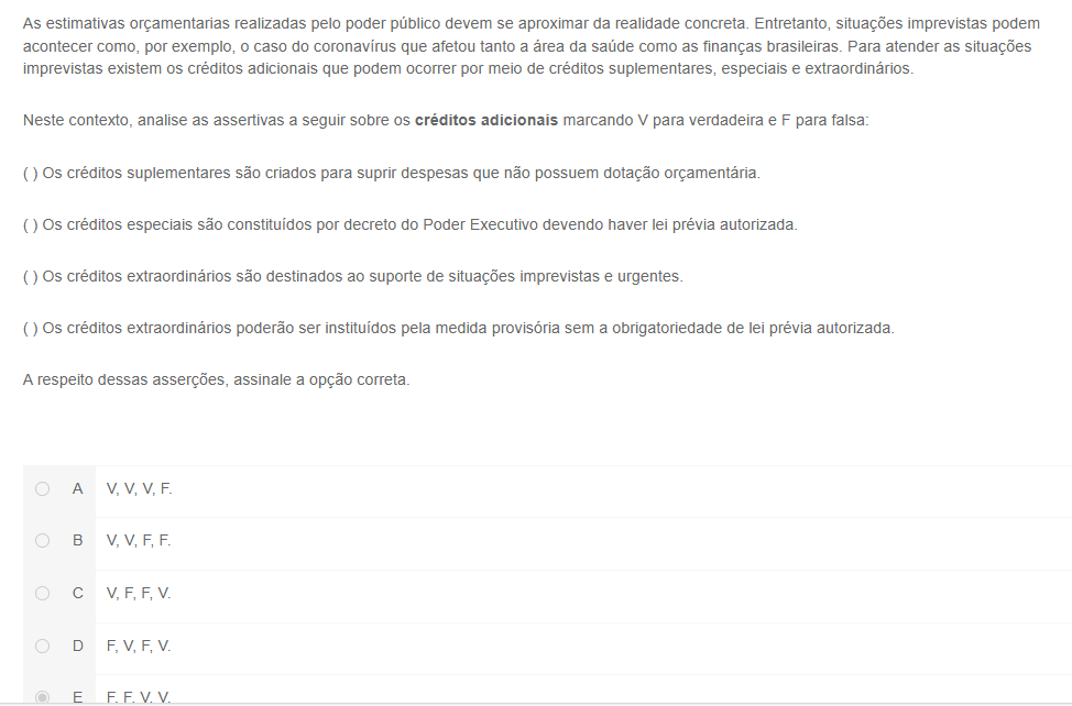 <p>As estimativas orçamentarias realizadas pelo poder público devem se aproximar da realidade concreta. Entretanto, situações imprevistas podem acontecer como, por exemplo, caso do coronavírus que afetou tanto a área da saúde como as finanças brasileiras. Para atender as situações imprevistas existem os créditos adicionais que podem ocorrer por meio de créditos suplementares, especiais e Neste contexto, analise as assertivas a seguir sobre os créditos adicionais marcando V para verdadeira e F para falsa: Os créditos suplementares são criados para suprir despesas que não possuem dotação Os créditos especiais são constituídos por decreto do Poder Executivo devendo haver lei prévia Os créditos extraordinários são destinados ao suporte de situações imprevistas e Os créditos extraordinários poderão ser pela medida provisória sem a obrigatoriedade de lei prévia autorizada. A respeito dessas asserções, assinale a opção correta. A B C V, D F. V. F. V. E F.F.V.V.</p>
