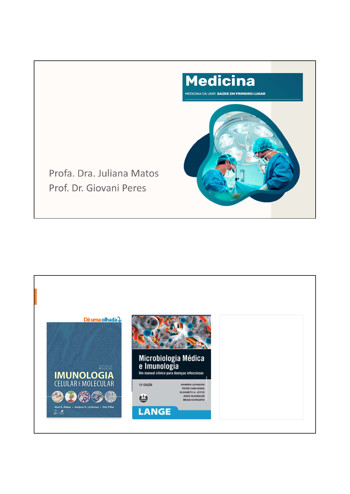 <p>16/09/2024</p><p>Imunologia</p><p>Bases da Imunologia</p><p>Bibliografia Básica</p><p>• Abbas, Abul K et al.</p><p>Imunologia Celular e</p><p>Molecular, (9ª edição).</p><p>Guanabara Koogan, 2019.</p><p>• Levinson, Warren et al.</p><p>Microbiologia Médica e</p><p>Imunologia. Disponível em:</p><p>Minha Biblioteca, (15ª</p><p>edição). Mc Graw Hill,</p><p>2022.</p><p>1</p><p>2</p><p>16/09/2024</p><p>Bibliografia Complementar</p><p>• Abbas, Abul K et al.</p><p>Imunologia Básica –</p><p>Funções e Distúrbios do</p><p>Sistema Imunológico (6ª</p><p>edição). Guanabara</p><p>Koogan, 2021.</p><p>• Murphy, Kenneth.</p><p>Imunobiologia de Janeway.</p><p>Disponível em: Minha</p><p>Biblioteca, (8ª edição).</p><p>Artmed, 2014.</p><p>Ponderações</p><p>• O termo imunidade é derivado da palavra latina immunitas, que se refere à proteção</p><p>contra processos legais que os senadores romanos tinham durante o seu mandato.</p><p>• A imunidade compreende uma série de reações a substâncias estranhas, incluindo</p><p>microrganismos e macromoléculas como proteínas e polissacarídeos, e as pequenas</p><p>substâncias químicas que são reconhecidas como elementos estranhos,</p><p>independentemente das consequências fisiológicas ou patológicas de tal reação.</p><p>• A imunologia é o estudo dos eventos celulares e moleculares que ocorrem depois que</p><p>o organismo encontra microorganismos e outras moléculas macromoléculas</p><p>estranhas.</p><p>• As células e moléculas responsáveis pela imunidade formam o sistema imunológico, e</p><p>a sua resposta coletiva e coordenada após o reconhecimento de elementos estranhos</p><p>é chamada de resposta imunológica</p><p>3</p><p>4</p><p>16/09/2024</p><p>Imunologia</p><p>• Ciência que estuda o sistema imune: suas células e</p><p>órgãos, sua fisiologia e patologia e suas reações</p><p>com os demais sistemas orgânicos.</p><p>5</p><p>6</p><p>16/09/2024</p><p>Visão geral de patógenos</p><p>Bactérias Vírus Fungos Parasitas</p><p>Patógenos</p><p>Vírus</p><p>Bactérias</p><p>Imunidade Inata</p><p>Patógenos</p><p>Agentes</p><p>causadores</p><p>de doenças</p><p>Sistema Imune</p><p>Imunidade Adaptativa</p><p>Antígenos</p><p>Elementos</p><p>capazes de</p><p>desencadear</p><p>resposta</p><p>inflamatória</p><p>Inflamação</p><p>Resposta a dano</p><p>tecidual</p><p>Visão Geral</p><p>Imunidade Inata</p><p>- Não específica</p><p>- Rápida</p><p>Imunidade</p><p>Adaptativa</p><p>- Específica</p><p>- Lenta</p><p>- Sistêmica</p><p>- Memória</p><p>Barreira química</p><p>Células epiteliais</p><p>Quimiocinas</p><p>Fagócitos</p><p>Barreira</p><p>química</p><p>BLOQUEIA</p><p>Barreira</p><p>física</p><p>BLOQUEIA</p><p>Superfície ligeiramente acídica</p><p>Peptídeos microbicidas</p><p>Enzimas</p><p>Muco</p><p>Formam uma barreira física</p><p>protetora</p><p>Liberadas por células</p><p>lesionadas</p><p>Sinais quimioatrativos para</p><p>células da resposta</p><p>inflamatória</p><p>Internalização de</p><p>elementos extracelulares para</p><p>degradação</p><p>Dano</p><p>EritrócitoNeutrófilo</p><p>Monócito</p><p>Macrófago</p><p>Fagocitose</p><p>Sinais da resposta inflamatória</p><p>Calor, rubor, tumor, dor, perda de função</p><p>Mediada por células</p><p>Humoral</p><p>Anticorpos</p><p>Plasmócito</p><p>Tecido linfoide</p><p>Vaso sanguíneo</p><p>Célula infectada</p><p>Receptor</p><p>Célula T citotóxica</p><p>Célula T auxiliar</p><p>Indução</p><p>de</p><p>Morte</p><p>Sinal de infecção</p><p>Sinais de ativação</p><p>7</p><p>8</p><p>16/09/2024</p><p>Resposta Imune Inata e Adaptativa</p><p>Alta especificidade para</p><p>antígenos</p><p>Maior intensidade e mais rápida em casos</p><p>de reinfecção</p><p>Inicialmente resposta mais lenta (dias):</p><p>células precisam se proliferar em órgãos</p><p>linfoides secundários</p><p>Resposta Imune Inata</p><p>Especificidade limitada, reconhecimento</p><p>de padrões moleculares associados a</p><p>patógenos (PAMPs)</p><p>Mesma intensidade</p><p>Resposta rápida (minutos a horas): células</p><p>já estão nos tecidos e são recrutadas a partir</p><p>da circulação</p><p>Resposta Imune Adaptativa</p><p>9</p><p>10</p><p>16/09/2024</p><p>CARACTERÍSTICAS</p><p>CARACTERÍSTICAS</p><p>11</p><p>12</p><p>16/09/2024</p><p>CARACTERÍSTICAS</p><p>CARACTERÍSTICAS</p><p>13</p><p>14</p><p>16/09/2024</p><p>CARACTERÍSTICAS</p><p>CARACTERÍSTICAS</p><p>15</p><p>16</p><p>16/09/2024</p><p>CARACTERÍSTICAS</p><p>CARACTERÍSTICAS</p><p>17</p><p>18</p><p>16/09/2024</p><p>Reconhecendo o inimigo</p><p>O sistema imune ataca patógenos</p><p>nocivos.</p><p>Ele não ataca nossos próprios</p><p>componentes, microbiota comensal,</p><p>antígenos alimentares, etc.</p><p>Receptores de reconhecimento de padrões</p><p>Pathogen-associated</p><p>molecular pattern</p><p>(PAMP)</p><p>Pathogen</p><p>Pattern recognition</p><p>receptor</p><p>(PRR)</p><p>19</p><p>20</p><p>16/09/2024</p><p>Receptores de reconhecimento de padrões</p><p>Damaged</p><p>tissue</p><p>Damage-associated</p><p>molecular pattern</p><p>(DAMP)</p><p>Pattern recognition</p><p>receptor</p><p>(PRR)</p><p>Receptores de reconhecimento de padrões</p><p>Damaged</p><p>tissue</p><p>Damage-associated</p><p>molecular pattern</p><p>(DAMP)</p><p>Pattern recognition</p><p>receptor</p><p>(PRR)</p><p>21</p><p>22</p><p>16/09/2024</p><p>Receptores de antígenos específicos</p><p>ELEMENTOS DO SISTEMA IMUNE</p><p>Existem muitos elementos no sistema imune:</p><p>- elementos celulares x elementos humorais</p><p>23</p><p>24</p><p>16/09/2024</p><p>CÉLULAS DO SISTEMA IMUNE</p><p>CÉLULAS DO SISTEMA IMUNE</p><p>Órgãos Geradores ou Órgãos Primários</p><p>(medula óssea e timo)</p><p>MATURIDADE FUNCIONAL</p><p>Órgãos Periféricos ou Órgãos Secundários</p><p>(linfonodos, baço e componentes do sistema</p><p>imune de mucosa)</p><p>RESPOSTA IMUNÓLOGICA</p><p>X</p><p>25</p><p>26</p><p>16/09/2024</p><p>CÉLULAS DO SISTEMA 