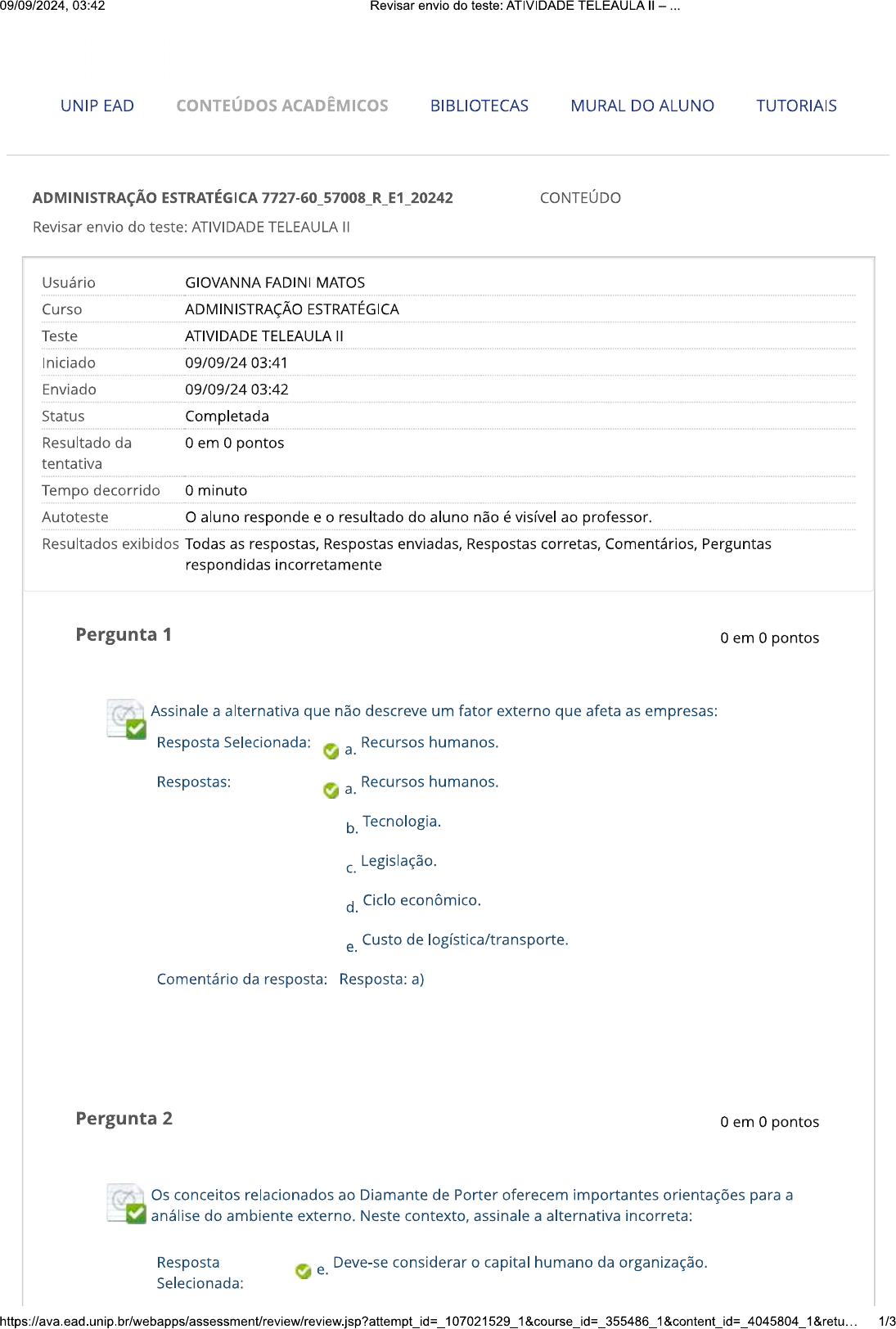 <p>09/09/2024, 03:42 Revisar envio do teste: ATIVIDADE TELEAULA - UNIP EAD CONTEÚDOS ACADÊMICOS BIBLIOTECAS MURAL DO ALUNO TUTORIAIS ADMINISTRAÇÃO ESTRATÉGICA 7727-60_57008_R_E1_20242 CONTEÚDO Revisar envio do teste: ATIVIDADE TELEAULA II Usuário GIOVANNA FADINI MATOS Curso ADMINISTRAÇÃO ESTRATÉGICA Teste ATIVIDADE TELEAULA Iniciado 09/09/24 03:41 Enviado 09/09/24 03:42 Status Completada Resultado da 0 em 0 pontos tentativa Tempo decorrido 0 minuto Autoteste aluno responde e o resultado do aluno não é visível ao professor. Resultados exibidos Todas as respostas, Respostas enviadas, Respostas corretas, Comentários, Perguntas respondidas incorretamente Pergunta 1 0 em 0 pontos Assinale a alternativa que não descreve um fator externo que afeta as empresas: Resposta Selecionada: Recursos humanos. a. Respostas: a. Recursos humanos. b. Tecnologia. C. Legislação. Ciclo econômico. d. Custo de logística/transporte. e. Comentário da resposta: Resposta: a) Pergunta 2 0 em 0 pontos Os conceitos relacionados ao Diamante de Porter oferecem importantes orientações para a análise do ambiente externo. Neste contexto, assinale a alternativa incorreta: Resposta Deve-se considerar o capital humano da organização. e. Selecionada: 1/3</p><p>09/09/2024, 03:42 Revisar envio do teste: ATIVIDADE TELEAULA Respostas: a. Deve-se considerar as características específicas do país. Deve-se considerar as características da demanda. b. C. Deve-se considerar as características das indústrias relacionadas e de suporte, ou seja, a cadeia de suprimentos. d. Deve-se considerar a estratégia, estrutura e rivalidade entre os concorrentes. Deve-se considerar o capital humano da organização. e. Comentário da resposta: Resposta: e) Pergunta 3 0 em 0 pontos Em um contexto de análise do ambiente interno podemos afirmar que: Resposta C. Selecionada: Os recursos humanos, ou o capital humano, podem oferecer grande vantagem competitiva para uma empresa; deve-se considerar na análise do ambiente interno. Respostas: a. Os recursos humanos, geralmente, não devem ser considerados na análise do ambiente interno e sim na análise do ambiente externo. b. Processo produtivo e desempenho operacional não devem ser considerados na análise do ambiente interno. C. Os recursos humanos, ou o capital humano, podem oferecer grande vantagem competitiva para uma empresa; deve-se considerar na análise do ambiente interno d. A rentabilidade não deve ser considerada na análise do ambiente interno. e. As características da demanda (clientes) é um importante fator do ambiente interno. Comentário da resposta: Resposta: c) Pergunta 4 0 em 0 pontos</p><p>09/09/2024, 03:42 Revisar envio do teste: ATIVIDADE TELEAULA - ... Assinale a alternativa correta que melhor descreve os principais fatores (motivos) que permitem que as empresas permaneçam vivas no mercado por longos períodos: Resposta b. Selecionada: São fundamentais para a longevidade das empresas: adaptabilidade, resiliência e inovação. Respostas: a. O fato de ter um faturamento constante e uma boa carteira de clientes. b. São fundamentais para a longevidade das empresas: adaptabilidade, resiliência e inovação. C. São fundamentais para a perpetuidade das empresas: flexibilidade e recursos. d. O fato de ter bons profissionais na área comercial. e. São fundamentais para a continuidade nos negócios: retorno do patrimônio líquido. Comentário da resposta: Resposta: b) Segunda-feira, 9 de Setembro de 2024 03h42min04s GMT-03:00 OK</p>