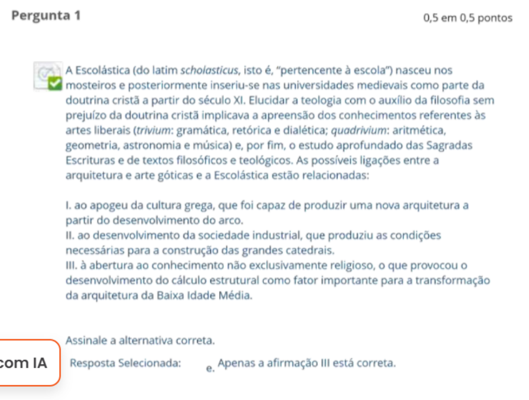 <p>Pergunta 1 0,5 em 0,5 pontos A Escolástica (do latim scholasticus, isto é, "pertencente à escola") nasceu nos mosteiros e posteriormente inseriu-se nas universidades medievais como parte da doutrina cristã a partir do século XI. Elucidar a teologia com auxílio da filosofia sem prejuízo da doutrina implicava a apreensão dos conhecimentos referentes às artes liberais (trivium: gramática, retórica e dialética; quadrivium: aritmética, geometria, astronomia e música) e, por fim, o estudo aprofundado das Sagradas Escrituras e de textos filosóficos e As possíveis ligações entre a arquitetura e arte góticas e a Escolástica estão relacionadas: I. ao apogeu da cultura grega, que foi capaz de produzir uma nova arquitetura a partir do desenvolvimento do arco. II. ao desenvolvimento da sociedade industrial, que produziu as condições necessárias para a construção das grandes catedrais. III. à abertura ao conhecimento não exclusivamente religioso, o que provocou o desenvolvimento do cálculo estrutural como fator importante para a transformação da arquitetura da Baixa Idade Média. Assinale a alternativa correta. com IA Resposta Selecionada: e. Apenas a afirmação III está correta.</p><p>Resposta Selecionada: e. Apenas a a está correta.</p><p>0,5 em pontos "[...] é preciso notar o caráter espontâneo, despreocupado e in nitamente variável da construção e do urbanismo; este caráter depende da escassez dos meios, da raridade dos técnicos especialistas, da falta de uma cultura artística organizada, da urgência das necessidades de defesa e de sobrevivência, mas também de um novo espírito de liberdade e de con ança. As novas instalações se adaptam com segurança ao ambiente natural e entre as ruínas do ambiente construído antigo, não respeitam nenhuma regra preconcebida, seguem com indiferença as formas regulares dos artefatos romanos; en m, apagam toda diferença entre natureza e geometria" (BENEVOLO, L. A história da São Paulo: Perspectiva, 2001. p. 254). Pode-se a rmar que a situação descrita: I. corresponde especi camente à polis grega, inclusive no que diz respeito à técnicaconstrutiva e sistema de controle. II. diz respeito à urbe romana e, por extensão, à maioria das cidades colonizadaspelos romanos. III. se refere à retomada da organização urbana característica da Idade Média. Assinale a alternativa correta.</p><p>Pergunta 9 0,5 em 0,5 pontos "Bizâncio herdou a arte do mundo - quase todos os artistas individuais foram gregos - e associou-lhe o gênio estrutural e a aptidão para a engenharia de Roma. E também não podia escapar nem à cor nem ao misticismo do Oriente. Tudo isso Bizâncio explorou para a glória da Igreja, que desejava demonstrar, quer na liturgia quer na arquitetura, que os ensinamentos de Jesus haviam sido transmutados numa instituição que era imperial, poderosa, hierárquica, sacerdotal e divina. O resultado foi uma das maiores arquiteturas da história" (JORDAN, R. História da Arquitectura no Ocidente. Camarate: Verbo, 1985, p. 72). Sobre a arquitetura bizantina, é possível a rmar: I. segue o esquema estrutural da stoa clássica. II. tem como característica o espaço centralizado. III. segue o esquema nave central e naves laterais comum à arquitetura românica. Assinale a alternativa correta. Resposta Selecionada: Apenas a a rmação está correta.</p><p>Pergunta 8 0,5 em 0,5 pontos "A regularidade em grande escala das cidades helenísticas e romanas é abandonada e não existe ao menos uma administração municipal para As ruas são estreitas e formam um labirinto de passagens tortuosas - muitas vezes cobertas - que levam às portas das casas, mas não permitem uma orientação de conjunto do bairro. Também as lojas dos comerciantes não são agrupadas em uma praça, mas são alinhadas em uma ou mais ruas, cobertas ou descobertas, formando bazar" (BENEVOLO, L. A história da cidade. São Paulo: Perspectiva, 2001. p. 226). O texto se refere especi camente: I. à polis grega, inclusive no que diz respeito à técnica construtiva e sistema decontrole. II. à con guração característica da cidade islâmica. III. à organização urbana característica da Idade Média. Assinale a alternativa correta: Resposta Selecionada: Apenas a a rmação II está correta.</p><p>Pergunta 7 0,5 em 0,5 pontos cidade)... depende do campo para o abastecimento de víveres, e controla de fato um território mais ou menos grande; mas, diferentemente da cidade grega, não concede paridade de direitos aos habitantes dos campos. Permanece uma cidade fechada: suas relações econômicas e políticas podem ser estendidas à escala nacional ou mundial, mas sua política permanece guiada pelos interesses restritos da população urbana" (BENEVOLO, L.A história da São Paulo: Perspectiva, 2001. p. 260). texto se refere: I. à con guração das bastides medievais. estrutura da cidade-estado medieval.III. à cidade monástica medieval. Assinale a alternativa correta. Resposta Selecionada: c. Apenas a a está correta.</p><p>Pergunta 6 0,5 em 0,5 pontos Sabe-se que o Românico é o primeiro estilo arquitetônico do ocidente, principalmente por constituir uma unidade tridimensional que se tornou o modelo construtivo para a disseminação da fé por toda a Europa. Pode-se a rmar que seu sistema estrutural característico inclui: a adoção da massa ativa. cúpula como solução para a cobertura.III. a presença de contrafortes e abóbadas. Assinale a alternativa correta. Resposta Selecionada: b. As a rmações e III estão corretas.</p><p>Pergunta 5 0,5 em 0,5 pontos princípio tipológico da maior parte das igrejas cristãs ocidentais, a basílica tem sua origem na romana. As diferenças se resumem à escala e à orientação, que no caso cristão desloca acesso para o lado menor do retângulo da planta e estabelece como diretriz um eixo longitudinal. Pode-se a rmar que tipo basilical cristão implica: nave central e naves laterais. II