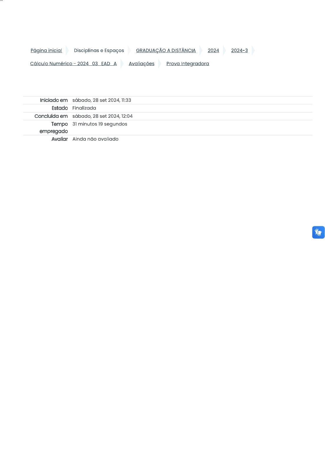 <p>Página inicial Disciplinas e Espaços GRADUAÇÃO A DISTÂNCIA 2024 2024-3 Cálculo Numérico - 2024 03 EAD_A Avaliações Prova Integradora Iniciado em sábado, 28 set 2024, 11:33 Estado Finalizada Concluída em sábado, 28 set 2024, 12:04 Tempo 31 minutos 19 segundos empregado Ainda não avaliado</p><p>Questão 1 Correto Atingiu 1,00 de 1,00 Qual dos seguintes sistemas de equações lineares satisfaz ao critério das linhas sem que haja troca de linhas ? Escolha uma opção: x+y-5z=-13 6x-2y+3z=1 -2x+7y+2z=15 a. 12x+7y+3z=22 x+5y+z=7 b. x-8y-2z=1 x+y+5z=4 3x-y+z=-2 C. 9x+5y-3z=12 2x-4y+7z=-15 d. 2x+7y+z=19 e. x-3y+12z=31 Sua resposta está correta. 12x+7y+3z=22 x+5y+z=7 2x+7y-11z=-2 (V) (V) sistema satizfaz ao critério das linhas 12x+7y+3z=22 x+5y+z=7 A resposta correta é: 2x+7y-11z= -2</p><p>Questão 2 Correto Atingiu 1,00 de 1,00 No método da Bisseção é possível precisar, quantas iterações terão executadas para alcançar a precisão desejada. Dado o intervalo ; 2] que contém a única raiz da função f(x) - 3 pelo método da Bisseção, número (n=1,2,3...) mínimo de iterações necessárias para com precisão de In(2) log(2) n> 10,96 11 In(2) A resposta correta é: 11</p><p>Questão 3 Incorreto Atingiu 0,00 de 1,00 No laboratório de Física, um experimento gerou os dados que foram tabulados. X 0 1 3 y 1 3 55 Complete a tabela abaixo usando método das diferenças divididas de Newton. X Ordem Zero Ordem1 Ordem2 (Fi) (Si) = = = 55 Fórmula simplificada. Fórmula: Ordem 1 Ordem 0 Odem 2 Ordem 3 = O polinómio interpolador da Newton pelo método da diferença dividida para 3 pontos dados é da forma a alternativa correta que apresenta valor P2 (1,2). Escolha uma opção: a. 26. b. 16. C. 32. d. x e. 36. Sua resposta está incorreta. X Ordem Zero Ordem1 Ordem2 (Fi) (Si) =1 = 2 S =8</p><p>= - - = A resposta correta é: 36.</p><p>Questão 4 Correto Atingiu 1,00 de 1,00 Aplicando o método de Gauss - Seidel ao sistema -0.2x, = 7.85 = 71.4 Analise as seguintes afirmações. - sistema é convergente pois, satisfaz ao critério das linhas. II- As equações de iterações são dadas a seguir 1 ) 10 III - Sendo (0,0,0), na usando 6 casas decimais, o valor de é 2,794524. itens acima podemos afirmar (corretamente) que: Escolha uma opção: a. Todos os itens estão corretos. b. Apenas o item III está correto. C. Apenas o item está correto. d. Apenas os itens I e III estão corretos. e. Apenas os itens e estão corretos. Sua resposta está correta. Apenas os itens e estão corretos. ) 10 = = = -2.794524</p><p>A resposta correta é: Apenas os itens lell estão corretos.</p><p>Questão 5 Correto Atingiu 1,00 de 1,00 Seja Em relação ao sistema linear dado, assinale V para a opção que satisfaz ao algoritmo de resolução do sistema dado pelo método de pivotamento parcial de Gauss e assinale F para a opção que não satisfaz ao algoritmo de resolução do sistema dado pelo método de pivotamento parcial de Gauss. a) Neste caso, efetua-se a troca da linha 1 com a linha 2 e o multiplicador = 2/7. ( ) b) Não há necessidade de troca de linhas para resolver o sistema por esse método. ( ) c) Neste caso, efetua -se a troca da linha 1 com a linha 3 e pivô =2. d) A solução do sistema é {(1,1,1)}. e) Como o pivô é zero, esse sistema não pode ser resolvido pelo método do pivotamento parcial. Escolha uma opção: b. V, V, F, F, F. C. V, F, F, V, F. d. V, V, V, F, F. Sua resposta está correta. 0x+2y+5z=7 7x+y-2z=6 2x+3y+8z=13 Mudar L2 com L1 71-26 2 3 8 13 b)(F) Há necessidade de troca de linha pois, o c)(F) pivô nesta técnica, deve ser maior elemento em módulo da coluna pivotal e 2</p><p>e) (F). Para resolver esse sistema pelo referido método, basta fazer uma troca de linha 2 com a linha 1. A resposta correta é: V, F, F.</p><p>Questão 6 Correto Atingiu 1,00 de 1,00 Seja f(x) = - - 2 + 4x, x>0. Por meio de um software foram efetuadas as iterações pelo método de Newton-Raphson. Na tabela abaixo não consta valor da raiz da equação f(x)=0 e do erro relativo percentual dado por n % de erro 1 =1.3 4,5118 7.8462 2 =0.725 -0,7083 ?????? 3 X2 =0,79 -0,019 10,3294 0,23 4 0 10,3147 0 a opção que apresenta valor correto da raiz (com 4 casas decimais) e do erro relativo (com 2 casas decimais) nesta ordem. Escolha uma opção: a. 0,718 e 0,25% b. 0,79 e 5,71%. C. 0,7918 e 8,23% d. 0,7918 e 6,25% e. 0,8 e 0,578%. Sua resposta está correta. Raiz de 10,3294 Erro relativo 0,79 100% = 8,23% 0,79 Raiz de 0,7918 10,3294 Erro relativo 100% 0,79-0,725 8,23% = 0,79</p><p>A resposta correta é: 0,7918 e Questão 7 Completo Vale 3,00 ponto(s). Considere a função real de variável real definida por a) Verifique se a função dada possui raiz no intervalo [2,3]. b) Qual número mínimo de iterações necessárias para calcular a raiz da referida função no intervalo [2,3], utilizando método da Bisseção com tolerância de e = 0,01? c). Faça uma iteração usando método da Bissecção. Respostas no anexo abaixo. Calc Num Q07.pdf a) f(2).f(3)7 1=[2,3] 2+3 2 f(2)=-2,611 f(2,5).f(3)</p><p>Questão 8 Completo Vale 3,00 ponto(s). A velocidade V de um carro de corrida durante um intervalo de 20 segundos encontra-se registrado na tabela abaixo. 0 5 10 15 20 V(m/s) 0 29,3 51,3 66,0 73,3 A distância S é dada Use a do trapézio para estimar a distância S (m) que o carro percorreu durante os 20 segundos. Respostas no anexo abaixo. Num Q08.pdf b-a h 20-0 4 Fórmula simplificada. ] = 916,25m</p>