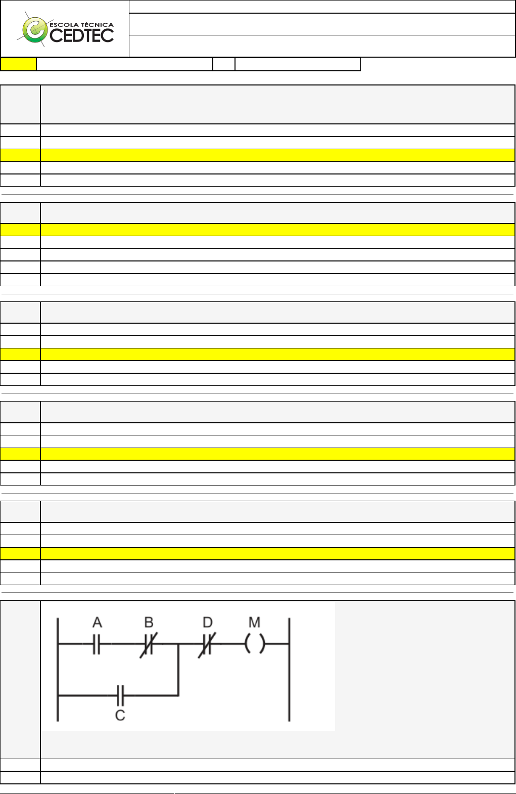 <p>23/07/2024 23:58:08 1/3</p><p>REVISÃO DE SIMULADO</p><p>Nome:</p><p>VARLEY VIEIRA SILVA</p><p>Disciplina:</p><p>Controlador Lógico Programável</p><p>Respostas corretas são marcadas em amarelo X Respostas marcardas por você.</p><p>Questão</p><p>001</p><p>Para um sensor de nível, com as características descritas a seguir, acoplado em uma entrada analógica de um CLP de 16 bits, qual o valor</p><p>corresponde no nosso programa para que o CLP identifique o nível de 3,7 litros?</p><p>Dados do sensor:</p><p>Faixa de indicação: de 1 à 10 litros</p><p>A) 9824</p><p>B) 9827</p><p>X C) 9828</p><p>D) 9820</p><p>E) 9826</p><p>Questão</p><p>002</p><p>Quais das alternativas abaixo podemos classificar como dispositivos para interligação em um cartão de entrada analógica?</p><p>X A) Transmissor de temperatura, transmissor de nível e ultra som</p><p>B) Inversor de frequência e válvula de controle</p><p>C) Nenhuma das alternativas</p><p>D) Botoeira de emergência, contator e lâmpada</p><p>E) Transmissor de vazão, botoeira de acionamento de emergência, lâmpada de sinalização</p><p>Questão</p><p>003</p><p>Quais das alternativas abaixo podemos classificar como dispositivos para interligação em um cartão de entrada digital?</p><p>X A) Transmissor de vazão, botoeira de acionamento de emergência, lâmpada de sinalização</p><p>B) Nenhuma das alternativas</p><p>C) Botoeira de emergência, chava bóia, pressostato</p><p>D) Transmissor de temperatura, transmissor de nível e ultra som</p><p>E) Inversor de frequência e válvula de controle</p><p>Questão</p><p>004</p><p>Quais das alternativas abaixo podemos classificar como dispositivos para interligação em um cartão de saída analógica?</p><p>A) Transmissor de vazão, botoeira de acionamento de emergência, lâmpada de sinalização</p><p>B) lâmpada, contato e sirene</p><p>C) Inversor de frequência e válvula de controle</p><p>X D) Transmissor de temperatura, transmissor de nível e ultra som</p><p>E) Nenhuma das alternativas</p><p>Questão</p><p>005</p><p>Quais das alternativas abaixo podemos classificar como dispositivos para interligação em um cartão de saída digital?</p><p>A) Transmissor de vazão, botoeira de acionamento de emergência, lâmpada de sinalização</p><p>B) Nenhuma das alternativas</p><p>X C) sirene, contator e lâmpada</p><p>D) Transmissor de temperatura, transmissor de nível e ultra som</p><p>E) Inversor de frequência e válvula de controle</p><p>Questão</p><p>006</p><p>A figura acima mostra o diagrama de contatos para o acionamento de um motor M implementado em um CLP e descrito em linguagem</p><p>ladder.</p><p>Sobre esse sistema, pode-se afirmar que o motor M estará funcionando quando:</p><p>A) A=0, B=0, C=1 e D=1</p><p>B) A=1, B=1, C=1 e D=1</p><p>23/07/2024 23:58:08 2/3</p><p>X C) A=0, B=1, C=1 e D=1</p><p>D) A=1, B=0, C=0 e D=0</p><p>E) A=1, B=1, C=0 e D=0</p><p>Questão</p><p>007</p><p>Observe, abaixo, parte de um diagrama Ladder para a programação de um CLP.</p><p>Nesta parte do diagrama, a saída M está:</p><p>A) nunca ligada, independente das entradas L e D</p><p>B) sempre ligada, independente das entradas L e D</p><p>C) ligada a partir de um pulso em D e desligada a partir de um pulso em L</p><p>D) ligada a partir de um pulso em L e desligada a partir de um pulso em D</p><p>X E) ligada com sinal simultâneo em L e em D</p><p>Questão</p><p>008</p><p>Analise as afirmações abaixo sobre elemento temporizador utilizado na programação de Controladores Lógicos Programá-veis (CLP) em</p><p>Linguagem Ladder.</p><p>I - O elemento temporizador possui uma entrada que, ao se energizar, habilita o acúmulo do tempo percorrido.</p><p>II - O elemento temporizador possui uma saída que é energizada quando o valor acumulado for igual ao preestabelecido e todas as outras</p><p>condições de funcionamento do elemento estiverem satisfeitas.</p><p>III - O elemento temporizador é do tipo não retentivo, isto é, se a energização do bloco for perdida, o valor acumulado é zerado.</p><p>Está correto o que se afirma em:</p><p>A) I e III, apenas</p><p>X B) I e II, apenas</p><p>C) I, apenas</p><p>D) II e III, apenas</p><p>E) I, II e III</p><p>Questão</p><p>009</p><p>A Figura 1 apresenta o diagrama LADDER de um CLP que possui um temporizador, com atraso no desligamento, ajustado para um tempo de</p><p>10s, e com a saída C1 inicialmente desabilitada. A Figura 2 apresenta os diagramas de tempo dos comandos B1 e B2 .</p><p>Nessas condições, após a habilitação da saída C1, esta só será desabilitada no instante de tempo t, cujo valor em segundos é:</p><p>A) 7</p><p>X B) 5</p><p>C) 12</p><p>D) 13</p><p>E) 2</p><p>23/07/2024 23:58:08 3/3</p><p>Questão</p><p>010</p><p>O diagrama de contatos abaixo é utilizado em um pequeno controlador lógico programável em uma pequena máquina, sua função básica é</p><p>acionar seus motores.</p><p>I - O contato “Y1” normalmente aberto é um contato de intertravamento.</p><p>II - O contato “Y3” normalmente aberto é um contato de retenção.</p><p>III - A bobina “Y2” pode ser energizada junto com a bobina “Y3”.</p><p>IV -Após acionadas as três bobinas “Y1, Y2 e Y3” não podem ser desligadas de forma individual.</p><p>V - A bobina “Y3” pode ser energizada antes da bobina “Y2”.</p><p>Analisando as alternativas acima, podemos definir como verdadeiras:</p><p>A) II, III e IV</p><p>B) II, III, IV e V</p><p>C) I, IV e V</p><p>D) I, II, III, IV e V</p><p>X E) I,III e V</p>