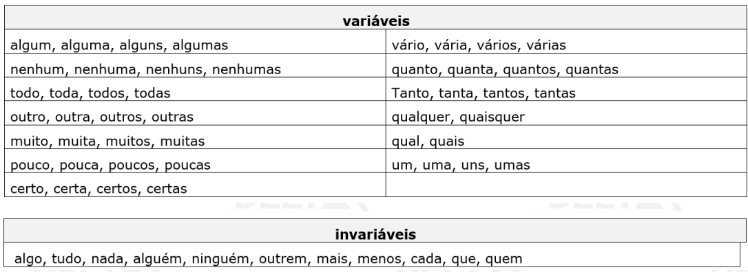 <p>variáveis algum, alguma, alguns, algumas vário, vária, vários, várias nenhum, nenhuma, nenhuns, nenhumas quanto, quanta, quantos, quantas todo, toda, todos, todas Tanto, tanta, tantos, tantas outro, outra, outros, outras qualquer, quaisquer muito, muita, muitos, muitas qual, quais pouco, pouca, poucos, poucas um, uma, uns, umas certo, certa, certos, certas invariáveis algo, tudo, nada, alguém, ninguém, outrem, mais, menos, cada, que, quem</p>