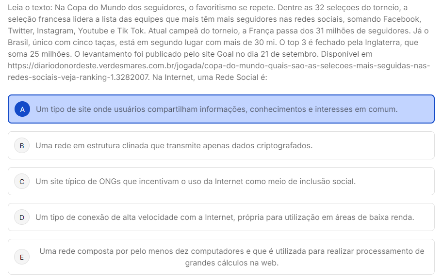<p>Leia texto: Na Copa do Mundo dos seguidores, favoritismo se repete. Dentre as 32 seleçoes do torneio, a seleção francesa lidera a lista das equipes que mais têm mais seguidores nas redes sociais, somando Facebook, Twitter, Instagram, Youtube e Tik Tok. Atual do torneio, a França passa dos 31 milhões de seguidores. Já Brasil, único com cinco taças, está em segundo lugar com mais de 30 mi. top 3 é fechado pela Inglaterra, que soma 25 levantamento foi publicado pelo site Goal no dia 21 de setembro. Disponível em redes-sociais-veja-ranking-1.3282007 Na Internet, uma Rede Social é: A Um tipo de site onde usuários compartilham informações, conhecimentos e interesses em comum. B Uma rede em estrutura clinada que transmite apenas dados criptografados. C Um site típico de ONGs que incentivam uso da Internet como meio de inclusão D Um tipo de conexão de alta velocidade com a Internet, própria para utilização em áreas de baixa renda. Uma rede composta por pelo menos dez computadores e que é utilizada para realizar processamento de E grandes cálculos na web.</p>