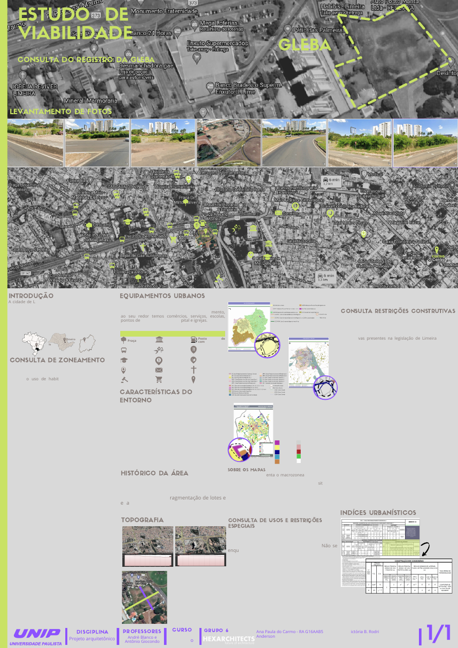 <p>Mapa 01 -</p><p>Macrozoneamento</p><p>Mapa 02- Zoneamento</p><p>Fonte: Prefeitura de</p><p>Limeira. Reelaboração</p><p>própria.</p><p>Indústria</p><p>Serviços</p><p>Área Verde</p><p>Terreno Baldio</p><p>Mapa 03 - Usos do solo urbano</p><p>LEGENDA</p><p>Comércio</p><p>Residência</p><p>Institucional</p><p>Desocupado</p><p>Em Construção</p><p>Área Municipal</p><p>Fonte: Prefeitura</p><p>de Limeira.Reelaboração</p><p>própria.</p><p>LEGENDA</p><p>Fonte: Prefeitura de Limeira.</p><p>Reelaboração própria.</p><p>LEGENDA</p><p>São Paulo</p><p>Gleba</p><p>GLEBA</p><p>CENTRO</p><p>INTRODUÇÃO</p><p>Limeira</p><p>A cidade de Limeira possui uma área de 581,711 Km² e</p><p>fica situada no interior do estado de São Paulo, ficando a</p><p>22°33'53'' de latitude sul e 47°24'06 de longitude oeste,</p><p>com 588 metros de altitude. Sua população estimada até</p><p>2020 é de 308.482 pessoas com uma densidade</p><p>demográfica de 475,32 hab/Km² segundo os dados do</p><p>Instituto Brasileiro de Geograia e Estatísca (IBGE).</p><p>Endereço: Jardim Santa Cecilia, Limeira - SP</p><p>Titulação: (-)</p><p>Região: Sudeste de Limeira</p><p>ESTUDO DE</p><p>VIABILIDADE</p><p>CONSULTA DO REGISTRO DA GLEBA</p><p>LEVANTAMENTO DE FOTOS</p><p>CONSULTA DE ZONEAMENTO</p><p>Arquitetura e</p><p>urbanismo Projeto arquitetônico André Blanco e</p><p>Antônio Giocondo</p><p>PROFESSORES CURSO Ana Paula do Carmo - RA G16AAB5</p><p>Anderson Frozza Guerrieri - RA F0607C5</p><p>Ester Serafim S. Marques - RA G138ED1</p><p>DISCIPLINA GRUPO 6 Esther Victória B. Rodrigues - RA N6789H3</p><p>Nathália Teato Paracampos - RA G1522F9</p><p>Rafaela da S. Bernardo - RA F32CCI3</p><p>1/1</p><p>No mapa 01 representa o macrozoneamento da cidade</p><p>de Limeira, o plano diretor definiu 4 macrozonas, sendo</p><p>a MU - Macrozona urbana em que a gleba está situada.</p><p>No mapa 02 representa o zoneamento da cidade, em</p><p>que a cidade é dividida em zonas de atividades e a gleba</p><p>está situada no ZPR-1, Zona Predominantemente</p><p>Residencial 1.</p><p>No mapa 03 representa de forma mais detalhada os</p><p>usos do solo urbano da cidade de Limeira, o uso</p><p>estabelecido pela gleba é de comércio, serviços e terreno</p><p>baldio.</p><p>SOBRE OS MAPAS</p><p>-</p><p>Ao analisar os mapas e a legislação da cidade de Limeira,</p><p>consta que a gleba fica situada em uma Zona</p><p>Predominantemente Residencial ZPR-1, podendo</p><p>receber o uso de habitação de alta densidade sem</p><p>nenhuma contradição, sendo que o território de Limeira</p><p>é divido em macrozonas, e a gleba está intitulada na</p><p>Macrozona Urbana MU, segundo o que se encontra no</p><p>Art.31 das leis municipais de Limeira:</p><p>Capitulo III - Da estratégia de uso e ocupação de</p><p>solo. Art. 31. Para efeito do ordenamento territorial,</p><p>o Município de Limeira será dividido em</p><p>macrozonas, delimitadas no Mapa Anexo 4,</p><p>integrante desta Lei, assim definidas:</p><p>IV - macrozona urbana, MZ - U: áreas delimitadas</p><p>pelo perímetro urbano, compostas de áreas</p><p>urbanizadas e não urbanizadas, com tendência à</p><p>urbanização e áreas de tendência industrial,</p><p>comercial, interesse histórico e serviços que geram</p><p>níveis mais elevados de incomodidade; Art. 35.</p><p>Macrozona Urbana, MZ - U, tem como diretrizes:</p><p>I - reordenar as funções urbanas de morar,</p><p>trabalhar, recrear e circular em função de suas</p><p>características peculiares, seu inter-relacionamento e</p><p>da capacidade de suporte da infra-estrutura e do</p><p>meio ambiente, na zona urbana consolidada;</p><p>II - estabelecer a contiguidade de novos processos</p><p>de urbanização a partir de áreas já urbanizadas</p><p>como forma prioritária do crescimento da cidade,</p><p>evitando-se a criação de vazios urbanos que sirvam à</p><p>especulação e que onerem os custos com extensão</p><p>da malha viária e de redes de infra-estrutura;</p><p>III - estabelecer padrões de adensamento similares</p><p>para a maior parte da macrozona urbana, indicando</p><p>estrategicamente os locais passíveis de maior</p><p>adensamento através dos instrumentos descritos</p><p>nesta Lei;</p><p>IV - propiciar o equilíbrio integral em cada nova</p><p>porção do território a se formar (novos</p><p>parcelamentos e fracionamentos) através da mistura</p><p>ordenada e dirigida de usos: a) evitando-se a</p><p>segregação social; b) permitindo a justa convivência</p><p>entre atividades que gerem pequeno impacto e</p><p>incomodidades com usos residenciais; c) separando</p><p>atividades causadoras de impactos e</p><p>incomodidades; d) possibilitando a redução de</p><p>percursos e tempo na circulação diária dos cidadãos.</p><p>Art. 41. A macrozona urbana divide-se</p><p>estrategicamente em:</p><p>IV - ZPR - 1, Anexo 12; Art. 44. Na ZPR-1, que inclui a</p><p>maior parte do território urbanizado da cidade, com</p><p>bairros consolidados e utilizados</p><p>predominantemente por uso residencial, deve-se:</p><p>I - manter e incentivar usos existentes compatíveis;</p><p>II - adequar usos incômodos;</p><p>III - restringir usos incompatíveis;</p><p>IV - manter concentração de usos diversificados em</p><p>vias assim consolidadas;</p><p>V - incentivar a implantação de áreas permeáveis e</p><p>ajardinadas.</p><p>EQUIPAMENTOS URBANOS</p><p>CARACTERÍSTICAS DO</p><p>ENTORNO</p><p>HISTÓRICO DA ÁREA</p><p>LEGENDA - EQUIPAMENTOS</p><p>CONSULTA RESTRIÇÕES CONSTRUTIVAS</p><p>Analisando o entorno no raio d 1Km do centro de</p><p>Limeira, é possível notar que a gleba fica situada em</p><p>zona servida de grandes acessos para deslocamento,</p><p>ao seu redor temos comércios, serviços, escolas,</p><p>pontos de ônibus, correios, hospital e igrejas.</p><p>Praça Posto de</p><p>combustível</p><p>Restaurante</p><p>Biblioteca</p><p>Supermercado</p><p>Enxuto</p><p>Fórum</p><p>Hospital Correio</p><p>Banco</p><p>HípicaPonto d