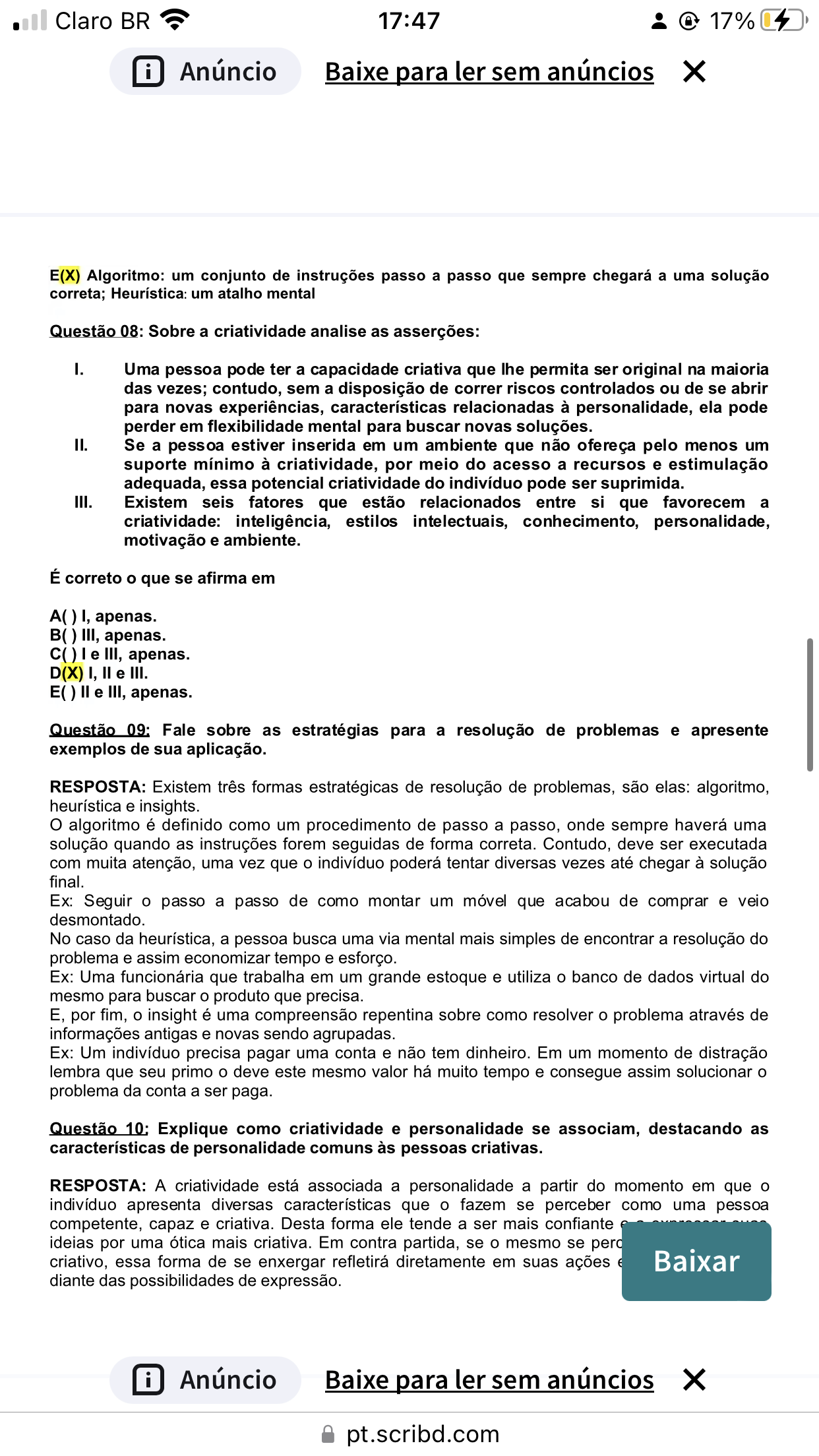 <p>Claro BR 17:47 17% G i Anúncio Baixe para ler sem anúncios X E(X) Algoritmo: um conjunto de instruções passo a passo que sempre chegará a uma solução correta; Heurística: um atalho mental Questão 08: Sobre a criatividade analise as asserções: I. Uma pessoa pode ter a capacidade criativa que lhe permita ser original na maioria das vezes; contudo, sem a disposição de correr riscos controlados ou de se abrir para novas experiências, características relacionadas à personalidade, ela pode perder em flexibilidade mental para buscar novas soluções. II. Se a pessoa estiver inserida em um ambiente que não ofereça pelo menos um suporte mínimo à criatividade, por meio do acesso a recursos e estimulação adequada, essa potencial criatividade do indivíduo pode ser suprimida. III. Existem seis fatores que estão relacionados entre si que favorecem a criatividade: inteligência, estilos intelectuais, conhecimento, personalidade, motivação e ambiente. É correto o que se afirma em A( ) I, apenas. III, apenas. e III, apenas. D(X) I, e III. E() e III, apenas. Questão 09: Fale sobre as estratégias para a resolução de problemas e apresente exemplos de sua aplicação. RESPOSTA: Existem três formas estratégicas de resolução de problemas, são elas: algoritmo, heurística e insights. algoritmo é definido como um procedimento de passo a passo, onde sempre haverá uma solução quando as instruções forem seguidas de forma correta. Contudo, deve ser executada com muita atenção, uma vez que o indivíduo poderá tentar diversas vezes até chegar à solução final. Ex: Seguir o passo a passo de como montar um móvel que acabou de comprar e veio desmontado. No caso da heurística, a pessoa busca uma via mental mais simples de encontrar a resolução do problema e assim economizar tempo e esforço. Ex: Uma funcionária que trabalha em um grande estoque e utiliza o banco de dados virtual do mesmo para buscar o produto que precisa. E, por fim, o insight é uma compreensão repentina sobre como resolver o problema através de informações antigas e novas sendo agrupadas. Ex: Um indivíduo precisa pagar uma conta e não tem dinheiro. Em um momento de distração lembra que seu primo o deve este mesmo valor há muito tempo e consegue assim solucionar o problema da conta a ser paga. Questão 10: Explique como criatividade e personalidade se associam, destacando as características de personalidade comuns às pessoas criativas. RESPOSTA: A criatividade está associada a personalidade a partir do momento em que o indivíduo apresenta diversas características que o fazem se perceber como uma pessoa competente, capaz e criativa. Desta forma ele tende a ser mais confiante ideias por uma ótica mais criativa. Em contra partida, se o mesmo se criativo, essa forma de se enxergar refletirá diretamente em suas ações Baixar diante das possibilidades de expressão. i Anúncio Baixe para ler sem anúncios X pt.scribd.com</p>