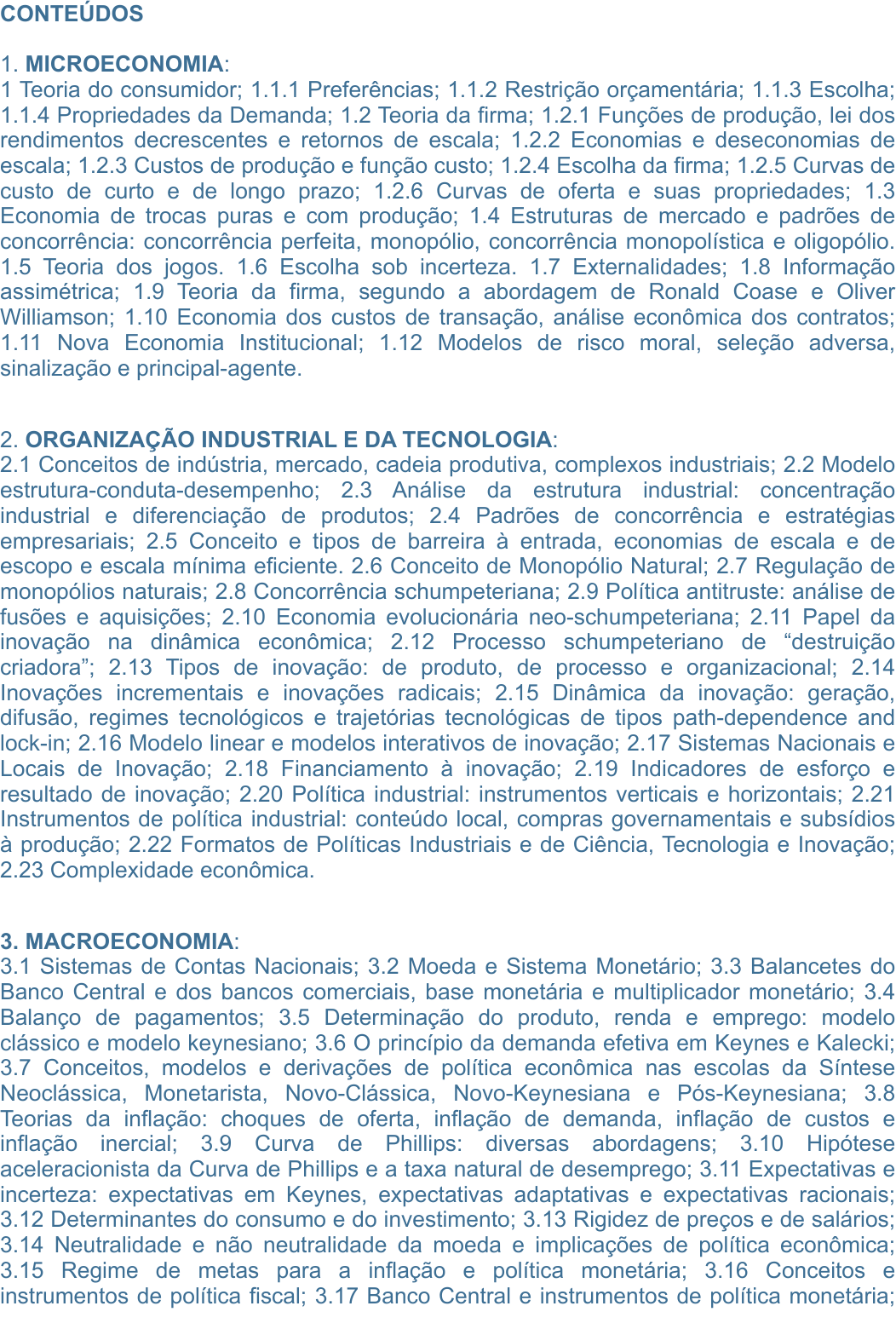 <p>CONTEÚDOS</p><p>1. MICROECONOMIA:</p><p>1 Teoria do consumidor; 1.1.1 Preferências; 1.1.2 Restrição orçamentária; 1.1.3 Escolha;</p><p>1.1.4 Propriedades da Demanda; 1.2 Teoria da firma; 1.2.1 Funções de produção, lei dos</p><p>rendimentos decrescentes e retornos de escala; 1.2.2 Economias e deseconomias de</p><p>escala; 1.2.3 Custos de produção e função custo; 1.2.4 Escolha da firma; 1.2.5 Curvas de</p><p>custo de curto e de longo prazo; 1.2.6 Curvas de oferta e suas propriedades; 1.3</p><p>Economia de trocas puras e com produção; 1.4 Estruturas de mercado e padrões de</p><p>concorrência: concorrência perfeita, monopólio, concorrência monopolística e oligopólio.</p><p>1.5 Teoria dos jogos. 1.6 Escolha sob incerteza. 1.7 Externalidades; 1.8 Informação</p><p>assimétrica; 1.9 Teoria da firma, segundo a abordagem de Ronald Coase e Oliver</p><p>Williamson; 1.10 Economia dos custos de transação, análise econômica dos contratos;</p><p>1.11 Nova Economia Institucional; 1.12 Modelos de risco moral, seleção adversa,</p><p>sinalização e principal-agente.</p><p>2. ORGANIZAÇÃO INDUSTRIAL E DA TECNOLOGIA:</p><p>2.1 Conceitos de indústria, mercado, cadeia produtiva, complexos industriais; 2.2 Modelo</p><p>estrutura-conduta-desempenho; 2.3 Análise da estrutura industrial: concentração</p><p>industrial e diferenciação de produtos; 2.4 Padrões de concorrência e estratégias</p><p>empresariais; 2.5 Conceito e tipos de barreira à entrada, economias de escala e de</p><p>escopo e escala mínima eficiente. 2.6 Conceito de Monopólio Natural; 2.7 Regulação de</p><p>monopólios naturais; 2.8 Concorrência schumpeteriana; 2.9 Política antitruste: análise de</p><p>fusões e aquisições; 2.10 Economia evolucionária neo-schumpeteriana; 2.11 Papel da</p><p>inovação na dinâmica econômica; 2.12 Processo schumpeteriano de “destruição</p><p>criadora”; 2.13 Tipos de inovação: de produto, de processo e organizacional; 2.14</p><p>Inovações incrementais e inovações radicais; 2.15 Dinâmica da inovação: geração,</p><p>difusão, regimes tecnológicos e trajetórias tecnológicas de tipos path-dependence and</p><p>lock-in; 2.16 Modelo linear e modelos interativos de inovação; 2.17 Sistemas Nacionais e</p><p>Locais de Inovação; 2.18 Financiamento à inovação; 2.19 Indicadores de esforço e</p><p>resultado de inovação; 2.20 Política industrial: instrumentos verticais e horizontais; 2.21</p><p>Instrumentos de política industrial: conteúdo local, compras governamentais e subsídios</p><p>à produção; 2.22 Formatos de Políticas Industriais e de Ciência, Tecnologia e Inovação;</p><p>2.23 Complexidade econômica.</p><p>3. MACROECONOMIA:</p><p>3.1 Sistemas de Contas Nacionais; 3.2 Moeda e Sistema Monetário; 3.3 Balancetes do</p><p>Banco Central e dos bancos comerciais, base monetária e multiplicador monetário; 3.4</p><p>Balanço de pagamentos; 3.5 Determinação do produto, renda e emprego: modelo</p><p>clássico e modelo keynesiano; 3.6 O princípio da demanda efetiva em Keynes e Kalecki;</p><p>3.7 Conceitos, modelos e derivações de política econômica nas escolas da Síntese</p><p>Neoclássica, Monetarista, Novo-Clássica, Novo-Keynesiana e Pós-Keynesiana; 3.8</p><p>Teorias da inflação: choques de oferta, inflação de demanda, inflação de custos e</p><p>inflação inercial; 3.9 Curva de Phillips: diversas abordagens; 3.10 Hipótese</p><p>aceleracionista da Curva de Phillips e a taxa natural de desemprego; 3.11 Expectativas e</p><p>incerteza: expectativas em Keynes, expectativas adaptativas e expectativas racionais;</p><p>3.12 Determinantes do consumo e do investimento; 3.13 Rigidez de preços e de salários;</p><p>3.14 Neutralidade e não neutralidade da moeda e implicações de política econômica;</p><p>3.15 Regime de metas para a inflação e política monetária; 3.16 Conceitos e</p><p>instrumentos de política fiscal; 3.17 Banco Central e instrumentos de política monetária;</p><p>3.18 Políticas monetárias convencionais e não –convencionais; 3.19 Mercados de</p><p>câmbio, regimes cambiais e política cambial; 3.20 41 Sistema financeiro: riscos de</p><p>crédito, de mercado, de liquidez e sistêmico; 3.21 A hipótese da instabilidade financeira</p><p>de Minsky, crises financeiras e políticas anticíclicas; 3.22 Papel do Estado no Sistema</p><p>Financeiro: modelos de racionamento de crédito e de repressão financeira; 3.23</p><p>Regulação financeira; 3.24 Efeitos da regulação de Basiléia sobre o sistema financeiro.</p><p>4. ECONOMIA INTERNACIONAL: 4.1 Teorias do comércio internacional: vantagens</p><p>absolutas e vantagens comparativas; 4.2 Modelo de HeckscherOhlin; 4.3 Condições para</p><p>a obtenção de ganhos de comércio; 4.4 Teorema da equalização dos preços relativos dos</p><p>bens e fatores de produção; 4.5 A crítica de Prebisch e a deterioração dos termos de troc;</p><p>4.6 Novas teorias de comércio internacional: oligopólio e retornos crescentes; economias</p><p>de escala, diferenciação de produtos, concorrência monopolística e comércio intra-</p><p>industrial; 4.7 Teoria neoschumpeteriana de comércio internacional (modelo de Dosi-</p><p>Pavitt-Soete); 4.8 Argumentos para livre-comércio; 4.9 Argumentos para proteção:</p><p>indústria nascente, tarifa ótima, falhas de mercado e política comercial estratégica;</p><p>Argumentos neoschumpeterianos para proteção; Vantagens comparativas dinâmicas;</p><p>4.10 Instrumentos de política comercial: tarifas de importação, quotas de importação e</p><p>subsídios à exportação; 4.11 Papel do crédito no comércio internacional; 4.12 Agências</p><p>de crédito à exportação; 4.13 Investimento estrangeiro direto; 4.14 Empresas</p><p>multinacionais e fragmentação global da produção; 4.15 Cadeias globais e regionais de</p><p>valor; 4.16 Determinação da renda e das taxas de juros em economias com diferentes</p><p>graus de mobilid