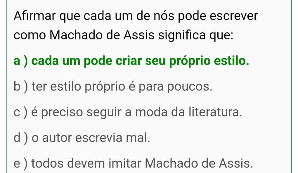 <p>Afirmar que cada um de nós pode escrever como Machado de Assis significa que: a ) cada um pode criar seu próprio estilo. b) ter estilo próprio é para poucos. c) é preciso seguir a moda da literatura. d) autor escrevia mal. e) todos devem imitar Machado de Assis.</p>