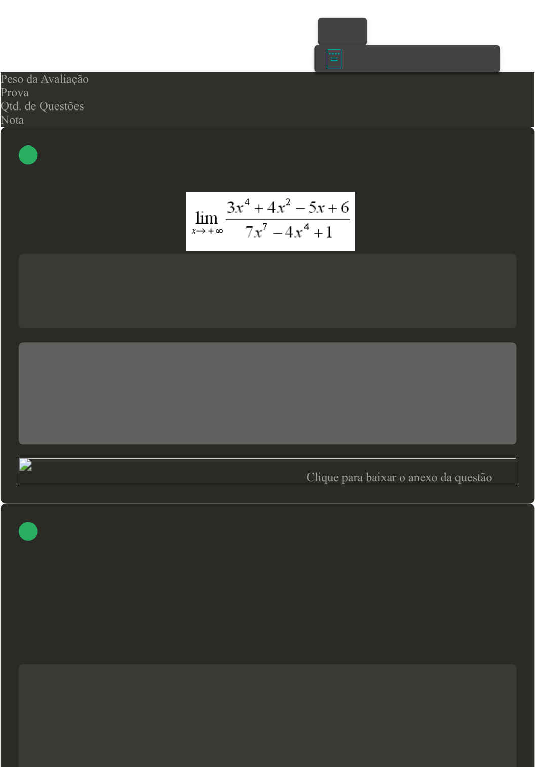 <p>Prova Impressa</p><p>GABARITO | Avaliação Final (Discursiva) - Individual</p><p>(Cod.:745415)</p><p>Peso da Avaliação 4,00</p><p>Prova 45929099</p><p>Qtd. de Questões 2</p><p>Nota 10,00</p><p>Em matemática, o conceito de limite é usado para descrever o comportamento de uma função à</p><p>medida que o seu argumento se aproxima de um determinado valor, assim como o comportamento de</p><p>uma sequência de números reais. Determine o limite da questão a seguir:</p><p>(É preciso demonstrar os cálculos)</p><p>Resposta esperada</p><p>Conforme figura:</p><p>Minha resposta</p><p>lim 3x^4+4x^2-5x+6 7x^7-4x^4+1 x--00 lim x^7(3/x^3+4/x^5-5/x^6+9)/ x--00 x^7(7-</p><p>4/x^3+1/x^7) lim 3/x^3+4/x^5-5/x^6+9/ x--00 7-4/x^3+1/x^7 3*0+4*0-5*0+6*0/ 7-4*0+0</p><p>resposta : 0</p><p>Formulário - Cálculo Diferencial e Integral (MAD) - PauloClique para baixar o anexo da questão</p><p>Em matemática, um ponto crítico, também chamado de ponto estacionário, é um ponto no</p><p>domínio de uma função onde a primeira derivada é nula. Os pontos críticos serão sempre pontos de</p><p>máximos ou mínimos relativos ou pontos de inflexão, podendo-se descobrir em que categoria o ponto</p><p>cai analisando a sua segunda derivada (a curvatura) da função. Em matemática, a análise de máximos</p><p>e mínimos (pontos críticos) possui diversas aplicações. Uma delas é na área fabril. Sendo assim,</p><p>imagine que o custo de fabricação de x unidades de um produto é dado por:</p><p>C(x) = 3x³ - 324x +192.</p><p>Quantas unidades deverão ser fabricadas para que o custo médio seja mínimo?</p><p>Resposta esperada</p><p>Devemos primeiramente encontrar os pontos críticos da função.</p><p>VOLTAR</p><p>A+</p><p>Alterar modo de visualização</p><p>1</p><p>2</p><p>01/10/2024, 09:57 Avaliação Final (Discursiva) - Individual</p><p>about:blank 1/2</p><p>C'(x) = 0</p><p>9x2 - 441 = 0</p><p>9x2 = 441</p><p>x2 = 49</p><p>x = ±7</p><p>Como o única solução que interessa é x = 7, verificaremos se é um ponto de máximo ou mínimo</p><p>com auxilio da derivada segunda.</p><p>C''(x) = 18x</p><p>C''(7) = 18 · 7</p><p>C''(7) = 126</p><p>Como o resultado foi positivo, temos um ponto de mínimo. Portanto, a quantidade mínimo é de 7</p><p>peças.</p><p>Minha resposta</p><p>c`(x)=0 c`(x)=9x^2-324 0=9x^2-324 x^2=324/9 +- raiz 36= +-6 como se trata de fabricação e a</p><p>quantidade não pode ser negativo a resposta é 6.</p><p>Imprimir</p><p>01/10/2024, 09:57 Avaliação Final (Discursiva) - Individual</p><p>about:blank 2/2</p>