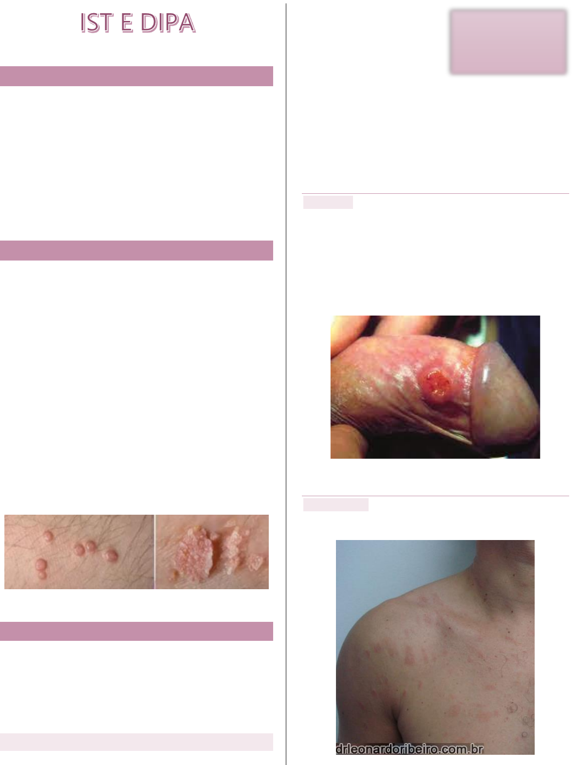 <p>GINECO TRANSCRIÇÃO AMANDA NAMMUR</p><p>SEXO SEGURO</p><p>- Preservativo</p><p>- Vacinação (HAV, HBV e HPV): HPV não consegue fazer pelo</p><p>posto de Saúde quando > 14 anos</p><p>- Conhecer status sorológico para HIV da parceira</p><p>- Teste regular para HIV e outras IST</p><p>- Colpocitologia oncótica</p><p>- Anticoncepção</p><p>HPV</p><p>• Vacinação:</p><p>- 9 a 14 anos: meninas</p><p>- 11 a 14 anos: meninos</p><p>- HIV, transplantados e pacientes oncóticos</p><p>(imunocomprometidos): 9 a 26 anos (nesse grupo específico,</p><p>são necessárias as 3 doses: 0, 2 e 6 meses)</p><p>- Tipos 6, 11, 16 e 18</p><p>- Verrugas anogenitais: Indicações de biópsia</p><p>• Tratamento:</p><p> ATA (80% A 90%), podofilina (10% a 25%),</p><p>eletrocauterização, exérese cirúrgica ou crioterapia</p><p> Imiquimode ou podofilotoxina: tratamento</p><p>ambulatorial. Mais prolongado.</p><p>SÍFILIS</p><p>• Treponema pallidum</p><p>• Maioria assintomática</p><p>• Lesões raras ou inexistentes a partir do segundo ano.</p><p>O cancro duro passa despercebido muitas vezes.</p><p>• Estágio e risco de transmissão. Quanto mais recente a</p><p>doença, maior o risco de transmissão.</p><p>ESTÁGIOS</p><p>Recente (primária, secundária</p><p>e latente recente): até 1 ano de</p><p>evolução. Na primária</p><p>geralmente abre com cancro</p><p>duro indolor, mas pode ser</p><p>imperceptível e passa</p><p>despercebido. Depois fica</p><p>difícil de saber há quanto tempo a pessoa está contaminada.</p><p>Tardia (latente tardia e terciária): mais de 1 ano de evolução</p><p>ou não sabe há quanto tempo aquele paciente foi</p><p>contaminado.</p><p>PRIMÁRIA</p><p>✓ Incubação: 10 a 90 dias</p><p>✓ Úlcera geralmente única e indolor, com borda bem</p><p>definida e regular, base endurecida e fundo limpo.</p><p>Cancro duro.</p><p>✓ Às vezes, não chega a ser úlcera, pode ser uma lesão</p><p>semelhante à pápula.</p><p>✓ Linfadenopatia regional.</p><p>SECUNDÁRIA</p><p>✓ Erupção macular eritematosa pouco visível (roséola)</p><p>Toda erupção cutânea</p><p>sem causa determinada</p><p>deve ser investigada</p><p>com testes para sífilis!</p><p>GINECO TRANSCRIÇÃO AMANDA NAMMUR</p><p>✓ Progressão para lesões papulosas e condiloma plano</p><p>anogenital</p><p>✓ Alopecia em clareira e madarose</p><p>LATENTE:</p><p>✓ Assintomática</p><p>TERCIÁRIA:</p><p>✓ Gomas sifilíticas</p><p>✓ Sistema nervoso e cardiovascular</p><p>DIAGNÓSTICO DA SÍFILIS</p><p>Exame direto:</p><p>✓ Pesquisa em campo escuro → só dá certo se tiver com</p><p>a lesão primária, o cancro duro.</p><p>Sorológico:</p><p>✓ Teste treponêmico + teste não treponêmico positivos</p><p>= diagnóstico.</p><p>✓ O não-treponêmico mais usado é o VDRL.</p><p>✓ Treponêmico + e VDRL + = diagnóstico</p><p>✓ Se treponêmico + e VDRL negativo, pede novo exame</p><p>treponêmico (ou FTA-Abs ou teste rápido). Se esse 3º for</p><p>positivo: sífilis ou cicatriz. Se negativo: descarta.</p><p>✓ VDRL positivo e com</p><p>Treponêmico negativo</p><p>também pede outro</p><p>treponêmico. Se + = sífilis</p><p>ou cicatriz, se negativo =</p><p>descarta.</p><p>✓ Se o primeiro teste já veio</p><p>negativo, não segue com o</p><p>2º exame, só se o primeiro</p><p>for positivo, então solicita o</p><p>segundo. Se o segundo foi</p><p>com resultado divergente,</p><p>solicita um terceiro.</p><p>TRATAMENTO</p><p>Recente:</p><p>- Benzilpenicilina benzatina – controle trimestral por 1 ano</p><p>Tardia</p><p>- Benzilpenicilina benzatina – controle trimestreal por 1 anos</p><p>Neurossífilis</p><p>- Benzilpenicilina cristalina por 14 dias</p><p>- Ceftriaxona (14 dias)</p><p>- LCR semestral até normalização</p><p>CONTROLE DE CURA</p><p>- VDRL não reagente</p><p>- Queda em 2 diluições em até 6 meses: recente</p><p>- Queda em 2 diluições em até 12 meses: tardia</p><p>HERPES GENITAL</p><p> HSV-1: lesões periorais</p><p> HSV-2: lesões genitais</p><p> Incubação: 6 dias</p><p> Lesões eritemato-papulosas: vesículas dolorosas de</p><p>conteúdo citrino.</p><p> Recorrência: clínica menos intenso e sintomas</p><p>prodrômicos. Inclusive, os pacientes que têm os sintomas</p><p>prodrômicos já são orientados iniciar o tratamento assim</p><p>que sentirem.</p><p></p><p>GINECO TRANSCRIÇÃO AMANDA NAMMUR</p><p>TRATAMENTO</p><p> Aciclovir 400mg 8/8horas (7 dias)</p><p> Aciclovir 200mg 5x/dia (7dias)</p><p> Recorrente (6 ou mais episódios/ano): aciclovir (6</p><p>meses a 2 anos). É importante fazer a profilaxia nesses</p><p>pacientes recorrentes.</p><p>CANCROIDE</p><p>➔ Haemophilus ducreyi (bactéria).</p><p>➔ Lesão dolorosa e múltipla com borda irregular, fundo</p><p>necrótico e odor fétido. CANCRO MOLE.</p><p>➔ Acometimento linfonodal (bubão)</p><p> Fistulização por orifício único</p><p> Drenagem ou excisão dos linfonodos acometidos.</p><p>Coleta de exsudato da base da lesão: coloração de Gram.</p><p>Lesão que se arrasta por algumas semanas.</p><p>TRATAMENTO:</p><p>Azitromicina 1 g DU.</p><p>LINFOGRANULOMA VENÉREO</p><p>Esse nome vem de obstrução linfática, então tem um</p><p>acometimento linfático importante. E história é mais avançada,</p><p>isto é, insidiosa.</p><p>•Chlamydia trachomatis</p><p>•Pápula, pústula ou exculceração indolor</p><p>•Linfadenopatia inguinal e/ou femoral</p><p>•Inoculação → disseminação linfática regional → sequelas</p><p> Supuração e fistulização por orifícios múltiplos</p><p> Elefantíase genital</p><p>TRATAMENTO:</p><p>1ª opção: Doxicilina (21 dias), 100mg a cada 12 horas.</p><p>DONOVANOSE</p><p>Klebsiella granulomatis</p><p>Ulceração com bordos planos ou hipertróficos (destacados).</p><p>Úlcera que sangra fácil</p><p>Fundo granuloso, de aspecto vermelho vivo e sangramento</p><p>fácil</p><p>Evolução lenta e progressiva</p><p>Lesões múltimas e em espelho</p><p>Lesões em espelho: aparec