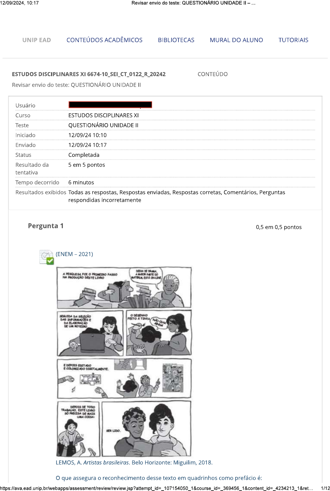 <p>12/09/2024, 10:17 Revisar envio do teste: QUESTIONÁRIO UNIDADE - UNIP EAD CONTEÚDOS ACADÊMICOS BIBLIOTECAS MURAL DO ALUNO TUTORIAIS ESTUDOS DISCIPLINARES XI 6674-10_SEI_CT_0122_R_20242 CONTEÚDO Revisar envio do teste: QUESTIONÁRIO UNIDADE Usuário Curso ESTUDOS DISCIPLINARES XI Teste QUESTIONÁRIO UNIDADE Iniciado 12/09/24 10:10 Enviado 12/09/24 10:17 Status Completada Resultado da 5 em 5 pontos tentativa Tempo decorrido 6 minutos Resultados exibidos Todas as respostas, Respostas enviadas, Respostas corretas, Comentários, Perguntas respondidas incorretamente Pergunta 1 0,5 em 0,5 pontos (ENEM - 2021) A For o PASSO A NA PRODUÇÃO DESTE LIVRO DA o DESENHO DAS INFORMAÇÕES A TINYA DA DE E TODO ESTE LIVRO só PRECISA MAIS UMA LEMOS, A. Artistas brasileiras. Belo Horizonte: Miguilim, 2018. que assegura o reconhecimento desse texto em quadrinhos como prefácio é:</p><p>12/09/2024, 10:17 Revisar envio do teste: QUESTIONÁRIO UNIDADE - Resposta Selecionada: A função de apresentação do livro. a. Respostas: A função de apresentação do livro. a. b. apelo emocional apoiado nas imagens. A descrição do processo criativo da autora. C. d. A referência à mescla dos trabalhos manual e digital uso de elementos gráficos voltados para o público-alvo. e. Comentário da Resposta: A. resposta: Comentário: Os quadrinhos desempenham a função de "apresentação do libro", sendo um texto breve inserido no início da obra para oferecer explicações sobre seu conteúdo, objetivos e produção. A imagem inserida está na página 8 (Q 15), do arquivo que pode ser acessado em: https://abre.ai/hRts. Pergunta 2 0,5 em 0,5 pontos (ENEM - 2021) os RISCOS PARA CRIANÇAS DO USO DO CELULAR ANTES DE DORMIR ESTUDO ESSAS DE SSTEMA NO LONGO CH 54 QUE FAZER? ENTRE SEM DE MANTER LONGE NO QUARTO A 18 jun 2019 No texto, os recursos verbais e não verbais empregados têm por objetivo: Resposta b. Selecionada: Influenciar o leitor a mudar atitudes e hábitos considerados prejudiciais às crianças. 2/12</p><p>12/09/2024, 10:17 Revisar envio do teste: QUESTIONÁRIO UNIDADE - - Respostas: a. Divulgar informações científicas sobre o uso indiscriminado de aparelhos celulares. b. Influenciar o leitor a mudar atitudes e hábitos considerados prejudiciais às crianças. C. Relacionar o uso da tecnologia aos efeitos decorrentes da falta de exercícios físicos. d. Indicar medidas eficazes para desestimular utilização de telefones pelo público infantil. e. Sugerir aos pais e responsáveis a substituição de dispositivos móveis por atividades lúdicas. Comentário da Resposta: B. resposta: Comentário: infográfico demonstra que os recursos verbais e não verbais utilizados no texto têm a finalidade de persuadir o leitor a alterar comportamentos e práticas prejudiciais às crianças. A imagem inserida está na página 14 (Q 31) do arquivo: https://abre.ai/hRts. Pergunta 3 0,5 em 0,5 pontos (ENEM - 2021) 3/12</p><p>12/09/2024, 10:17 Revisar envio do teste: QUESTIONÁRIO UNIDADE DESCARTÁVEL. ESSE NÃO. ABANDONO É CRIME. LEI FEDERAL N° 9 605/98 Disponível em: Acesso em: 12 dez. 2018 A associação entre o texto verbal e as imagens da garrafa e do configura recurso expressivo que busca: Resposta d. Selecionada: Sensibilizar o público em relação ao abandono de animais domésticos. Respostas: Estimular denúncias de maus-tratos contra animais. a. b. Desvincular o conceito de descarte da ideia de negligência. C. Incentivar campanhas de adoção de animais em situação de rua. d. Sensibilizar o público em relação ao abandono de animais domésticos. e. Alertar a população sobre as sanções legais acerca de uma prática criminosa. Comentário da Resposta: D. resposta: Comentário: Tanto o texto verbal quanto o não verbal buscam sensibilizar o público, visando evitar o abandono de animais de estimação. Isso é reforçado pela frase final na publicidade institucional: "Abandono é crime". A imagem inserida está na página 13 (Q 28) do arquivo: https://abre.ai/hRts. Pergunta 4 0,5 em 0,5 pontos 4/12</p><p>12/09/2024, 10:17 Revisar envio do teste: QUESTIONÁRIO UNIDADE - (ENEM 2021) AOS ASSIA HENFIL. Disponível em: Acesso em: 29 2018 (adaptado). Nessa tirinha, produzida na década de 1970, os recursos verbais e não verbais sinalizam a finalidade de: Resposta Selecionada: C. Ironizar as condições de igualdade. Respostas: Reforçar a luta por direitos civis. a. b. Explicitar a autonomia feminina. Ironizar as condições de igualdade. C. d. Estimular a abdicação da vida social. Criticar as obrigações da maternidade. e. Comentário Resposta: C. da resposta: Comentário: Na tira de Henfil, é perceptível que a mulher prestes a se tornar mãe planeja abrir mão da vida social e dos seus próprios projetos para se dedicar completamente ao filho. Esse papel de entrega total à criança é atribuído à mãe, não ao pai, revelando ironicamente a falta de igualdade nas condições entre os gêneros. A imagem inserida está na página 13 (Q 29) do arquivo: https://abre.ai/hRts. Pergunta 5 0,5 em 0,5 pontos (ENEM - 2021) A depressão caracteriza-se por um desequilíbrio na química cerebral. Os neurônios de um deprimido não respondem bem aos estímulos dos neurotransmissores. Os remédios que combatem a depressão têm o objetivo de restabelecer a química cerebral. Com o aumento gradativo de casos de depressão, a venda desses medicamentos está em crescente 5/12</p><p>12/09/2024, 10:17 Revisar envio do teste: QUESTIONÁRIO UNIDADE evolução, conforme ilustra o gráfico. A crítica contida no texto e na figura evidencia o seguinte aspecto da sociedade contemporânea: 600 519,2 500 465 370 400 294 300 236 200 de 100 0 2005 2006 2007 2008 2009 Ano 10 fev. 2010 (adaptado). No período de 2005 a 2009, o aumento percentual no volume de vendas foi de: Resposta Selecionada: 120. C. Respostas: 45,4. a. b. 54,5. 220. d. 283,2. e. Comentário da Resposta: C. resposta: Comentário: Ao fazer a conta básica, te