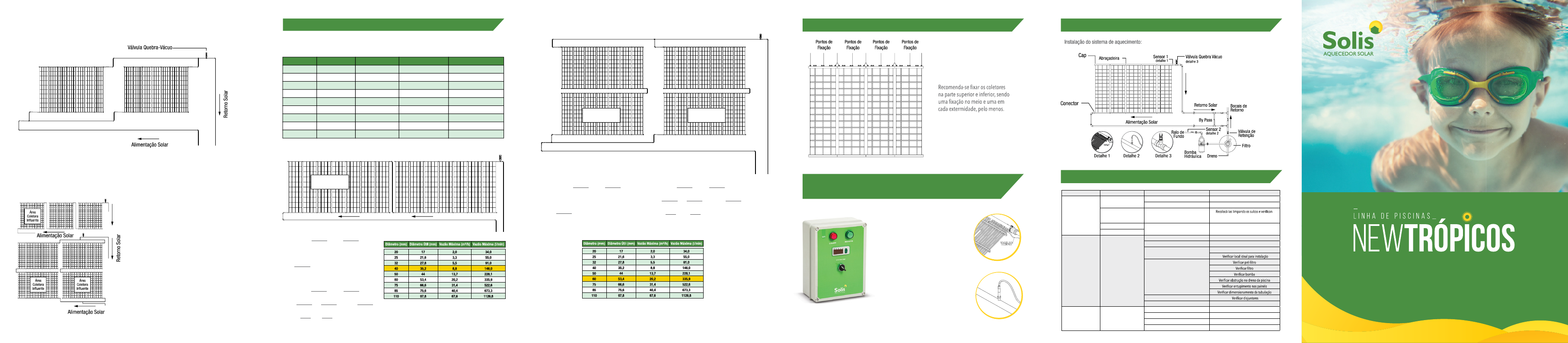 <p>Manual Técnico</p><p>Produto e Instalação</p><p>FO</p><p>R</p><p>05</p><p>6</p><p>- R</p><p>EV</p><p>. 1</p><p>1</p><p>- F</p><p>EV</p><p>/2</p><p>02</p><p>1</p><p>0908 10 11 12</p><p>Recomenda-se trabalhar com vazão nos coletores de 4,2 l/min ou 250 litros/hora.m²</p><p>Interligação hidráulica entre baterias de coletores: Associação em Paralelo</p><p>0bs.: Instalar no máximo três baterias em paralelo.</p><p>Vazão nos coletores: Para calcular a vazão nos coletores é necessário</p><p>saber qual a área coletora a ser alimentada</p><p>A primeira bateria alimentada é que</p><p>influi no dimensionamento da</p><p>tubulação e da bomba hidráulica.</p><p>No caso de baterias em paralelo,</p><p>calcular a área coletora das primeiras</p><p>baterias de cada série.</p><p>Sistema de Aquecimento Solar para Piscina</p><p>Principais Problemas, Causas e Soluções</p><p>PROBLEMA LOCAL CAUSA AÇÃO</p><p>Vazamento</p><p>Na tubulação</p><p>Termofusão mal feita Refazer a termofusão</p><p>Falta aperto Apertar as conexões</p><p>Nos coletores Uniões mal apertadas ou mal instaladas</p><p>-</p><p>do a colocação perfeita do anel de vedação</p><p>(para uniões com anel de vedação)</p><p>No tubo mestre</p><p>Extras Entre em contato com a Solis ou com sua</p><p>revenda localNos tubos de elevação</p><p>A água não</p><p>aquece Piscina</p><p>Quadro de comando desligado Ligar o quadro</p><p>Registros fora de posição Colocar registros na posição correta</p><p>Sombreamento</p><p>Providenciar poda das árvores</p><p>Pouca vazão de água</p><p>Falta de energia</p><p>Falta de capa térmica Colocar capa térmica</p><p>Tubos cheios</p><p>de água</p><p>com sistema</p><p>desligado</p><p>Alimentação dos</p><p>coletores</p><p>Registro do By Pass fechado Regular by-pass</p><p>Válvula quebra-vácuo travada Retirá-la e fazer uma limpeza</p><p>Registros fechados Colocar registros na posição correta</p><p>Retornos da piscina fechados Abrir retornos</p><p>Fixação dos Coletores Solares</p><p>Instalação do Quadro de Comando</p><p>e Sensores de Temperatura</p><p>Instalação do Sensor 1 CDT</p><p>Deve-se instalar o sensor 1 no coletor</p><p>em lugar onde não exista obstáculos</p><p>que possam impedir a incidência de</p><p>radiação solar sobre o mesmo.</p><p>Instalação do Sensor 2 CDT</p><p>Deve-se instalar o sensor 2 na</p><p>tubulação proveniente dos ralos no</p><p>fundo da piscina, na sucção da bomba</p><p>hidráulica, dentro da casa de máquinas.</p><p>Sensor 1</p><p>Sensor 2</p><p>Exemplo 02: Numa instalação, será instalado 04 baterias com 07 coletores por bateria, modelo New Trópicos, com</p><p>dimensões 1,12 m x 4,0 m, ligadas em paralelo conforme abaixo indicado.</p><p>Diâmetro (mm)</p><p>20</p><p>25</p><p>32</p><p>40</p><p>50</p><p>60</p><p>75</p><p>85</p><p>110</p><p>Espessura (mm)</p><p>1,5</p><p>1,7</p><p>2,1</p><p>2,4</p><p>3</p><p>3,3</p><p>4,2</p><p>4,7</p><p>6,1</p><p>Diâmetro Útil (mm)</p><p>17</p><p>21,6</p><p>27,8</p><p>35,2</p><p>44</p><p>53,4</p><p>66,6</p><p>75,6</p><p>97,8</p><p>Vazão Máxima (m³/h)</p><p>2,04</p><p>3,30</p><p>5,46</p><p>8,76</p><p>13,68</p><p>20,16</p><p>31,35</p><p>40,40</p><p>67,61</p><p>Vazão Máxima (l/min)</p><p>34,05</p><p>54,97</p><p>91,05</p><p>145,97</p><p>228,08</p><p>335,94</p><p>522,55</p><p>673,32</p><p>1126,83</p><p>Área da bateria=1,12 m X Comprimento do coletor X Nº de Coletores</p><p>Área Influente=Área da batreria X Nº de Baterias influentes</p><p>Vazão=Área influente X 4,2 l/min/m²</p><p>Exemplo 01: Numa instalação, serão instaladas 02 baterias com 07 coletores por bateria, modelo New Trópicos, com</p><p>dimensões 1,12 m x 4,0 m, ligadas em série conforme abaixo indicado.</p><p>Dimensionamento da Vazão de Água nos Coletores</p><p>Área Influente</p><p>Área Influente Área Influente</p><p>1,12 m x 4 m x 7</p><p>Área da bateria:</p><p>coletor</p><p>bateria</p><p>= 31,36 m²</p><p>bateria</p><p>31,36 x1 bateria = 31,36 m²m²</p><p>ba</p><p>Área influente:</p><p>Vazão:</p><p>l</p><p>min x m²</p><p>l</p><p>min</p><p>31,36 m² x 4,20 = 131,71</p><p>l</p><p>h</p><p>m³</p><p>h</p><p>7.902,72 = 7,9</p><p>l</p><p>min</p><p>l</p><p>h</p><p>131,71 = 7.902,72min</p><p>1h</p><p>x 60</p><p>1,12 m x 4 m x 7</p><p>Área da bateria:</p><p>coletor</p><p>bateria</p><p>= 31,36 m²</p><p>ba teria</p><p>31,36 x2 baterias = 62,72 m²m²</p><p>beteria</p><p>Área influente:</p><p>Vazão:</p><p>l</p><p>min x m²</p><p>l</p><p>min</p><p>62,72 m² x 4,20 = 263,42</p><p>l</p><p>h</p><p>m³</p><p>h</p><p>15.805,44 = 15,8</p><p>l</p><p>min</p><p>l</p><p>h</p><p>263,42 = 15.805,44min</p><p>1h</p><p>x 60</p><p>Diante dos valores de vazão de projeto de 131,71 l/min (7,9 m³/h) é recomendado</p><p>utilizar a tubulação de 40 mm, que permite uma vazão de até 146,0 l/min (8,8 m³/h).</p><p>Diante dos valores de vazão de projeto de 263,42 l/min (15,8m³/h) é recomendado</p><p>utilizar a tubulação de 60 mm, que permite uma vazão de até 335,9 l/min (20,2m³/h).</p><p>Modelo</p><p>Coletor Solar</p><p>NEW</p><p>TRÓPICOS</p><p>200</p><p>NEW</p><p>TRÓPICOS</p><p>300</p><p>NEW</p><p>TRÓPICOS</p><p>400</p><p>NEW</p><p>TRÓPICOS</p><p>500</p><p>NEW</p><p>TRÓPICOS</p><p>600</p><p>Características Construtivas</p><p>Matéria-prima Polipropileno</p><p>Pigmento Preto Fosco</p><p>Número de Tubos 144</p><p>Entrada/Saída Ø 50 mm</p><p>Pressão de</p><p>Trabalho* 20 m.c.a</p><p>Dimensões**</p><p>Comprimento 2,0m 3,0m 4,0m 5,0m 6,0m</p><p>Largura 1,12m 1,12m 1,12m 1,12m 1,12m</p><p>Espessura 0,06m 0,06m 0,06m 0,06m 0,06m</p><p>Peso</p><p>Vazio 5,2kg 7kg 8,7kg 10kg 12kg</p><p>Cheio 11,4kg 15,3kg 19kg 21,9kg 26,3kg</p><p>1. Abraçadeira</p><p>Tem como função vedar e unir um coletor a outro ou a uma conexão.</p><p>2.Conector</p><p>Conexão utilizada para unir as tubulações de alimentação, retorno e interligação entre baterias de</p><p>coletores com a piscina.</p><p>3.Cap</p><p>Utilizado para fechar as extremidade