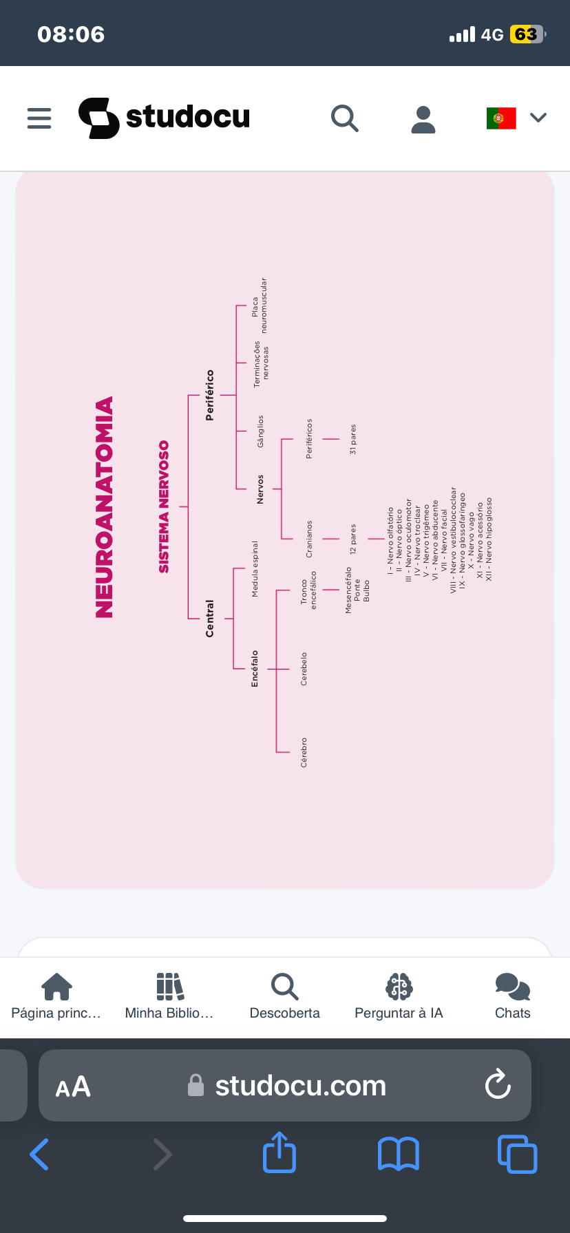 <p>AA NEUROANATOMIA SISTEMA NERVOSO Periférico Central Placa Terminações neuromuscular Medula espinal Nervos nervosas Encéfalo a Tronco Cerebelo Cranianos Cérebro encefálico 31 pares 12 pares Ponte Bulbo Nervo olfatório III Nervo IV - Nervo Nervo oculomotor trigêmeo troclear V Nervo VI - Nervo abducente VII Nervo facial VIII Nervo vestibulococlear IX Nervo XI Nervo acessório XII Nervo hipoglosso</p>
