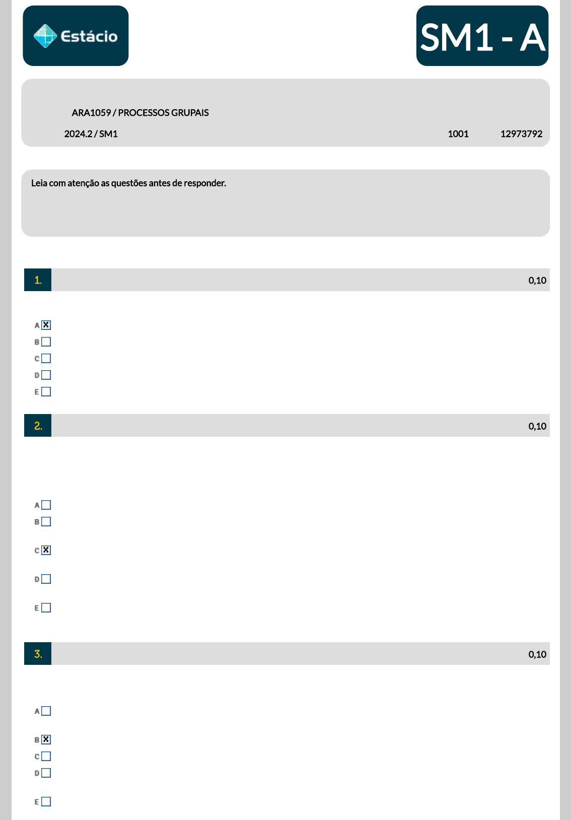 <p>7033144272 SM1 - A</p><p>30/09/2024 09:24</p><p>Nome: Matrícula: ____________________</p><p>Disciplina: ARA1059 / PROCESSOS GRUPAIS Data: ___ /___ /______</p><p>Período: 2024.2 / SM1 Turma: 1001 NSQ: 12973792</p><p>Leia com atenção as questões antes de responder.</p><p>É proibido o uso de equipamentos eletrônicos portáteis e consulta a materiais de qualquer natureza durante a realização da prova.</p><p>Boa prova.</p><p>1. _______ de 0,10</p><p>Ao estudar a questão da autoridade dentro dos fenômenos de grupo, Lewin apontou três tipos de liderança, são elas:</p><p>Autocrático, Laisse-Faire e democrático</p><p>Democrática, por equipe e Laissez-faire</p><p>Laissez-Faire, Por equipe e revolucionário</p><p>Revolucionária, Dinãmica e por equipe</p><p>Revolucionário, por equipe e autocrático</p><p>2. _______ de 0,10</p><p>Importante teórico que desenvolveu vasta literatura sobre a dinâmica do grupo, em que postula o estudo das forças que</p><p>agem no seio dos grupos, suas origens, consequências e condições modi�cadoras do comportamento do grupo:</p><p>Carl Rogers.</p><p>Abrahan Maslow.</p><p>Kurt Lewin.</p><p>Pichon-Rivière.</p><p>Jacob Moreno.</p><p>3. _______ de 0,10</p><p>A técnica dos grupos operativos começou a ser sistematizada pelo médico psiquiatra Pichon-Rivière, que observou a</p><p>in�uência do grupo familiar em seus pacientes. Acerca dessa modalidade de grupo, assinale a alternativa correta.</p><p>C) O grupo operativo não se centra no grupo enquanto totalidade, mas na relação que os integrantes mantêm com</p><p>a tarefa.</p><p>B) Grupos operativos são técnicas grupais centradas no grupo, focando a análise da própria dinâmica deste.</p><p>E) A técnica busca trabalhar apenas os aspectos manifestos do grupo.</p><p>A) Os grupos operativos são técnicas grupais centradas no indivíduo, sendo também chamados de grupos de</p><p>terapia.</p><p>D) O vínculo fundamental dos grupos operativos é a relação entre um grupo e os membros de sua família.</p><p>4. _______ de 0,10</p><p>A respeito do trabalho com grupos, podemos dizer que:</p><p>Apenas na área clínica e organizacional é possível aplicar grupos</p><p>Apenas na área hospitalar é possível aplicar grupos</p><p>O psicólogo pode trabalhar com grupos em diferentes áreas</p><p>Apenas na área organizacional é possível aplicar grupos</p><p>Apenas na área clínica é possível aplicar grupos</p><p>5. _______ de 0,10</p><p>Em relação ao processo grupal coesão, assinale a alternativa incorreta.</p><p>Quanto maior a coesão grupal, maior a divergência de ideias no grupo.</p><p>Quanto maior a coesão grupal, maior a satisfação dos membros do grupo.</p><p>Quanto menor a coesão grupal, menor a quantidade de in�uência exercida pelo grupo sobre seus membros.</p><p>Quanto maior a coesão grupal, maior a produtividade do grupo.</p><p>Quanto maior a coesão grupal, maior a chance de ocorrer o chamado: pensamento grupal.</p><p>6. _______ de 0,10</p><p>De modo geral, o grupo operativo discorre inicialmente por um momento de confusão ou baixa clareza na mente dos</p><p>membros; depois um momento de elaboração dos medos e confusões; e, por �m, a resultante das mudanças estabelecidas.</p><p>Essas etapas foram denominadas respectivamente de:</p><p>Início, processo e fechamento.</p><p>Diagnóstico, intervenção e coleta.</p><p>Motivação, mobilidade e disponibilidade.</p><p>Tarefa, diálogo e consequência.</p><p>Pré-tarefa, tarefa e projeto.</p><p>7. _______ de 0,10</p><p>Sobre as características de um grupo, é correto a�rmar que:</p><p>Onde há pessoas, há processos grupais, critérios como: regras, tempo e espaço, não são fundamentais, uma vez que</p><p>os contextos variam de acordo com a prática pro�ssional.</p><p>Nem todo grupo necessita possuir um objetivo bem delimitado, por exemplo, nos grupos operativos isso não se faz</p><p>necessário, uma vez que não estes não possuem �ns psicoterapêuticos.</p><p>Os gripos devem possuir um objetivo bem delimitado, evitando, com isto, a não coesão grupal. Mas, não precisam</p><p>levar em consideração tempo, espaço e regras.</p><p>Todo grupo deverá possuir um objetivo bem delimitado, evitando, com isto, a não coesão grupal. Deve-se também</p><p>levar em consideração tempo, espaço e regras.</p><p>Os grupos têm como principal objetivo trabalhar uma questão psicopatológica do sujeito, ou até mesmo, impor um</p><p>modelo de saúde idealizado, com �ns de reduzir os danos e psicoeducar os sujeito a uma forma correta de agir.</p><p>8. _______ de 0,10</p><p>Em grupo os sentimentos e emoções dos (as) participantes devem ser levados em consideração uma vez que:</p><p>Sentimentos e emoções não fazem parte de uma dinâmica de grupo.</p><p>Devemos ter cuidado ao explorar sentimentos e emoções em atividades de grupo, uma vez que não teremos tempo</p><p>para trabalhar com o mesmo.</p><p>Campus:</p><p>ARACAJU</p><p>Prova Impressa em 30/09/2024 por</p><p>DENISE BARBOSA SANTOS</p><p>Ref.: 7033144272 Prova Montada em 20/09/2024</p><p>A exploração dos sentimentos e emoções vivenciados pelos participantes de um processo de grupo não deverá ser</p><p>levado em consideração, uma vez que nem sempre teremos tempo de trabalhar tais conteúdos.</p><p>A exploração de sentimentos e emoções não é algo que deve ser levado em consideração, independente do</p><p>contexto, uma vez que essa exploração apenas é importante para um processo psicoterápico;</p><p>A exploração dos sentimentos e emoções vivenciados pelos participantes de um processo de grupo poderá</p><p>fornecer informações acerca da dinâmica individual e coletiva dos membros daquele determinado grupo,</p><p>indicando, por exemplo: con�itos, emoções que podem prejudicar em algum momento o desempenho, dentre</p><p>outros.</p><p>9. _______ de 0,10</p><p>O facilitador/ou coordenador de um processo de Dinâmica de grupo precisa, e