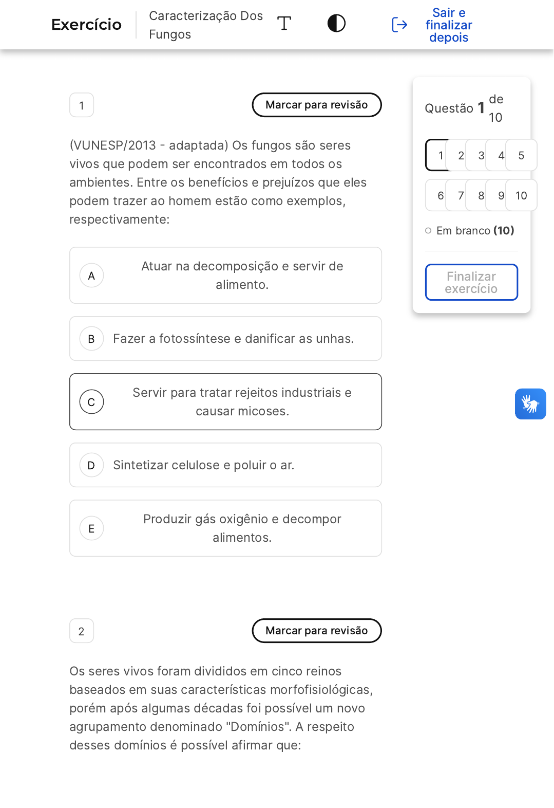 <p>A</p><p>B</p><p>C</p><p>D</p><p>E</p><p>1 Marcar para revisão</p><p>�VUNESP/2013 � adaptada) Os fungos são seres</p><p>vivos que podem ser encontrados em todos os</p><p>ambientes. Entre os benefícios e prejuízos que eles</p><p>podem trazer ao homem estão como exemplos,</p><p>respectivamente:</p><p>Atuar na decomposição e servir de</p><p>alimento.</p><p>Fazer a fotossíntese e danificar as unhas.</p><p>Servir para tratar rejeitos industriais e</p><p>causar micoses.</p><p>Sintetizar celulose e poluir o ar.</p><p>Produzir gás oxigênio e decompor</p><p>alimentos.</p><p>2 Marcar para revisão</p><p>Os seres vivos foram divididos em cinco reinos</p><p>baseados em suas características morfofisiológicas,</p><p>porém após algumas décadas foi possível um novo</p><p>agrupamento denominado "Domínios". A respeito</p><p>desses domínios é possível afirmar que:</p><p>Questão 1</p><p>de</p><p>10</p><p>Em branco �10�</p><p>Finalizar</p><p>exercício</p><p>1 2 3 4 5</p><p>6 7 8 9 10</p><p>Exercício</p><p>Caracterização Dos</p><p>Fungos</p><p>Sair e</p><p>finalizar</p><p>depois</p><p>A</p><p>B</p><p>C</p><p>D</p><p>E</p><p>Os fungos por serem eucariotos pertencem</p><p>ao domínio Eukaria junto com as plantas,</p><p>animais e os protistas.</p><p>Os procariotos e os eucariotos fazem parte</p><p>do domínio Eukaria, pois compartilham um</p><p>ancestral comum.</p><p>Os bolores e os cogumelos pluricelulares</p><p>anucleados são os principais</p><p>representantes do domínio Eukaria.</p><p>O domínio Eukaria engloba os seres vivos</p><p>unicelulares e pluricelulares que não</p><p>possuem membranas em seu núcleo.</p><p>As leveduras, apesar de serem fungos, não</p><p>pertencem ao domínio Eukaria por serem</p><p>unicelulares.</p><p>3 Marcar para revisão</p><p>Os organismos agrupados como fungos são seres</p><p>eucariontes e heterotróficos.</p><p>Sobre os fungos, assinale a alternativa correta.</p><p>A</p><p>B</p><p>C</p><p>D</p><p>E</p><p>No grupo dos ascomicetos, estão os fungos</p><p>venenosos, como os cogumelos do gênero</p><p>Amanita.</p><p>Alguns fungos são capazes de produzir</p><p>toxinas que têm ação neurotóxica,</p><p>nefrotóxica ou hepatotóxica, podem causar</p><p>alergias, problemas gastrointestinais ou até</p><p>mesmo levar o indivíduo à morte.</p><p>Fungos saprófitos provocam doenças como</p><p>as micoses em seres humanos e a ferrugem</p><p>em cafeeiros.</p><p>Os zigomicetos não desenvolvem corpos de</p><p>frutificação, nem esporos sexuados, um</p><p>exemplo é a Candida albicans.</p><p>Candidíase, tricomoníase, histoplasmose e</p><p>micoses são algumas doenças causadas</p><p>por fungos.</p><p>4 Marcar para revisão</p><p>O Reino Fungi, segundo métodos de biologia</p><p>molecular, representa um grupo monofilético</p><p>composto, tradicionalmente, por cinco principais</p><p>Filos: Chytridiomycota, Zygomycota, Glomeromycota,</p><p>Ascomycota e Basidiomycota. Sendo leveduras,</p><p>bolores e fungos filamentosos exemplos destes</p><p>organismos.</p><p>Adaptado de: Santos, E. R. D. Material Complementar</p><p>ao livro Sistemática Vegetal I� Fungos. 2015.</p><p>Disponível em:</p><p>https://uab.ufsc.br/biologia/files/2020/08/Fungos.pdf.</p><p>Acesso em: 21 jan. 2023.</p><p>A</p><p>B</p><p>C</p><p>D</p><p>E</p><p>Sobre leveduras, bolores e fungos filamentosos,</p><p>analise as asserções I e II.</p><p>I � Leveduras, bolores e fungos filamentosos são</p><p>seres multinucleados.</p><p>Porque</p><p>II � Organismos multinucleados têm células que</p><p>apresentam mais de um núcleo.</p><p>Marque a alternativa que apresenta a relação entre</p><p>as asserções I e II.</p><p>As asserções I e II são falsas.</p><p>A asserção I é verdadeira e a asserção II é</p><p>falsa.</p><p>As asserções I e II são verdadeiras, mas a</p><p>asserção II não é uma justificativa para a</p><p>asserção I.</p><p>A asserção I é falsa e a asserção II é</p><p>verdadeira.</p><p>As asserções I e II são verdadeiras e a</p><p>asserção II é uma justificativa para a</p><p>asserção I.</p><p>5 Marcar para revisão</p><p>O nicho ecológico dos fungos pode ser o mais</p><p>variado, sendo frequentemente associados à matéria</p><p>orgânica do solo ou em associação com outros</p><p>organismos. Sobre os fungos decompositores, é</p><p>correto afirmar:</p><p>A</p><p>B</p><p>C</p><p>D</p><p>E</p><p>Independente do tipo de matéria orgânica</p><p>presente no solo das florestas, todos os</p><p>fungos podem decompor.</p><p>Eles degradam unicamente a celulose das</p><p>folhas que caem das árvores, reciclando a</p><p>matéria orgânica.</p><p>Eles podem aumentar a produção e</p><p>melhorar a qualidade das árvores frutíferas</p><p>liberando carboidratos no solo.</p><p>Eles são responsáveis pela degradação da</p><p>matéria orgânica, auxiliando na ciclagem</p><p>dos elementos da natureza.</p><p>A principal função dos fungos</p><p>decompositores está relacionada ao</p><p>fornecimento de carboidratos das plantas</p><p>superiores.</p><p>6 Marcar para revisão</p><p>�COSEAC/2014 � adaptado) Algumas espécies de</p><p>fungos caracterizam-se por possuir hifas</p><p>especializadas, capazes de capturar nematoides</p><p>parasitas de plantas e animais. Tais hifas formam um</p><p>verdadeiro anel ou laço, que se fecha quando um</p><p>nematoide toca a parte interna do anel armadilha,</p><p>imobilizando-o para ser mais tarde colonizado e</p><p>digerido por hifas apropriadas. A relação entre o</p><p>fungo e o nematoide é do tipo:</p><p>A</p><p>B</p><p>C</p><p>D</p><p>E</p><p>Mutualismo - relação em que o fungo se</p><p>beneficia e a outra espécie também é</p><p>beneficiada pela interação.</p><p>Predatismo - relação em que o fungo</p><p>consome o outro organismo matando-o.</p><p>Parasitismo obrigatório - relação em que os</p><p>fungos vivem exclusivamente em</p><p>organismos vivos, causando doenças em</p><p>plantas e animais.</p><p>Pa