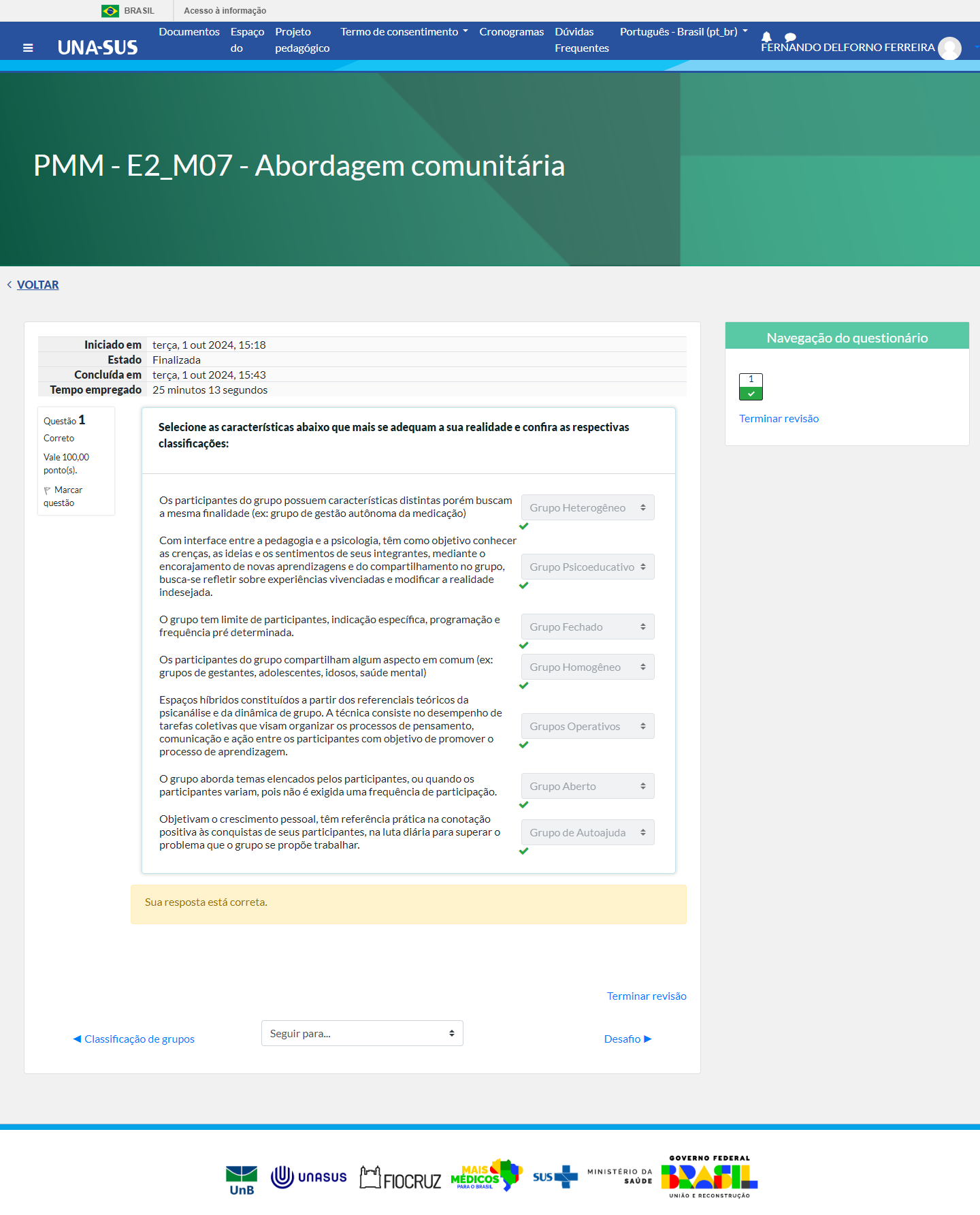 <p>BRASIL Acesso à informação Documentos Espaço Projeto Termo de consentimento Cronogramas Dúvidas Português Brasil (pt_br) = UNA-SUS do pedagógico Frequentes FERNANDO DELFORNO FERREIRA PMM - E2_M07 - Abordagem comunitária</p>
