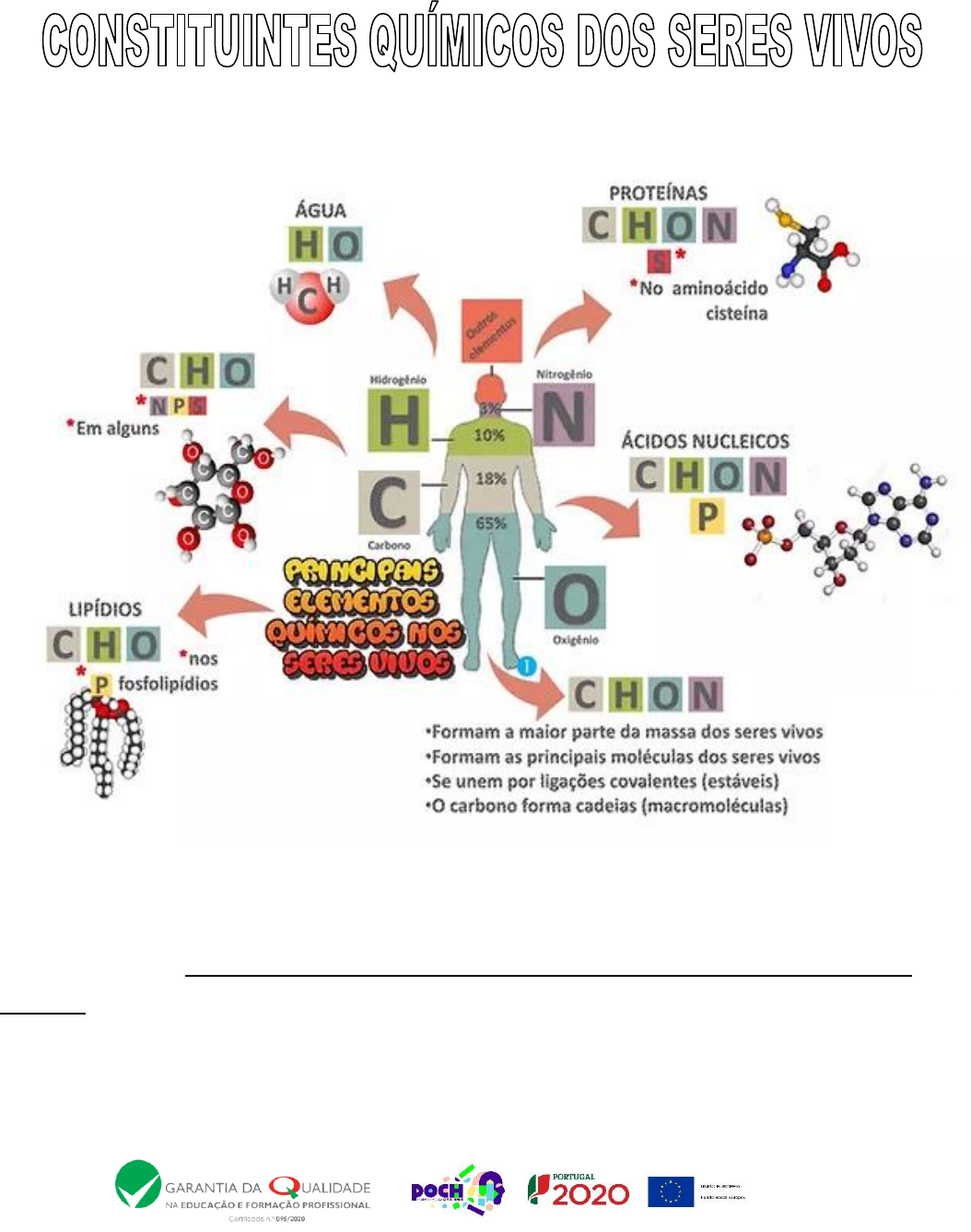 <p>1</p><p>Ficha Informativa n.º4 - Biomoléculas</p><p>A célula é, como já sabes, a unidade básica da constituição da matéria viva e constitui um sistema ativo e</p><p>dinâmico. No entanto, a unidade da vida não se manifesta somente ao nível celular, mas também ao nível</p><p>molecular.</p><p>Todos os seres vivos são constituídos por moléculas – biomoléculas. Estas podem atingir níveis de</p><p>complexidade extremamente elevados e a proporção em que os elementos se combinam nos seres vivos é</p><p>muito diferente da verificada na matéria inerte.</p><p>Glícidos</p><p>Glícidos</p><p>2</p><p>Na tentativa de compreender a vida, vamos deter-nos algum tempo sobre a sua base química.</p><p>CONSTITUINTES QUÍMICOS DA MATÉRIA VIVA – BIOMOLÉCULAS</p><p>COMPOSTOS INORGÂNICOS</p><p>São de origem mineral e provêm</p><p>basicamente do meio físico externo.</p><p>COMPOSTOS ORGÂNICOS</p><p>São compostos de carbono, ou seja, têm como estrutura</p><p>básica um “esqueleto” de átomos de carbono ao qual se</p><p>encontram ligados outros elementos químicos.</p><p>As suas moléculas são em regra de grandes dimensões, sendo</p><p>muitas delas de grande complexidade – macromoléculas.</p><p> ÁGUA</p><p> SAIS MINERAIS</p><p> PRÓTIDOS</p><p> GLÍCIDOS</p><p> LÍPIDOS</p><p> ÁCIDOS NUCLEICOS</p><p>DADA A IMPORTÂNCIA DA ÁGUA E DOS COMPOSTOS ORGÂNICOS NA CONSTITUIÇÃO DA MATÉRIA VIVA, VAMOS</p><p>PROCURAR COMPREENDER ALGUMAS DAS SUAS CARACTERÍSTICAS E FUNÇÕES.</p><p>O composto mais importante da vida é a água, podendo atingir entre 75% a 90% do total da massa de</p><p>um ser vivo. Apesar da sua grande importância para os sistemas vivos, a água tem uma estrutura</p><p>molecular simples.</p><p>3</p><p>Fig. 1 - Molécula de água</p><p>A água apresenta propriedades que favorecem a sua intervenção na vida dos organismos.</p><p>A água:</p><p>- Intervém nas reações químicas, sendo um metabolito essencial.</p><p>- Intervém em reações de hidrólise.</p><p>- Atua como meio de difusão de muitas substâncias.</p><p>- É um regulador da temperatura.</p><p>- É um excelente solvente, serve de veículo para materiais nutritivos necessários às células e para</p><p>produtos de excreção.</p><p>De todas as funções que a água realiza na matéria viva, a que mais se destaca é o seu poder de dissolver</p><p>numerosos compostos orgânicos e inorgânicos, sendo por isso, denominada solvente universal. As pequenas</p><p>dimensões e a configuração peculiar da molécula de água, um dipolo eléctrico, podem explicar o seu grande</p><p>poder dissolvente.</p><p>Cada molécula de água é constituída por um átomo</p><p>de oxigénio e dois átomos de hidrogénio. Os dois</p><p>eletrões dos átomos de hidrogénio são</p><p>compartilhados pelo átomo de oxigénio e encontram-</p><p>se mais próximos do núcleo deste. Em consequência,</p><p>os dois átomos de hidrogénio na molécula de água</p><p>têm uma carga local positiva e o átomo de oxigénio</p><p>tem uma carga local negativa. A molécula torna-se</p><p>polar, formando um dipolo eléctrico.</p><p>Quando um dos átomos de hidrogénio com carga</p><p>local positiva, de uma molécula de água, se situa</p><p>perto do átomo de oxigénio de outra molécula de</p><p>água, a força de atração entre esses átomos origina</p><p>uma ligação que recebe o nome de ligação de</p><p>hidrogénio ou ponte de hidrogénio.</p><p>As moléculas de água ligam-se entre si numa teia</p><p>complexa de muitas ligações de hidrogénio. A</p><p>abundância destas ligações faz com que a água seja</p><p>um líquido de alta coesão molecular.</p><p>4</p><p>Os prótidos são compostos orgânicos quaternários de carbono (C), oxigénio (O), hidrogénio (H) e azoto (N).</p><p>Podem conter outros elementos como enxofre (S), fósforo (P), magnésio (Mg).</p><p>CLASSIFICAÇÃO DOS PRÓTIDOS EM FUNÇÃO DA SUA COMPLEXIDADE</p><p>AMINOÁCIDOS</p><p>- PRÓTIDOS MAIS SIMPLES.</p><p>- UNIDADES BÁSICAS ESTRUTURAIS DOS PÉPTIDOS E DAS PROTEÍNAS.</p><p>- CONSTITUÍDOS POR UM GRUPO AMINA (NH2), UM GRUPO CARBOXILO (COOH) E UM ÁTOMO DE</p><p>HIDROGÉNIO (H) LIGADOS AO MESMO ÁTOMO DE CARBONO (C).</p><p>- POSSUI AINDA UMA PORÇÃO MOLECULAR (R – RADICAL) QUE VARIA DE AMINOÁCIDO PARA</p><p>AMINOÁCIDO.</p><p>PÉPTIDOS</p><p>- SÃO O RESULTADO DA UNIÃO DE 2 A 99 AMINOÁCIDOS.</p><p>- AS LIGAÇÕES ENTRE 2 AMINOÁCIDOS DESIGNAM-SE POR LIGAÇÕES PEPTÍDICAS.</p><p>- A LIGAÇÃO PEPTÍDICA ESTABELECE-SE ENTRE O GRUPO CARBOXILO DE UM AMINOÁCIDO E O</p><p>GRUPO AMINA DE OUTRO.</p><p>PROTEÍNAS</p><p>- MACROMOLÉCULAS DE ELEVADO PESO MOLECULAR (+ de 100 aminoácidos).</p><p>- CONSTITUÍDAS POR UMA OU MAIS CADEIAS POLIPEPTÍDICAS.</p><p>- HÁ UMA GRANDE DIVERSIDADE DE PROTEÍNAS, QUE RESULTA DO TIPO, NÚMERO E ORDEM DOS</p><p>AMINOÁCIDOS QUE AS CONSTITUEM.</p><p>- POSSUEM UMA CONFORMAÇÃO TRIDIMENSIONAL DEFINIDA.</p><p>- APRESENTAM FUNÇÕES CRUCIAIS EM TODOS OS PROCESSOS BIOLÓGICOS: função estrutural,</p><p>função enzimática, função de transporte, função hormonal, função imunológica e função</p><p>motora.</p><p>5</p><p>Os glícidos (hidratos de carbono) são compostos orgânicos ternários, isto é, constituídos por carbono (C),</p><p>oxigénio (O) e hidrogénio (H), e estão abundantemente distribuídos nos organismos vegetais e animais. Têm</p><p>função essencialmente energética (exemplo: sacarose) e estrutural (exemplo: celulose).</p><p>CLASSIFICAÇÃO DOS GLÍCIDOS EM FUNÇÃO DA SUA COMPLEXIDADE</p><p>MONOSSACARÍDEOS</p><p>- UNIDADES BÁSICAS ESTRUTURAIS DOS GLÍCIDOS.</p><p>- SÃO CLASSIFICADOS SEGUNDO O NÚMERO DE ÁTOMOS DE CARBONO (C) QUE POSSUEM (TRIOSES,</p><p>TETROSES, PENTOSES, HEXOSES, HEPTOSES.).</p><p>- ENTRE AS PENTOSES DESTACAM-SE A RIBOSE E A DESOXIRRIBOSE.</p><p>- AS HEXOSES MAIS FREQUENTES NOS SERES VIVOS SÃO A GLICOSE, A FRUTOSE E A GALACTOSE.</p><p>OLIGOSSACARÍDEOS</p><p>- RESULTAM DA 