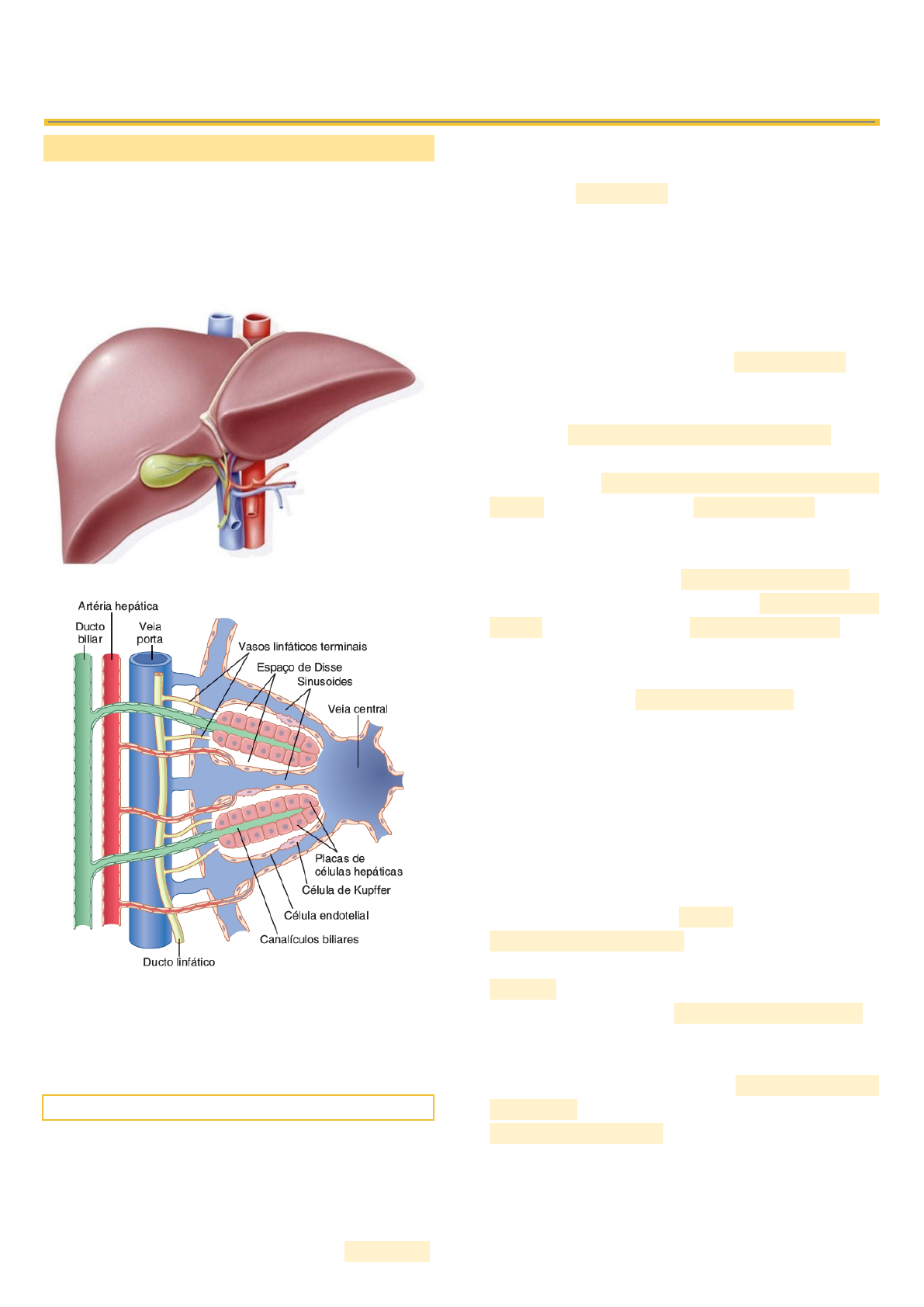 <p>DISTÚRBIOS HEPÁTICOS</p><p>FISIOLOGIA HEPÁTICA</p><p>O fígado é responsável pela filtração e</p><p>armazenamento de sangue; metabolismo de</p><p>carboidratos, proteínas, gorduras, hormônios e</p><p>substâncias químicas estranhas; formação de bile;</p><p>armazenamento de vitaminas e ferro; e formação de</p><p>fatores de coagulação.</p><p>A veia porta hepática recebe o sangue de todo o</p><p>intestino, do baço, do pâncreas e da vesícula biliar,</p><p>transportando-o para o fígado.</p><p>METABOLIZAÇÃO</p><p>METABOLISMODE CARBOIDRATOS:</p><p>Quando ingerimos uma alta quantidade de glicose, o</p><p>nosso organismo utiliza o que necessita e o excesso é</p><p>enviado para o fígado. No fígado, a glicose é</p><p>convertida em glicogênio e armazenada nas células</p><p>hepáticas através do processo chamado glicogênese.</p><p>Quando a concentração de glicose no sangue diminui,</p><p>como entre as refeições ou durante o jejum, o fígado</p><p>realiza a glicogenólise, que é a conversão do</p><p>glicogênio de volta em glicose e sua liberação na</p><p>corrente sanguínea para restaurar os níveis de glicose.</p><p>Além disso, em situações de alta demanda de energia,</p><p>como jejum prolongado, exercícios intensos ou baixa</p><p>ingestão de carboidratos, o fígado também pode</p><p>produzir glicose a partir de outras substâncias, como</p><p>aminoácidos e lactato, através da gliconeogênese.</p><p>METABOLISMODAGORDURA:</p><p>Quando a disponibilidade de glicose é limitada, como</p><p>em situações de inanição ou diabetes descontrolada,</p><p>pode ocorrer a clivagem dos ácidos graxos para obter</p><p>energia. Esse processo gera corpos cetônicos, que são</p><p>utilizados como uma alternativa de combustível pelas</p><p>células e desempenham um papel importante quando</p><p>a glicose é escassa. A acumulação excessiva de</p><p>corpos cetônicos pode causar uma queda no pH do</p><p>sangue, resultando em acidose metabólica. Em</p><p>pessoas com diabetes descontrolada, a produção</p><p>excessiva de corpos cetônicos pode levar a uma</p><p>condição chamada cetoacidose diabética. Isso ocorre</p><p>quando os níveis de corpos cetônicos no sangue se</p><p>tornam tão altos que causam uma acidificação do</p><p>sangue, resultando em sintomas como náuseas,</p><p>vômitos, respiração rápida e, em casos graves, pode</p><p>levar ao coma e morte se não tratado</p><p>adequadamente.</p><p>METABOLISMODE PROTEÍNAS:</p><p>Grandes quantidades de amônia são formadas pelo</p><p>processo de desaminação, e quantidades adicionais</p><p>são continuamente formadas no intestino por</p><p>bactérias e, em seguida, absorvidas pelo sangue.</p><p>Portanto, se o fígado não converte amônia em ureia, a</p><p>concentração plasmática de amônia aumenta</p><p>rapidamente e resulta em encefalopatia hepática.</p><p>O fígado é responsável por sintetizar proteínas</p><p>plasmáticas, como a albumina, alfa e betaglobulina,</p><p>fatores de coagulação e lipoproteínas. Na doença</p><p>hepática crônica, como a cirrose, as proteínas</p><p>plasmáticas, tais como a albumina, podem cair para</p><p>níveis muito baixos, causando edema generalizado e</p><p>ascite devido à diminuição da pressão oncótica no</p><p>sangue.</p><p>FATORES DE COAGULAÇÃO: As substâncias formadas</p><p>no fígado que são usadas no processo de coagulação</p><p>incluem fibrinogênio, protrombina, globulina</p><p>aceleradora, fator VII e vários outros fatores</p><p>importantes. A vitamina K é necessária pelos processos</p><p>metabólicos do fígado para a formação de muitas</p><p>dessas substâncias, especialmente a protrombina e os</p><p>fatores VII, IX e X. Na ausência de vitamina K, as</p><p>concentrações de todas essas substâncias diminuem</p><p>acentuadamente, aumentando o risco de hemorragia.</p><p>ARMAZENAMENTO</p><p>O fígado desempenha um papel vital no</p><p>armazenamento de várias vitaminas e minerais</p><p>essenciais para a saúde do corpo. Entre as vitaminas</p><p>armazenadas, estão a vitamina A, D e B12. Além dessas</p><p>vitaminas, o fígado também armazena minerais</p><p>importantes, como o ferro e o cobre.</p><p>EXCREÇÃO</p><p>O fígado é responsável pela produção da bile, um</p><p>líquido que é armazenado na vesícula biliar e liberado</p><p>no intestino durante a digestão. Sua principal função é</p><p>emulsificar as gorduras, facilitando sua digestão e</p><p>absorção pelo organismo. Além de seu papel na</p><p>digestão, a bile também auxilia na eliminação de</p><p>substâncias indesejadas, como o excesso de colesterol</p><p>e a bilirrubina, um subproduto da degradação das</p><p>hemácias.</p><p>CIRROSE HEPÁTICA</p><p>A cirrose hepática é uma doença crônica</p><p>caracterizada pela substituição do tecido hepático por</p><p>tecido fibroso prejudicando o funcionamento do</p><p>fígado.</p><p>TIPOS DE CIRROSE:</p><p>➔ Cirrose alcoólica: consumo excessivo de</p><p>álcool.</p><p>➔ Cirrose pós-necrótica: Infecções virais agudas,</p><p>toxicidade de medicamentos ou substâncias</p><p>químicas.</p><p>➔ Cirrose biliar: Obstrução dos ductos biliares</p><p>por fatores externos, como cálculos biliares ou</p><p>tumores.</p><p>CIRROSE COMPENSADA: Aranhas vasculares, eritema</p><p>palmar, epistaxe, edema maleolar, hepatomegalia,</p><p>esplenomegalia.</p><p>CIRROSE DESCOMPENSADA: Ascite, icterícia,</p><p>baqueteamento digital, púrpura (plaquetopenia),</p><p>equimoses espontâneas, atrofia gonádica.</p><p>Manifestações clínicas:</p><p>➔ Icterícia;</p><p>➔ Mal-estar, fraqueza e fadiga;</p><p>➔ Prurido;</p><p>➔ Dor abdominal;</p><p>➔ Febre;</p><p>➔ Anorexia;</p><p>➔ Ganho de peso, edema e aumento da</p><p>circunferência abdominal;</p><p>➔ Hematêmese, melena e hematoquezia;</p><p>➔ Equimoses fáceis;</p><p>➔ Alterações na acuidade mental, transtornos de</p><p>personalidade, transtornos do
