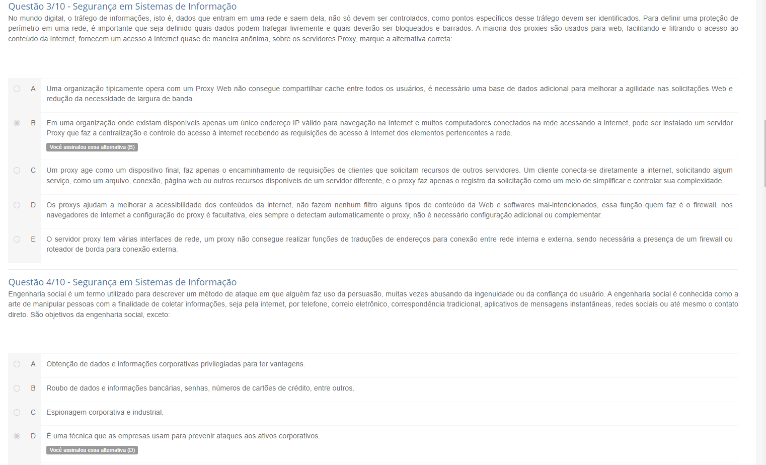 <p>Questão 3/10 - Segurança em Sistemas de Informação No mundo digital, 0 de informações, isto é, dados que entram em uma rede e saem dela, não só devem ser controlados, como pontos específicos desse devem ser Para definir uma proteção de perímetro em uma rede, é importante que seja definido quais dados podem trafegar livremente e quais deverão ser bloqueados e barrados. A maioria dos proxies são usados para web, facilitando e filtrando acesso ao conteúdo da fornecem um acesso à Internet quase de maneira anônima, sobre os servidores Proxy, marque a alternativa correta: A Uma organização tipicamente opera com um Proxy Web não consegue compartilhar cache entre todos os usuários, é necessário uma base de dados adicional para melhorar a agilidade nas solicitações Web e redução da necessidade de largura de B Em uma organização onde existam disponíveis apenas um endereço IP válido para navegação na Internet e muitos computadores conectados na rede acessando a internet, pode ser instalado um servidor Proxy que faz a centralização e controle do acesso à internet recebendo as requisições de acesso à Internet dos elementos pertencentes a Você assinalou essa alternativa (B) C Um proxy age como um dispositivo faz apenas encaminhamento de requisições de clientes que solicitam recursos de outros Um cliente conecta-se diretamente a internet, solicitando algum serviço, como um arquivo, página web ou outros recursos disponíveis de um servidor e proxy faz apenas 0 registro da solicitação como um meio de simplificar e controlar sua complexidade. D Os proxys ajudam a melhorar a acessibilidade dos conteúdos da internet, não fazem nenhum filtro alguns tipos de conteúdo da Web e softwares mal-intencionados, essa função quem faz é firewall, nos navegadores de Internet a configuração do proxy é facultativa, eles sempre O detectam automaticamente proxy, não é necessário configuração adicional ou complementar. E servidor proxy tem várias interfaces de rede, um proxy não consegue realizar funções de traduções de endereços para conexão entre rede interna e sendo necessária a presença de um firewall ou roteador de borda para conexão externa. Questão 4/10 - Segurança em Sistemas de Informação Engenharia social é um termo utilizado para descrever um método de ataque em que faz uso da persuasão, muitas vezes abusando da ingenuidade ou da confiança do A engenharia social é conhecida como a arte de manipular pessoas com a finalidade de coletar informações, seja pela internet, por telefone, correio correspondência tradicional, aplicativos de mensagens instantâneas, redes sociais ou até mesmo O contato São objetivos da engenharia social, exceto: A Obtenção de dados e informações corporativas privilegiadas para ter vantagens. B Roubo de dados e informações senhas, numeros de cartões de crédito, entre outros. C Espionagem corporativa e D É uma técnica que as empresas usam para prevenir ataques aos ativos corporativos. Voce assinalou essa alternativa (D)</p>