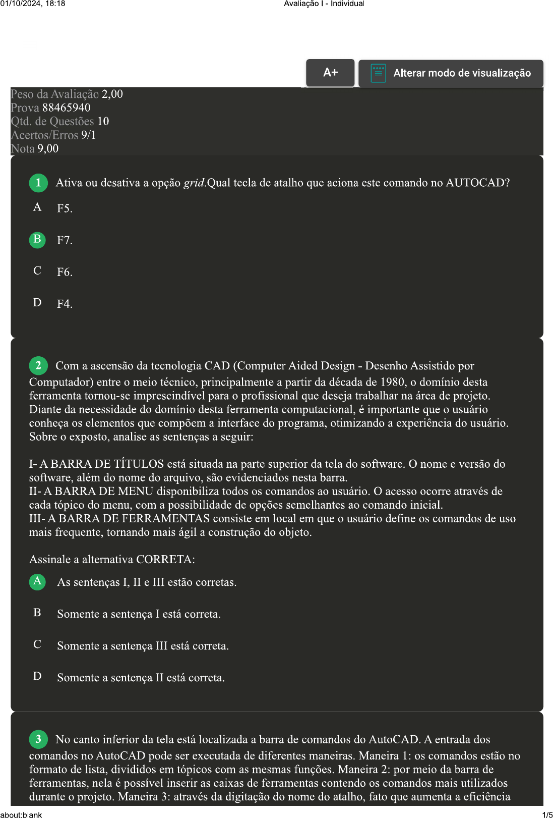 <p>01/10/2024, 18:18 Avaliação Individual A+ Alterar modo de visualização Peso da Avaliação 2,00 Prova 88465940 Qtd. de Questões 10 Acertos/Erros 9/1 Nota 9,00 1 Ativa ou desativa a opção grid.Qual tecla de atalho que aciona este comando no AUTOCAD? A F5. B F7. C F6. D F4. 2 Com a ascensão da tecnologia CAD (Computer Aided Design Desenho Assistido por Computador) entre meio técnico, principalmente a partir da década de 1980, domínio desta ferramenta tornou-se imprescindível para profissional que deseja trabalhar na área de projeto. Diante da necessidade do domínio desta ferramenta computacional, é importante que usuário conheça os elementos que compõem a interface do programa, otimizando a experiência do usuário. Sobre exposto, analise as sentenças a seguir: I- A BARRA DE TÍTULOS está situada na parte superior da tela do software. O nome e versão do software, além do nome do arquivo, são evidenciados nesta barra. II- A BARRA DE MENU disponibiliza todos os comandos ao usuário. O acesso ocorre através de cada tópico do menu, com a possibilidade de opções semelhantes ao comando inicial. III- A BARRA DE FERRAMENTAS consiste em local em que usuário define os comandos de uso mais frequente, tornando mais ágil a construção do objeto. Assinale a alternativa CORRETA: A As sentenças I, II e III estão corretas. B Somente a sentença I está correta. C Somente a sentença III está correta. D Somente a sentença II está correta. 3 No canto inferior da tela está localizada a barra de comandos do AutoCAD. A entrada dos comandos no AutoCAD pode ser executada de diferentes maneiras. Maneira 1: os comandos estão no formato de lista, divididos em tópicos com as mesmas funções. Maneira 2: por meio da barra de ferramentas, nela é possível inserir as caixas de ferramentas contendo os comandos mais utilizados durante projeto. Maneira 3: através da digitação do nome do atalho, fato que aumenta a eficiência about:blank 1/5</p><p>01/10/2024, 18:18 Avaliação Individual na elaboração do projeto. No que se refere à tecnologia CAD (Computer Aided Design/desenho auxiliado por computador), e as principais funções da barra de comandos, analise as sentenças a seguir: I- A barra de comandos é local de comunicação entre AutoCAD e usuário, realizando a interatividade. II- A barra de comandos proporciona aos profissionais uma melhoria da qualidade e uma maior precisão no desenvolvimento e dimensionamento dos projetos. III- A barra de comandos engloba funções de criação, abertura e salvamento de arquivos. IV- A barra de comandos engloba funções para inserir blocos, figuras e tabelas no desenho. V- Na barra de comandos, AutoCAD informa ações que estão sendo realizadas pelo usuário, enviando mensagens referentes a problemas que podem ter ocorrido durante a aplicação de um comando ou afirmando sua efetivação. Assinale a alternativa CORRETA: A As sentenças II, III e V estão corretas. B As sentenças I e II estão corretas. As sentenças I e V estão corretas. D As sentenças III e IV estão corretas. 4 No momento atual, os benefícios de utilização da tecnologia CAD (Computer Aided Design Desenho Assistido por Computador) são evidentes, relacionados à eficiência e à qualidade do desenho. Considerando os benefícios da utilização desta ferramenta computacional, praticamente impensáveis na metade do século XX, quando da sua criação, usuário precisa ter domínio sobre os elementos que constituem a interface do software AutoCAD para, avançar no desenvolvimento de projetos. Sobre exposto, classifique V para as sentenças verdadeiras e F para as falsas: ( ) A entrada de comandos no software AutoCAD pode ocorrer por dois meios: com uso do TECLADO ou com uso do MOUSE. ( A entrada de comandos através do TECLADO ocorre com seu cursor, selecionando comando na barra de ferramentas. ( ) A entrada de comandos através do MOUSE pode ocorrer por três modos: digitando nome completo do comando, digitando parte do nome e clicando com cursor sobre a alternativa desejada, digitando a abreviação do comando, todos na barra de comando. Assinale a alternativa que apresenta a sequência CORRETA: A B C D about:blank 2/5</p><p>01/10/2024, 18:18 Avaliação Individual 5 Para selecionar um comando utilizando a barra de MENU, deve-se clicar sobre um dos itens e, posteriormente, em uma das opções que aparecerão no formato de lista abaixo do item selecionado. Em alguns casos, a opção selecionada pode ser seguida de uma lista de sub opções ou uma caixa de diálogos na qual será necessário configurar alguns parâmetros para a aplicação da ação Cada tópico do MENU é caracterizado por apresentar um grupo de ações semelhantes. De acordo com AUTOCAD, qual comando que engloba as funções de visualização do desenho? A B File. C D Dimension. Revisar Conteúdo do Livro 6 Está localizada na parte superior da tela do AutoCAD. Quando se inicia um novo projeto, nome do software e a versão que está sendo utilizada ficam detalhados nela. No lado da versão, apresenta-se nome dado para arquivo e a extensão deste. No momento em que projeto é gravado no nome é atualizado pelo nome dado pelo usuário. Do que estamos falando? A Barra de títulos. B Barra de comando. C Barra de ferramentas. D Barra de menu. 7 No AutoCAD, os comandos básicos para desenhos podem ser acessados de diferentes maneiras de acordo com as preferências do usuário. Também estão disponibilizados para usuário três métodos de entradas de coordenadas, sendo estes os sistemas de coordenadas cartesianas, polares e ortogonais, representados pelas letras X: Y: Z. Sobre as coordenadas cartesianas, assinale a alternativa CORRETA: A As coordenadas cartesianas podem ser adicionadas como absolutas ou relativas. B Possibilitam que usuário desenhe com deslocamento nas direções horizontal e vertical, sendo isento da necessidade de informar a direção das coordenadas. C Não recomenda-se a uti