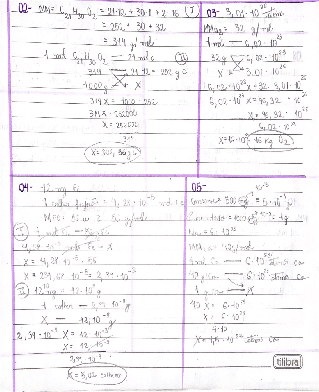 <p>02- MM= C 21 H 30 O2 = I 26 30 1-mol 6,02.10 1 mol C H II 32g 80 1000 X X 314 26 g 314X 6,02.10 23 252000 252000 6,02.1023 314 04- 12 mg FE 05- 1 5.10 56 w 2 56 = I Na 0 X 1 Ca 6.10 ca 23 X = 40 Ca II g 1 40 X= - of X = 4.10 X=1,5.10 22 tilibra</p><p>/ / 06- = 27 = 1,8 mg 1 mol Al 6.10 at N° = 9 27 g 6.1023 al MAC = 12u = 12 g/ mol 500 al X 1 C C 12g C C 2MX = X 23 27 X= 1025 12X 08 MM= 291 12 1 mol - 6-1023 atoms 291, of X 1 291 09- = 1 106g X 106 X = 132 X =132 10 = 106 X= MMc5 Hey O3 = + food 1 mol moleculor 168g 6.1023 168X = 168X = 168 X= tilibra</p>