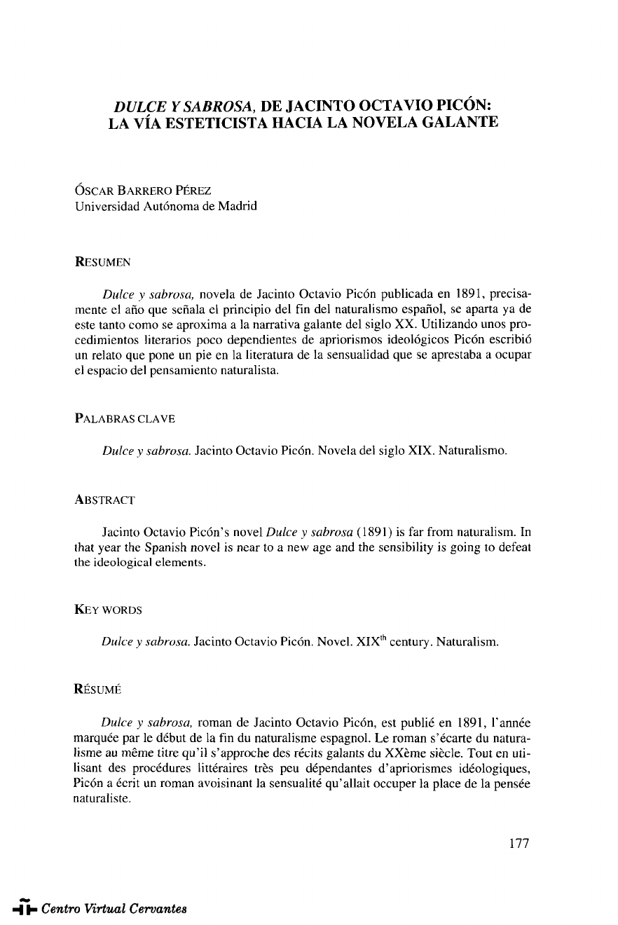 <p>DULCE Y SABROSA, D E J A C I N T O O C T A V I O P I C Ó N :</p><p>L A V Í A E S T E T I C I S T A H A C I A L A N O V E L A G A L A N T E</p><p>Ó S C A R B A R R E R O PÉREZ</p><p>Universidad Autónoma de Madrid</p><p>R E S U M E N</p><p>Dulce y sabrosa, novela de Jacinto Octavio Picón publicada en 1891, precisa</p><p>mente el año que señala el principio del fin del naturalismo español, se aparta ya de</p><p>este tanto como se aproxima a la narrativa galante del siglo XX. Utilizando unos pro</p><p>cedimientos literarios poco dependientes de apriorismos ideológicos Picón escribió</p><p>un relato que pone un pie en la literatura de la sensualidad que se aprestaba a ocupar</p><p>el espacio del pensamiento naturalista.</p><p>P A L A B R A S C L A V E</p><p>Dulce y sabrosa. Jacinto Octavio Picón. Novela del siglo X IX. Naturalismo.</p><p>ABSTRACT</p><p>Jacinto Octavio Picon's novel Dulce y sabrosa (1891) is far from naturalism. In</p><p>that year the Spanish novel is near to a new age and the sensibility is going to defeat</p><p>the ideological elements.</p><p>K E Y WORDS</p><p>Dulce y sabrosa. Jacinto Octavio Picón. Novel. X I X t h century. Naturalism.</p><p>R É S U M É</p><p>Dulce y sabrosa, roman de Jacinto Octavio Picon, est publié en 1891, l'année</p><p>marquée par le début de la f in du naturalisme espagnol. Le roman s'écarte du natura</p><p>lisme au même titre qu' i l s'approche des récits galants du XXème siècle. Tout en uti</p><p>lisant des procédures littéraires très peu dépendantes d'apriorismes idéologiques,</p><p>Picon a écrit un roman avoisinant la sensualité qu'allait occuper la place de la pensée</p><p>naturaliste.</p><p>177</p><p>ÓSCAR BARRERO PÉREZ</p><p>I</p><p>Si la propia confesión de un escritor se admite como indicio de una actitud</p><p>preconcebida hacia el hecho estético, no cabe duda de que Jacinto Octavio Picón</p><p>se preocupó de dejar clara la forma en que su novela Dulce y sabrosa (1891) de</p><p>bía ser asumida críticamente. Su defensa de lo natural sobre lo imaginado («Ad</p><p>vertencia» incluida en la edición de 1909) no logra compensar su adscripción al</p><p>bloque de los practicantes del arte por el arte (ibíd)1, n i , menos aún, su expreso</p><p>deseo de entretener (cf. la página «A quien leyere», escrita para la primera edi</p><p>ción de Dulce y sabrosa). ¿De qué manera conjugar, si ello es posible, tal caren</p><p>cia de propósito adoctrinador (también señalada explícitamente por el autor en la</p><p>mencionada «Advertencia») con la supuesta militancia en un movimiento litera</p><p>rio, el naturalismo, ciertamente nada propicio al ejercicio lúdico 2 ? Discutir la</p><p>existencia de un naturalismo español 3 sobrepasaría, obviamente, los límites im-</p><p>1. A. G. de Amezúa definió a Picón como «escritor realista, para quien la Estética se cifra</p><p>en la fórmula de el arte por el arte» (1925, p. XXXIV). La presencia de este autor en el capítulo</p><p>«El arte por el arte y el realismo» del libro de I. M. Zavala (1971) me parecería más pertinente</p><p>que su ausencia.</p><p>2. Esta es la misma pregunta que se hacía H. Gold, para quien «resulta difícil armonizar</p><p>estas declaraciones de neutralidad moral autorial con su posterior producción de una serie de no</p><p>velas perjudicadas en mayor o menor grado por una tendenciosidad que ni los más admirados</p><p>lectores en vida de Picón pudieron desconocer» (1983, p. 67). Si F. C. Sainz de Robles (1952)</p><p>considera a Picón como uno de los dos «verdaderos apóstoles del naturalismo» español (el otro</p><p>sería José Zahonero), W. T. Pattison (1965) recoge el nombre de nuestro autor en la nómina de</p><p>«autores naturalistas menores». Pero mucho más certero es el juicio de M. Baquero Goyanes</p><p>cuando escribe que «aunque Picón extraiga sus temas y sus personajes de la vida real y del am</p><p>biente contemporáneo, no pagó apenas tributo al naturalismo novelesco», que «no mereció la</p><p>atención del autor de Dulce y sabrosa fuera de alguna mención fugaz» (1958, p. 134). Ya J. Va-</p><p>lera lo había dejado dicho en 1900: Picón «propende a ser realista, ya que no naturalista» (1948,</p><p>p. 166). Naturalista, sin embargo, fue para muchos de sus contemporáneos, que incluso tomaron</p><p>como punto de referencia de su juicio Dulce y sabrosa, novela que, por ejemplo, J. Hurtado y Ji</p><p>ménez de la Sema y A. González Palencia consideraban «entre lo mejor que ha producido la es</p><p>cuela naturalista española» (1922, p. 1025). Por el contrario, cf. el juicio de E. Bobadilla (1892,</p><p>p. 33) sobre Picón: «¡Cuánto ganarían sus novelas si tuvieran el fondo científico de las del gran</p><p>dioso autor de Germinan». Una visión de los juicios que la labor de Picón mereció a sus con</p><p>temporáneos puede adquirirse en el artículo de E. Gutiérrez Díaz-Bernardo (1982).</p><p>3. Las muchas páginas escritas hasta hoy mismo sobre el particular no han servido para</p><p>despejar con claridad la incógnita principal: «¿Hay, pues, o no, auténtico naturalismo en Espa</p><p>ña?» (J. Oleza: 1984, p. 35). Y la respuesta prudente sigue siendo la misma que ya dio M. Etre-</p><p>178</p><p>MOTS-CLÉ</p><p>Dulce y sabrosa. Jacinto Octavio Picón. Roman. XIXème siècle. Naturalisme.</p><p>DULCE Y SABROSA, DE JACINTO OCTAVIO PICÓN</p><p>puestos para una anotación sobre una sola novela, pero tener en cuenta el dato</p><p>puede ser úti l no tanto para establecer la lejanía con respecto a aquella tendencia</p><p>como para fijar la proximidad en relación con el futuro cronológico representado</p><p>por la narrativa galante del siglo X X .</p><p>Es obligado coincidir con G. Sobejano 4 en que si algunos rasgos naturalistas</p><p>son detectables en Dulce y sabrosa (y, en un sentido más extenso, en la obra na</p><p>rrativa de Picón), se trata de apariciones aisladas. El autor es