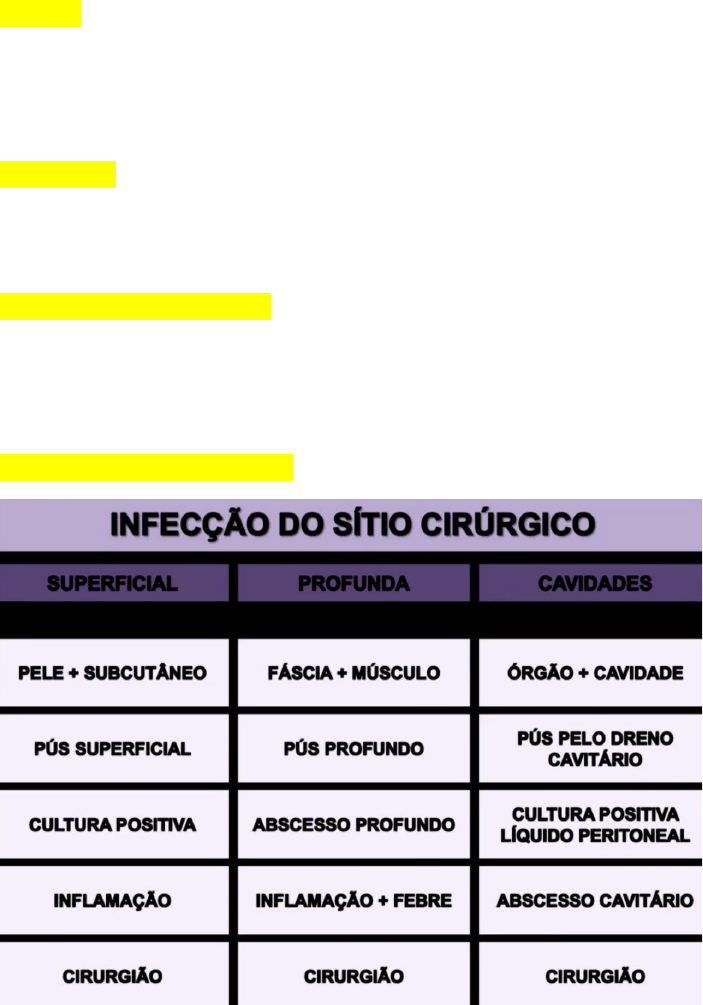 <p>Complicações de ferida cirúrgica</p><p>SEROMA – pode ser complicações precoce ou tardia de pos operatória, é a complicação mais comum de todas, é saída de agua amarelada, claro e limpa que sai da ferida operatório, é proveniente de vasos linfáticos e lipólise, prevenção: drenos de sução, tratamento: se for pequeno, conservador, e se for grande/volumoso e/ou tiver incomodando paciente, aspiração com agulha fina, caso não der certo ou tenha recidiva, devemos colocar dreno ou drenagem manua com corte</p><p>HEMATOMA- normalmente pro falha técnica do cirurgião, mais comum paciente paciente com caogulopatia ou algum distúrbios de hemostasia, é piro do que seroma, pelo risco de infecção muito mais alto, o sangue é um prato cheio para bactérias, o tratamento é com: drenagem ou se for pequeno compressão com calor (gelo nos nas primerias 48 horas de pos-operatorio), profilaxia: hemostasia correta + drenagem fechada (como hemovac)</p><p>DEISCÊNCIA DE APONEUROSE – pode ocorre nas primeiros dias após cirurgia, ou mais de 20 dias depois, pode ocasionar hernia incisional (muito dias após cirurgia) x evisceração (pouco dias depois da cirurgia). Costuma ocorre após 7-10 dias de pôs operatório, paciente pode evoluir com febre + dor + liquido saindo da ferida operatória (secreção cor de salmão “agua de carne”). Causas: falha técnica, infecção de ferida operatória, obesidade. Hernia incisional contida é caso de cirurgia eletiva, e evisceração é urgência/emergência cirúrgica</p><p>INFECÇÃO DO SITIO CIRÚRGICO:</p><p>· O pus na superficial é visível, o pus na profunda deve abria ferida, e na cavidades é so por imagem ou dreno cavitario</p><p>· Tratamento da infecção superficial: drenagem + irrigação</p><p>· Tratamento da infecção profunda: drenagem + irrigação + antibiótico</p><p>· Tratamento da infecção intracavitário: drenagem guiada por TC ou USG + antibiótico</p><p>image1.png</p>