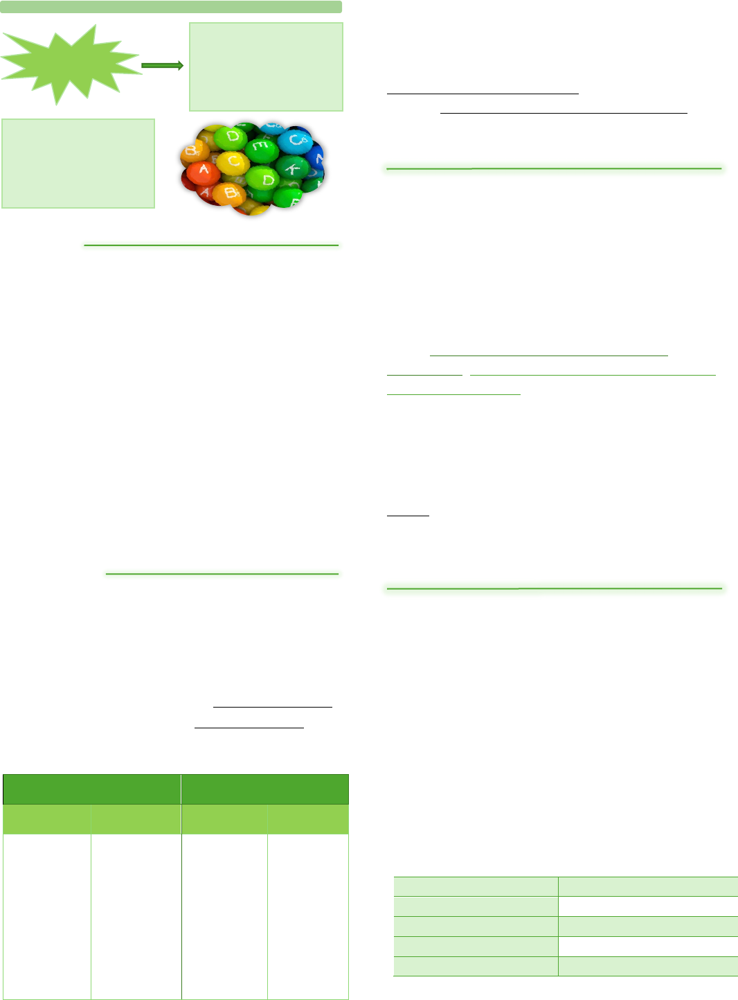 <p>08 MAR 2025 PROCESSOS BIOLÓGICOS- PROF. ILZA</p><p>BIANCA DETONI BARBOSA MED VET</p><p>Vitaminas e Sais minais</p><p>MACRONUTRIENTES</p><p>- Carboidrato</p><p>- Proteínas</p><p>- Lipídios</p><p>MICRONUTRIENTES</p><p>- Vitaminas</p><p>- Minerais</p><p>Vitaminas</p><p>Substâncias orgânicas (são considerados</p><p>compostos orgânicos por serem baseadas em</p><p>CARBONO) essenciais - obtidas pelo alimento</p><p>e/ou suplementação, uma vez que o organismo</p><p>não consegue fabricá-la.</p><p>A maioria das vitaminas necessárias no nosso</p><p>organismo atua como coenzima, e, portanto,</p><p>devem ser adquiridas através da alimentação.</p><p>Atuam diretamente na ativação e regulagem do</p><p>metabolismo, contribuindo para formação de</p><p>enzimas, hormônios e moléculas importantes</p><p>para as funções biológicas.</p><p>Sais minerais</p><p>Substância inorgânicas baseadas em cátions e</p><p>íons metálicos. Também são essenciais para o</p><p>corpo - adquiridos regularmente por meio dos</p><p>alimentos ou suplementos alimentares</p><p>2 tipos:</p><p>Hidrossolúvel: podem ser dissolvidos em água</p><p>Lipossolúveis: que tem baixa solubilidade e</p><p>normalmente são armazenados/aproveitados pelo</p><p>nosso corpo.</p><p>Funções</p><p>• VITAMINAS</p><p>A- conhecida por ajudar na visão</p><p>D- auxilia na absorção de cálcio, na formação e</p><p>manutenção de ossos e dentes - a falta dela</p><p>provoca raquitismo (deficiência de vitamina D)</p><p>E- Envelhecimento da pele</p><p>K- Estimula coagulação sanguínea</p><p>.</p><p>C- Imunidade e ajuda na absorção do ferro</p><p>B1- metabolismo dos carboidratos (controla gasto</p><p>energético das células)</p><p>B2- controla o uso das gorduras + participa da</p><p>produção sanguínea.</p><p>B3- ajuda converter o alimento em glicose, utilizada</p><p>para produzir a energia.</p><p>B5- “faz tudo” do nosso organismo – relacionada</p><p>com a saúde óssea (a partir da produção de</p><p>vitamina D), cardíaca (com o controle dos níveis de</p><p>colesterol no sangue)</p><p>B6- metaboliza as proteínas, carboidratos e gordura+</p><p>ajuda na defesa do organismo.</p><p>B7- recuperação da saúde dos cabelos, fortalecimento</p><p>das unas e aspecto geral da pele</p><p>B9- papel importante na produção de hemácias, na</p><p>síntese de DNA e na manutenção da função</p><p>cognitiva</p><p>B12- a produção de DNA, o metabolismo do ácido</p><p>fólico (vitamina B9) + produção de glóbulos vermelhos</p><p>.</p><p>• SAIS MINERAIS</p><p>Cálcio- saúde dos ossos e dentes</p><p>Ferro- síntese da hemoglobina (mantem quant.</p><p>normal das hemácias – evita anemia.</p><p>Sódio- permite a transmissão de informações entre</p><p>as células nervosas e regulador da pressão arterial.</p><p>Potássio- desempenho dos músculos</p><p>Iodo- síntese dos hormônios produzidos pela tireoide</p><p>Zinco- atividade de enzimas envolvidas diretamente</p><p>com a síntese de DNA e RNA.</p><p>Fósforo- ajuda/fortalece a estrutura óssea</p><p>Magnésio- regulação da pressa arterial-saúde</p><p>cardiovascular.</p><p>VITAMINAS SAIS MINERAIS</p><p>Hidrossolúvel Lipossolúvel Macro Micro</p><p>C</p><p>B1 (tiamina)</p><p>B2 (riboflavina)</p><p>B3 (niacina)</p><p>B5 (ác. Pantotênico)</p><p>B6 (piridoxina)</p><p>B7 (biotina)</p><p>B9 (ác. Fólico)</p><p>B12 (cobalamina)</p><p>A</p><p>D</p><p>E</p><p>K</p><p>Cálcio</p><p>Magnésio</p><p>Fósforo</p><p>Potássio</p><p>Sódio</p><p>Cloro</p><p>Iodo</p><p>Zinco</p><p>Selênio</p><p>Ferro</p><p>Manganês</p><p>Cobre</p><p>Boro</p><p>Cromo</p><p>Molibdênio</p><p>Micro/função oxidante Vit. C, E, A e zinco</p><p>Micro/metab. ósseo VIT. D, k e cálcio</p><p>Micro/metab.energético Vit. B1, B2, B3, B5, B6, B7</p><p>Micro/metab. celular Sódio, potássio e cloro</p><p>Micro/ anemias FERRO, vit. B12 E B9</p><p>ENERGIA</p>