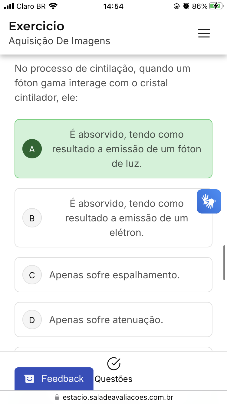 <p>Claro BR 14:54 86% Exercicio Aquisição De Imagens No processo de cintilação, quando um fóton gama interage com o cristal cintilador, ele: É absorvido, tendo como A resultado a emissão de um fóton de luz. É absorvido, tendo como B resultado a emissão de um elétron. C Apenas sofre espalhamento. D Apenas sofre atenuação. Feedback Questões estacio.saladeavaliacoes.com.br</p>