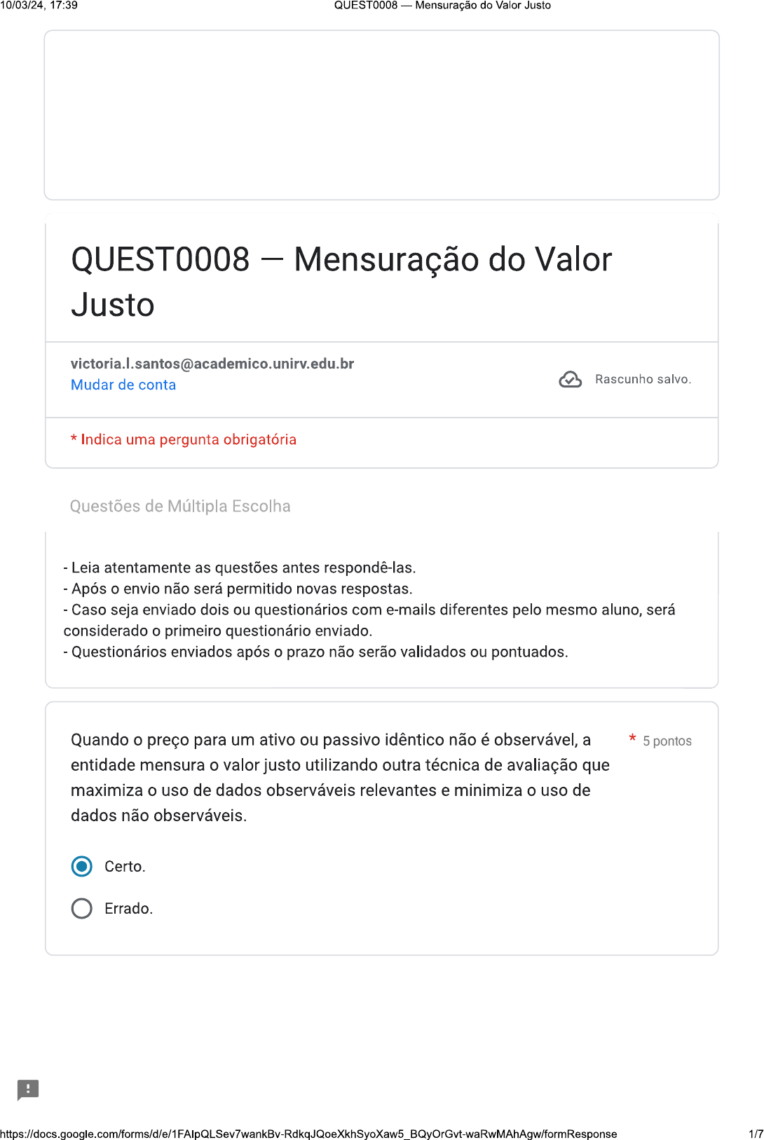 <p>10/03/24, 17:39 QUEST0008 - Mensuração do Valor Justo QUEST0008 - Mensuração do Valor Justo Mudar de conta Rascunho salvo. * Indica uma pergunta obrigatória Questões de Múltipla Escolha - Leia atentamente as questões antes respondê-las. - Após o envio não será permitido novas respostas. - Caso seja enviado dois ou questionários com e-mails diferentes pelo mesmo aluno, será considerado o primeiro questionário enviado. - Questionários enviados após o prazo não serão validados ou pontuados. Quando o preço para um ativo ou passivo idêntico não é observável, a * 5 pontos entidade mensura o valor justo utilizando outra técnica de avaliação que maximiza o uso de dados observáveis relevantes e minimiza o uso de dados não observáveis. Certo. Errado. ! 1/7</p><p>10/03/24, 17:39 QUEST0008 - Mensuração do Valor Justo As características que os participantes de mercado levam em * 5 pontos consideração para mensuração do valor justo, incluem, a condição e localização do ativo, e ainda, as restrições para a venda ou uso desse ativo, se houver. Certo. Errado. Após o reconhecimento inicial, ao mensurar o valor justo utilizando uma * 5 pontos técnica ou técnicas de avaliação que utilizem dados não observáveis, a entidade deve assegurar que essas técnicas de avaliação reflitam dados de mercado observáveis na data de mensuração. Certo. Errado. Os custos de transação não são uma característica de um ativo ou * 5 pontos passivo; em vez disso, são específicos de uma transação e podem diferir dependendo de como a entidade realizar a transação para o ativo ou passivo. Certo. Errado. melhor uso possível de um ativo não financeiro leva em conta o uso do * 5 pontos ativo que seja fisicamente possível, legalmente permitido e financeiramente viável. Certo. Errado. ! 2/7</p><p>10/03/24, 17:39 QUEST0008 Mensuração do Valor Justo A definição de valor justo se concentra em ativos e passivos porque eles * 5 pontos são o objeto primário da mensuração contábil. Certo. Errado. Se a localização for uma característica do ativo, o preço no mercado * 5 pontos principal (ou mais vantajoso) não deve ser ajustado para refletir os custos, se houver, que seriam incorridos para transportar o ativo de seu local atual para esse mercado. Certo. Errado. Uma mudança na técnica de avaliação ou em sua aplicação é apropriada * 5 pontos se a mudança resultar em uma mensuração que seja igualmente ou mais representativa do valor justo nas circunstâncias. Certo. Errado. Em alguns casos, uma única técnica de avaliação é apropriada (por * 5 pontos exemplo, ao avaliar uma tivo ou um passivo utilizando preços cotados em mercado ativo para ativos ou passivos idênticos). Em outros casos, múltiplas técnicas de avaliação são apropriadas (esse pode ser o caso, por exemplo, ao avaliar uma unidade geradora de caixa). Certo. Errado. ! 3/7</p><p>10/03/24, 17:39 QUEST0008 - Mensuração do Valor Justo A mensuração do valor justo presume que a transação para a venda do * 5 pontos ativo ou transferência do passivo ocorre no mercado principal ou, na ausência desse, no mercado mais vantajoso. Certo. Errado. A entidade deve selecionar informações que sejam consistentes com as * 5 pontos características do ativo ou passivo, as quais seriam levadas em conta por participantes do mercado em transação com o ativo ou passivo. Certo. Errado. mercado principal (ou mais vantajoso) (e, assim, os participantes do * 5 pontos mercado) deve ser considerado do ponto de vista da entidade, permitindo assim diferenças entre entidades com atividades diferentes. Certo. Errado. A entidade deve mensurar o valor justo de um ativo ou passivo utilizando * 5 pontos as premissas que os participantes do mercado utilizariam ao precificar o ativo ou o passivo, presumindo-se que os participantes do mercado ajam em seu melhor interesse econômico. Certo. Errado. ! 4/7</p><p>10/03/24, 17:39 QUEST0008 Mensuração do Valor Justo Quando um preço cotado para a transferência de um passivo ou * 5 pontos instrumento patrimonial próprio da entidade idêntico ou similar não está disponível, e o item idêntico é mantido por outra parte como um ativo, a entidade deve mensurar o valor justo do passivo ou instrumento patrimonial do ponto de vista de um participante do mercado que detenha o item idêntico como ativo na data de mensuração. Certo. Errado. Os custos de transação não incluem custos de transporte. * 5 pontos Certo. Errado. A mensuração do valor justo presume que o ativo ou o passivo é trocado * 5 pontos em uma transação não forçada entre participantes do mercado para a venda do ativo ou a transferência do passivo na data de mensuração nas condições atuais ou passadas de mercado. Certo. Errado. A entidade deve utilizar técnicas de avaliação que sejam apropriadas nas * 5 pontos circunstâncias e para as quais haja dados suficientes disponíveis para mensurar o valor justo, maximizando ouso de dados não observáveis relevantes e minimizando o uso de dados observáveis. Certo. Errado. ! 5/7</p><p>10/03/24, 17:39 QUEST0008 - Mensuração do Valor Justo A entidade deve identificar características que distinguem os * 5 pontos participantes do mercado de modo geral, considerando fatores gerais, tais como, ativo ou passivo, mercado principal ou mais vantajoso para esse ativo ou passivo, participantes de mercado com os quais a empresa realizaria uma transação de mercado. Certo. Errado. Na ausência de evidência em contrário, presume-se que o mercado no * 5 pontos qual a entidade normalmente realizaria a transação para a venda do ativo ou para a transferência do passivo seja o mercado mais vantajoso ou, na ausência de desse, o mercado principal. Certo. Errado. A hierarquia de valor justo prioriza as informações (inputs) das técnicas * 5 pontos de avaliação e não as técnicas de avaliação utilizadas para mensurar o valor justo. Certo. Errado. Vol