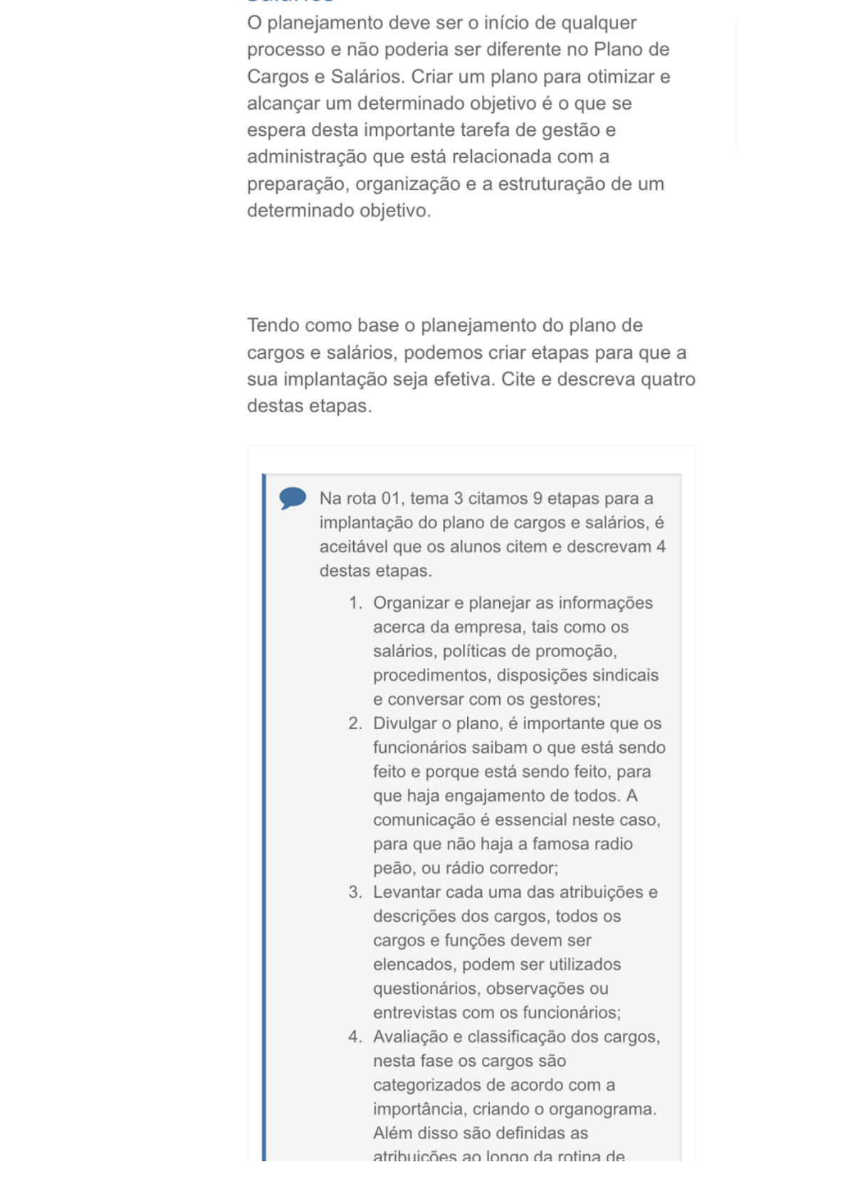 <p>planejamento deve ser o início de qualquer processo e não poderia ser diferente no Plano de Cargos e Salários. Criar um plano para otimizar e alcançar um determinado objetivo é o que se espera desta importante tarefa de gestão e administração que está relacionada com a preparação, organização e a estruturação de um determinado objetivo. Tendo como base o planejamento do plano de cargos e salários, podemos criar etapas para que a sua implantação seja efetiva. Cite e descreva quatro destas etapas. Na rota 01, tema 3 citamos 9 etapas para a implantação do plano de cargos e salários, é aceitável que os alunos citem e descrevam 4 destas etapas. 1. Organizar e planejar as informações acerca da empresa, tais como os salários, políticas de promoção, procedimentos, disposições sindicais e conversar com os gestores; 2. Divulgar o plano, é importante que os funcionários saibam o que está sendo feito e porque está sendo feito, para que haja engajamento de todos. A comunicação é essencial neste caso, para que não haja a famosa radio peão, ou rádio corredor; 3. Levantar cada uma das atribuições e descrições dos cargos, todos os cargos e funções devem ser elencados, podem ser utilizados questionários, observações ou entrevistas com os funcionários; 4. Avaliação e classificação dos cargos, nesta fase os cargos são categorizados de acordo com a importância, criando o organograma. Além disso são definidas as atribuições ao longo da rotina de</p><p>Questão 2/5 - Gestão de Cargos e Salários Quando iniciamos um plano de cargos e salários precisamos do organograma da empresa, caso ela não tenha, precisamos desenhá-lo, este é o primeiro passo. Depois são desenhados os cargos e organizados de acordo com a hierarquia de cada um, o passo seguinte é separar os cargos por área de atuação (RH, administrativo-financeiro, qualidade, marketing...) assim fica claro para o colaborador qual deve ser o encaminhamento conforme o setor da empresa. Falando sobre organogramas, esta ferramenta nos ajuda a identificar os cargos de todos os funcionários da empresa. Em um organograma temos as linhas de comunicação que interligam os cargos e indicam a hierarquia entre os setores, as caixinhas são chamadas de unidades de trabalho ou cargos, a linha de hierarquia é de cima para baixo e as unidades que estão na mesma linha possuem o mesmo nível hierárquico. Temos o organograma vertical, circular ou radial, horizontal, funcional, linear de responsabilidade, matricial e em barras. Para uma empresa mais moderna qual o tipo mais indicado? Explique por que este é o mais indicado. Circular ou radial é considerado um modelo mais moderno de organograma. Nele, os níveis mais elevados estão dispostos no centro, com o nível hierárquico diminuindo sucessivamente nas camadas mais externas do gráfico. Muitas empresas utilizam esse modelo de organograma por acreditar que ele transmite melhor uma ideia de colaboração entre as áreas de diferentes níveis, sem valorizar de forma excessiva a questão da hierarquia. (rota 01, tema 04) Resposta:</p><p>Plano de Carreira em Y Em organizações como essa, existe um modelo de crescimento conhecido como carreira em Y. Inspirado pelo desenho da letra, esse plano sugere que, a partir de um determinado cargo, o funcionário encontra uma bifurcação: ele precisa escolher se segue carreira de especialista ou de gestor. Plano de Carreira em W Assim como plano em Y apresenta dois caminhos possíveis de crescimento, plano em W, sugere um terceiro que é o misto dos outros dois. Em vez de seguir como especialista ou gestor, profissional pode se tornar um gestor de projetos. Ele não chega a ser um líder tradicional, responsável pelo desenvolvimento de outras pessoas, mas acompanha pontualmente o desempenho dessas pessoas dentro de um projeto específico dando feedbacks mais técnicos e atuando de forma consultiva. (Fonte: https://www.sebrae.com.br/sites/PortalSebrae/artigo s/plano-de-carreira-o-que-e-e-com criar,66d839f5192ed510VgnVCM1000004c00210aR CRD) Para uma área de pesquisa e desenvolvimento em que o conhecimento é estratégico para a organização qual das duas carreiras é a mais comum? Por que seguir esta linha? Explique Uma área de pesquisa e desenvolvimento, por exemplo, em que conhecimento é estratégico para a organização, a carreira Y é bem comum. Desse profissional, é esperado um papel revolucionário dentro da organização. Que ele seja capaz de trazer inovações, como no caso do lançamento de novos produtos, ajudando a empresa a se manter à frente da concorrência, a partir da sua bagagem de conhecimento especializado. Na prática, Y é mais usado porque as carreiras de gestão e de especialista têm espaços diferentes dentro da organização. Notamos que a principal característica deste plano é quebrar padrão de crescimento linear, onde a promoção só poderia ser a cargos gerenciais, e neste caso também abre a oportunidade para os técnicos de alto</p><p>PLANO DE CARGOS E SALÁRIOS Publicado em: 19/10/2020 Por: Bianca Andrade Pesquisa salarial é uma das principais ferramentas do RH de uma empresa. Ela serve como base para a tomada de decisões muito importantes que podem definir a satisfação, permanência e atração dos melhores talentos do mercado. Mas, para isso, é importante que ela seja realizada de forma eficaz, seguindo alguns critérios. A pesquisa salarial é uma ferramenta que permite ao RH analisar o cenário da remuneração dos profissionais no mercado e, assim, manter o equilíbrio interno e externo do seu plano de cargos e salários. Ela também contribui para que a empresa se posicione de forma estratégica em relação aos cargos mais relevantes, oferecendo recompensas organizacionais mais atrativas que os principais concorrentes. A pesquisa salarial deve ser pensada de forma criteriosa, considerando o cenário atual da empresa e seus principais objetivos. Também é