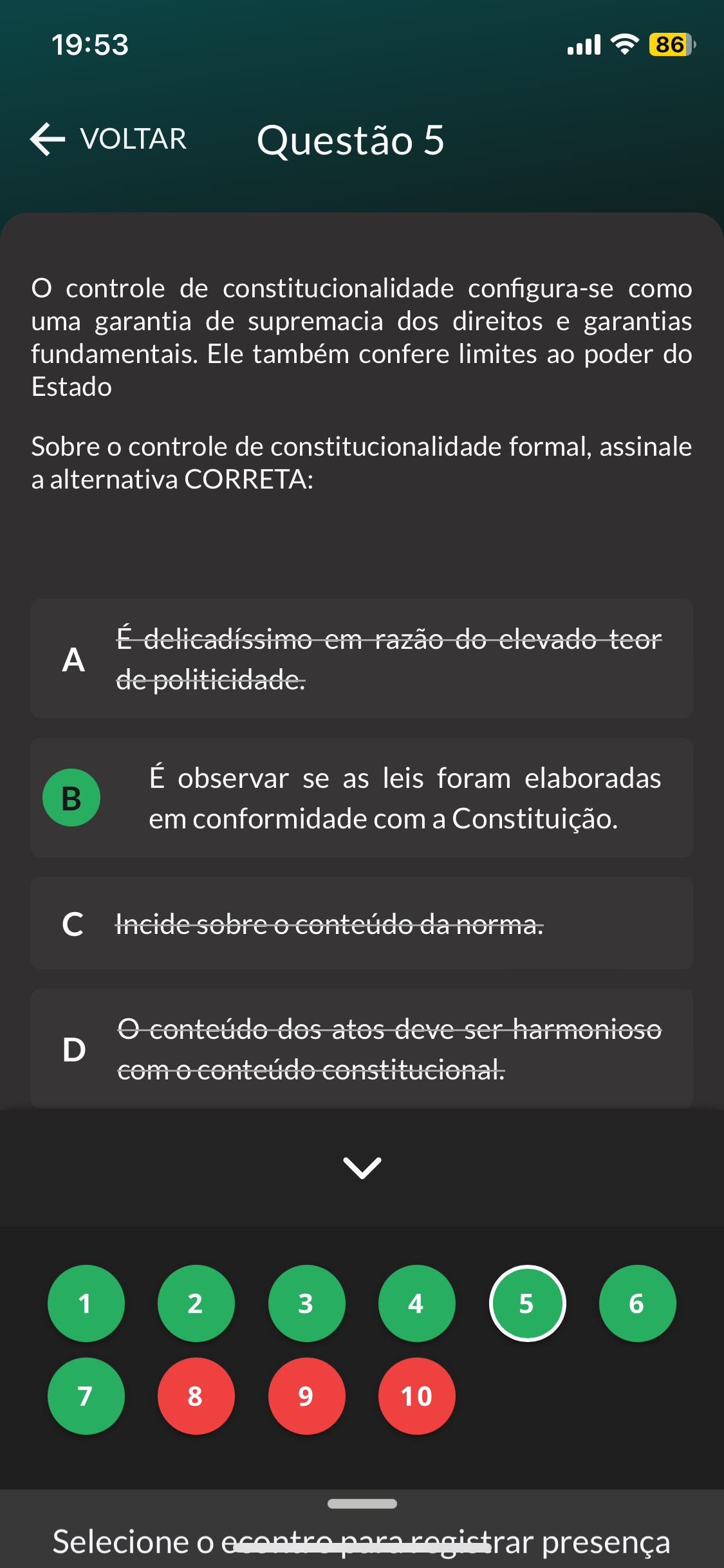 <p>19:53 86 VOLTAR Questão 5 O controle de constitucionalidade configura-se como uma garantia de supremacia dos direitos e garantias fundamentais. Ele também confere limites ao poder do Estado Sobre controle de constitucionalidade formal, assinale a alternativa CORRETA: É em razão elevado A de politicidade. É observar se as leis foram elaboradas em conformidade com a Constituição. C Incide sobre conteúdo da norma. e conteúdo dos atos deve ser harmoniose D com conteúdo constitucional. 1 2 3 4 5 6 7 8 9 10 Selecione O para registrar presença</p>