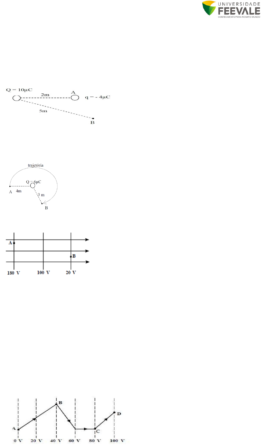 <p>LISTA DE EXERCÍCIOS TRABALHO ELÉTRICO</p><p>1. Uma pequena esfera recebe uma carga de 40µC, e outra esfera de diâmetro igual, localizada a 20 cm de distância, recebe uma</p><p>carga de –10µC. a) Qual a força de atração entre elas? Resp. 90N.</p><p>b) Colocando as esferas em contato e afastando-as 5 cm, determine a nova força de interação elétrica entre elas. Resp. 810 N</p><p>2. O esquema abaixo representa cargas elétricas posicionadas no vácuo.</p><p>a) Calcule o trabalho realizado pela força elétrica para levar q do ponto A para o ponto B. Dê o significado físico desse trabalho.</p><p>b) Calcule o trabalho se a carga q fosse levada do ponto B para o ponto A.</p><p>3. Uma carga elétrica q = 2 µC vai ser transportada do ponto A para o ponto B do esquema abaixo, segundo a trajetória indicada.</p><p>Sabe – se que elas encontram – se no vácuo.</p><p>a) Calcule o trabalho realizado pela força elétrica</p><p>b) Se o deslocamento fosse feito por outra trajetória, qual seria o trabalho realizado?</p><p>4. Na figura, são indicadas as linhas de força de um campo elétrico uniforme e as superfícies equipotenciais. Calcule o trabalho</p><p>realizado pela força elétrica, para deslocar uma carga</p><p>de 2 µC de A até B. Esse movimento é espontâneo ou forçado?</p><p>5. Uma carga elétrica q = - 5 mC, vai ser transportada do infinito até um ponto A, onde sua energia potencial vale 1200J.</p><p>a) Determine o trabalho no deslocamento citado acima.</p><p>b) Esse movimento é forçado ou espontâneo? Explique.</p><p>c) Calcule o potencial elétrico no ponto A.</p><p>6) Uma carga puntiforme fixa de 2µC gera, num ponto A do espaço, um potencial elétrico de 18 x 104 V e num ponto B um potencial</p><p>de 6 x 104</p><p>V. Pergunta-se:</p><p>a) Qual a distância entre o ponto A e a carga fixa ?</p><p>b) Qual a distância entre o ponto B e a carga fixa ?</p><p>c) Calcule o trabalho realizado por um operador para transportar uma carga de 1µC de B a A.</p><p>7) Um elétron q = -1,6 x 10-19 C é levado de um ponto A a um ponto B, diametralmente opostos, numa superfície esférica</p><p>equipotencial de 50 V. Sendo o raio da superfície 1m,determine o trabalho da força elétrica nesse deslocamento.</p><p>8) A figura representa, esquematicamente, várias superfícies equipotenciais de um campo elétrico.</p><p>a) Determine o trabalho realizado pela força elétrica para levar uma carga q = 10µC do ponto A ao ponto D, pelo caminho indicado.</p><p>b) qual seria o trabalho realizado se fosse levada de A para D por outro caminho?</p><p>9) Um elétron deixa a superfície de um metal com energia cinética igual a 10 eV e penetra em uma região na qual é acelerado por</p><p>um campo elétrico uniforme de intensidade igual a 1,0 x 104 V/m.</p><p>Considere que o campo elétrico e a velocidade inicial do elétron têm a mesma direção e sentidos opostos.</p><p>Calcule a energia cinética do elétron, em J, logo após percorrer os primeiros 10 cm a partir da superfície do metal.</p>