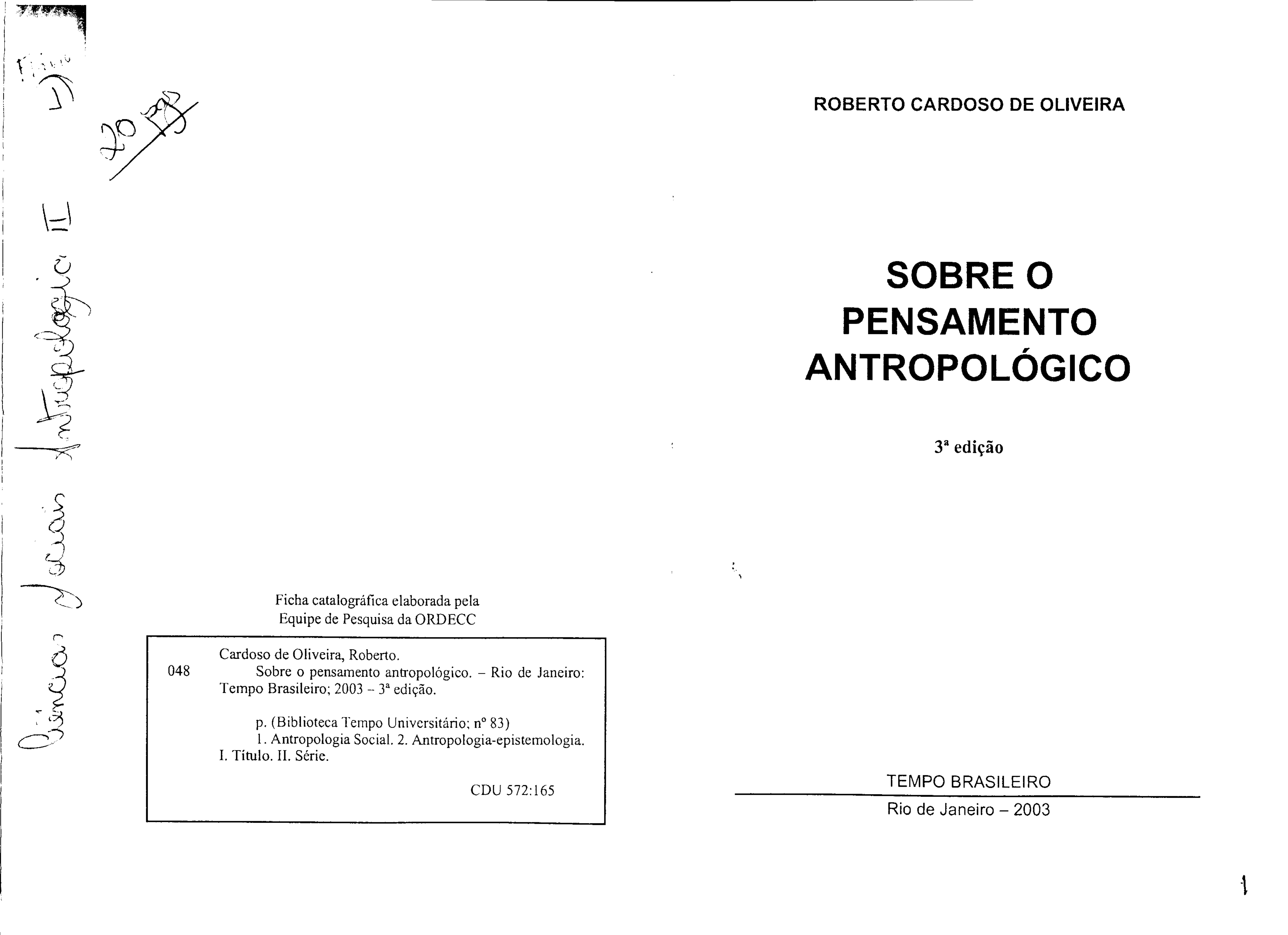 <p>ROBERTO CARDOSO DE OLIVEIRA 20 SOBRE PENSAMENTO ANTROPOLÓGICO edição Ficha catalográfica elaborada pela Equipe de Pesquisa da ORDECO Cardoso de Oliveira, Roberto. 048 Sobre o pensamento antropológico. - Rio de Janeiro: Tempo Brasileiro; 2003 - edição. p. (Biblioteca Tempo Universitário; n° 83) 1. Antropologia Social. 2. Antropologia-epistemologia I. Título. II. Série. TEMPO BRASILEIRO CDU 572:165 Rio de Janeiro - 2003</p><p>A FORMAÇÃO DA DISCIPLINA CAPÍTULO 1 TEMPO E TRADIÇÃO: INTERPRETANDO A ANTROPOLOGIA Há quase trinta anos, em 1955, quando numa reunião como esta nossa Associação elegia sua primeira diretoria, no mesmo ano e na Europa, numa pequena cidade da Normandia, o filósofo alemão Mar- tin Heidegger se questionava sobre o SER da filosofia em sua confe- rência de abertura de um colóquio A importância da reflexão heideggeriana estava no fato de exprimir ao formular aquela questão - uma nova tendência de seu pensamento (que a his- : tória registraria como o segundo Heidegger) pautada no esmiuça- mento da tradição e da linguagem, submetidas ambas a um infindável exercício hermenêutico. Não é minha intenção tentar aqui igual exercício com relação à minha disciplina, a antropologia empresa, aliás, demasiadamente grande para um etnólogo. Mas, a meu ver, a proposta heideggeriana bem que pode ser aceita, porém nos termos de uma etnologia moder- na, ou antropologia social, vista básica, ainda que não exclusivamen- te, como uma disciplina interpretativa; ela própria possuidora de ins- trumentos que lhe permitam poder alcançar um grau de compreensão de si, estranhando-se a si própria de modo a realizar aquele "espan- to" de que fala o filósofo e que tão bem caracteriza o SER da filosofia; e que, de certa maneira, está presente em toda boa etnologia em seu encontro com "O espanto carrega a filosofia e impera em seu 13</p><p>interior" disse Heidegger naquela oportunidade. Soaria absurdo ginar destituído de qualquer "bias" ou "parti pris", gostaria de dar se substituíssemos, na frase, filosofia por antropologia? Ou em ou- início à minha interpretação da antropologia social ou cultural pelo tras palavras não seria a boa etnografia função dessa mesma capa- registro de meu primeiro espanto: porque nós, autores e atores do cidade de espantar-se, menos talvez com o outro, mas certamente processo de constituição e desenvolvimento da disciplina (ou mesmo mais consigo mesmo, com esse "estranho" modo de conhecer que de sua transplantação para outras latitudes), tendemos a abdicar de para nós se configura ser a antropologia? Conhecer o outro e pensá-la em seus fundamentos, i. é, como uma modalidade de conhe- conhecer-se não são, afinal de contas, para essa modalidade de an- cimento que é, para nos interrogarmos quase que exclusivamente so- tropologia, as faces de uma mesma moeda? O que é, afinal de contas, bre os modos de viver, de pensar e de conhecer de outros povos ou de a antropologia? diferentes setores da sociedade a que pertencemos? Se nós mesmos, Comecemos pelo nosso espanto diante do outro, absolutamente enquanto antropólogos, membros de uma comunidade intelectual, mais fácil de ocorrer (e de se compreender) na prática da pesquisa et- constituímos uma sorte de "cultura", cujas origens não estão aqui, nológica. Espanto que não é difícil de entender quando o objeto é o em nosso continente, mas em nossa formação profissional estão pre- outro, particularmente outras sociedades, outras culturas, diferen- sentes, por que então não tomarmos essa "cultura" como objeto pri- tes da nossa; ou mesmo quando, por uma forma de atitude metodoló- vilegiado de nossas indagações? gica, nos transformamos no outro para usarmos uma expressão Se quisermos evitar uma longa e, neste momento, inviável regres- merleau-pontyana e nos voltamos para o estudo de nossa própria são histórica às nossas origens, pelo menos podemos tentar aqui e sociedade: de resto, um desideratum, que crescentemente a antropo- agora captar a essência das tradições que cultivamos (e muitas ve- logia atual busca realizar. Mas como - cabe perguntar podemos zes cultuamos), inscrita nos paradigmas (quem sabe, nossos mitos) nos espantar com nossa própria disciplina? Ao que parece o nosso es- que conformam aquilo que se poderia chamar de "matriz disciplinar" tranhamento diante do outro inibiu historicamente o nosso espanto da antropologia. A esta altura, vê-se que estou distinguindo para- frente à antropologia: produto, ela própria de nossa história, da digma de matriz disciplinar, ao contrário de Thomas Kuhn esse ria do saber ocidental e, de uma maneira toda especial, da cultura excepcional historiador da ciência que os considera sinônimos, científica melhor diria, cientificista instaurada no Iluminismo e fundindo-os num único conceito. Para mim, uma matriz disciplinar é tão fortemente presente em nosso campo intelectual. que esses úl- a articulação sistemática de um conjunto de paradigmas, a condição timos três séculos nos ensinaram sobre essa cultura cientificista e o de coexistirem no tempo, mantendo-se todos e cada um ativos e rela- que este século nos fala sobre a antropologia social, considerando que tivamente eficientes. A diferença das ciências naturais, que os regis- se a datarmos a partir de Durkheim, na tradição intelectualista ou ra- tram em sucessão - num processo contínuo de substituição na cionalista européia continental, ou a partir de Rivers na tradição em- antropologia social os vemos em plena simultaneidade, sem que o pirista ou, ainda, em Boas no culturalismo norte-ameri- novo paradigma elimine o anterior pela via das "revoluções científi- cano, ela estaria prestes a completar um século! Debruçar-se sobre cas" de que nos fala Khun, mas aceite a convivência, muitas vezes suas raízes - e sobre suas rupturas é mais do que um exercício num mesmo país, outras vezes numa mesma instituição.