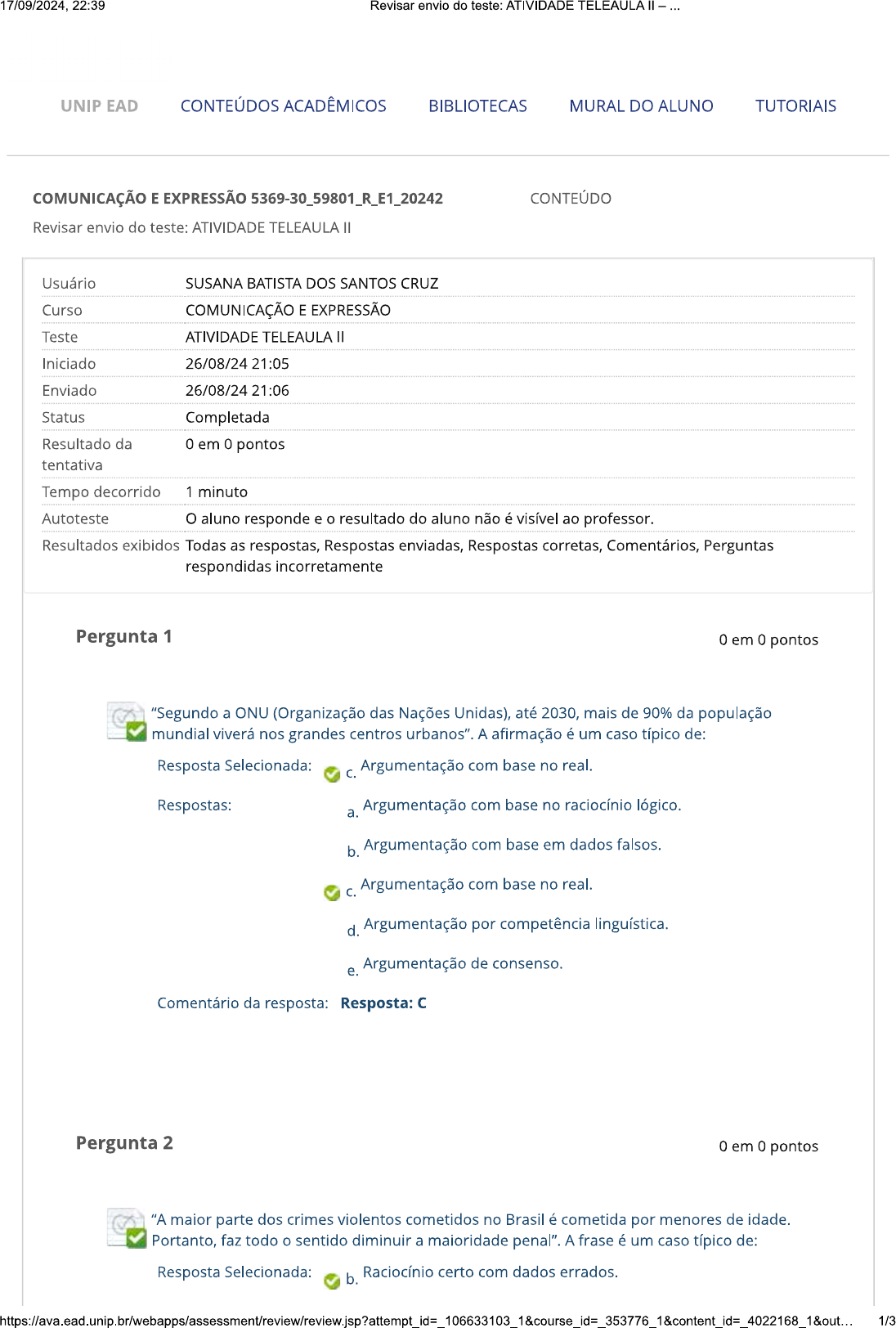 <p>17/09/2024, 22:39 Revisar envio do teste: ATIVIDADE TELEAULA - UNIP EAD CONTEÚDOS ACADÊMICOS BIBLIOTECAS MURAL DO ALUNO TUTORIAIS COMUNICAÇÃO E EXPRESSÃO 5369-30_59801_R_E1_20242 CONTEÚDO Revisar envio do teste: ATIVIDADE TELEAULA II Usuário SUSANA BATISTA DOS SANTOS CRUZ Curso COMUNICAÇÃO E EXPRESSÃO Teste ATIVIDADE TELEAULA Iniciado 26/08/24 21:05 Enviado 26/08/24 21:06 Status Completada Resultado da 0 em 0 pontos tentativa Tempo decorrido 1 minuto Autoteste aluno responde e o resultado do aluno não é visível ao professor. Resultados exibidos Todas as respostas, Respostas enviadas, Respostas corretas, Comentários, Perguntas respondidas incorretamente Pergunta 1 0 em 0 pontos "Segundo a ONU (Organização das Nações Unidas), até 2030, mais de 90% da população mundial viverá nos grandes centros urbanos". A afirmação é um caso típico de: Resposta Selecionada: C. Argumentação com base no real. Respostas: a. Argumentação com base no raciocínio lógico. b. Argumentação com base em dados falsos. C. Argumentação com base no real. d. Argumentação por competência linguística. e. Argumentação de consenso. Comentário da resposta: Resposta: Pergunta 2 0 em 0 pontos "A maior parte dos crimes violentos cometidos no Brasil é cometida por menores de idade. Portanto, faz todo o sentido diminuir a maioridade penal". A frase é um caso típico de: Resposta Selecionada: b. Raciocínio certo com dados errados. 1/3</p><p>17/09/2024, 22:39 Revisar envio do teste: ATIVIDADE TELEAULA - Respostas: Raciocínio errado com dados certos. a. Raciocínio certo com dados errados. b. Raciocínio errado com dados errados. C. d. Raciocínio certo com dados certos. Raciocínio equivocado com dados errados. e. Comentário da resposta: Resposta: B Pergunta 3 0 em 0 pontos A ausência de parágrafos é uma regra: Resposta Selecionada: Nas atas de reunião. a. Respostas: Nas atas de reunião. a. b. Nas mensagens inbox. C. Nos relatórios técnicos. d. Nas declarações. Nos currículos. e. Comentário da resposta: Resposta: A Pergunta 4 0 em 0 pontos Eles surgiram como diários virtuais e hoje são fontes de geração de renda para muitos especialistas. Eles são: Resposta Selecionada: b. Os blogs. Respostas: a. Os sites. b. Os blogs. Os e-mails. C. d. As redes sociais. e. Os jogos virtuais. Comentário da resposta: Resposta: B 2/3</p><p>17/09/2024, 22:39 Revisar envio do teste: ATIVIDADE TELEAULA - Terça-feira, 17 de Setembro de 2024 22h39min17s GMT-03:00 OK 3/3</p>