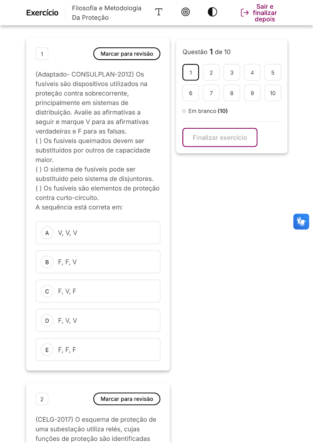 <p>Filosofia e Metodologia Sair e Exercício T finalizar Da Proteção depois 1 Marcar para revisão Questão 1 de 10 (Adaptado- CONSULPLAN-2012) Os 1 2 3 4 5 fusíveis são dispositivos utilizados na proteção contra sobrecorrente, 6 7 8 9 10 principalmente em sistemas de distribuição. Avalie as afirmativas a Em branco (10) seguir e marque V para as afirmativas verdadeiras e F para as falsas. Finalizar exercício ( ) Os fusíveis queimados devem ser substituídos por outros de capacidade maior. O sistema de fusíveis pode ser substituído pelo sistema de disjuntores. Os fusíveis são elementos de proteção contra curto-circuito. A sequência está correta em: A V, V, V B F, F, V C F, V, F D F, V, V E F, F, 2 Marcar para revisão (CELG-2017) O esquema de proteção de uma subestação utiliza relés, cujas funções de proteção são identificadas</p><p>por números, de acordo com normas internacionais. A figura a seguir mostra um esquema de proteção de uma subestação com primário acima de 15 kV. Os relés são identificados pelos números correspondentes às suas funções 3 PROTEÇÃO DE ENTRADA DE LINHA 3 TC'S 74 52 3 TC'S 26 3 71 A S 1000 kVA 87 51 Y 63 G 49 3 3 TC'S 5) 30 3 52 TENSAO Fonte: CS-UFG - 2017 - CELG/GT-GO - Analista Técnico - Engenheiro Eletricista. O relé responsável pela proteção diferencial do transformador é identificado pelo número A 26 B 50 C 51</p><p>D 87 E 63 3 Marcar para revisão (Adaptado - Petrobrás- 2011) Compondo o sistema de distribuição, há dispositivos de proteção e de manobra, que garantem a interrupção do defeito e isolamento da área em falha. Com relação às chaves seccionadoras, considere as afirmativas a seguir. - elemento térmico é o responsável pela proteção do circuito contra correntes de sobrecarga. II - As chaves seccionadoras são projetadas para que sua abertura seja efetuada sem corrente no circuito. III - As chaves seccionadoras são capazes de efetuar até 3 (três) religações de modo a manter o circuito operando após faltas temporárias. Está correto APENAS o que se afirma em: A B C III D I e E e III</p><p>4 Marcar para revisão (Adaptado- EFCJ- 2014) sistema elétrico está o tempo todo sujeito a possíveis falhas sendo elas de sobretensão, sobrecorrente ou outras. Assinale a seguir a alternativa que apresenta um dispositivo de proteção elétrica nos casos em que há excesso de corrente causado por sobrecarga ou curto-circuito em um sistema elétrico: A Capacitor B Seccionador C Fusíveis. D Indutor. E Válvula 5 Marcar para revisão (Adaptada- FCC- 2013) Para operar adequadamente o sistema elétrico conta com dispositivos capazes de garantir a segurança e integridade da rede. Em um sistema elétrico de alta tensão, a proteção principal é realizada normalmente por um dispositivo que possui três elementos internos que determinam a sua operação: sensor, comparador e atuador. Trata-se de:</p><p>A Transformador de instrumento B Chave seccionadora C Contator D Captor E Relé 6 Marcar para revisão (Adaptado FGV-2019) Atualmente existem no sistema alguns dispositivos com funções automáticas, que garantem maior autonomia a nível de proteção e seccionamento, como seccionadoras e religadores. equipamento que detecta uma falta e realiza um ciclo pré- programado de abertura e fechamento do circuito em que se encontra, visando maior continuidade do serviço, é A Relé B Comutador C PLC</p><p>D Religador E Seccionador 7 Marcar para revisão (CELESC-2018) Na construção de disjuntores para linhas de alta e média tensão existem vários tipos de disjuntores que têm a mesma finalidade, mas foram construídos de forma diferentes em relação à isolação e forma de extinção de arco elétrico na abertura dos contatos. Dentre as alternativas abaixo, assinale aquela que indica o componente ou a forma de extinção de arco A Metano, óleo e prespan Óleo, borracha EPR (Etileno B Propileno), parafina Cloreto de polivinila (PVC), C etileno propileno EPR e óleo mineral Somente o ar, mantendo uma distância mínima entre os D contatos para cada nível de tensão Óleo, ar comprimido, E hexafluoreto de enxofre</p><p>8 Marcar para revisão A função dos dispositivos de proteção, por exemplo, relés, é ordenar a imediata remoção de qualquer elemento de um sistema de potência quando ele sofrer um curto-circuito, ou quando operar em uma condição anormal comprometendo a operação efetiva do sistema elétrico. Os relés passaram por modernização e chegaram aos dispositivos conhecidos hoje por dispositivos inteligentes, ou digitais, que possuem multifuncionalidade e operam de acordo com a norma. De acordo com o exposto, verifica-se que: Os relés digitais apresentam em A seu hardware apenas as funções de monitoramento Os relés digitais não participam B da proteção do sistema elétrico A interoperabilidade não é C garantida Permite a comunicação entre D equipamentos, monitoramento e alivia na manutenção Não existe um E microprocessador incorporado na eletrônica relés digitais 9 Marcar para revisão</p><p>(Adaptado- AOCP-2019) Os relés digitais são resultantes do processo evolutivo em que esses dispositivos foram submetidos desde a criação dos relés eletromecânicos. A respeito dos relés de proteção digital utilizados em sistemas de energia elétrica de média tensão, é correto afirmar que: Medem a tensão e corrente A diretamente da rede, sem equipamentos intermediários Sua única função é proteger o B circuito contra sobrecorrentes Podem executar mais de uma C função de proteção D Não podem ser programados E Não possuem memória interna 10 Marcar para revisão (Adaptada SELECON-2022) Existem no mercado diversos tipos de relés, que são classificados conforme sua funcionalidade e características operativas. relé térmico é o responsável, tecnicamente, pela proteção contra a anomalia denominada: A Curto-circuito B Sobrecarga</p><p>C Tensão residual D Tens
