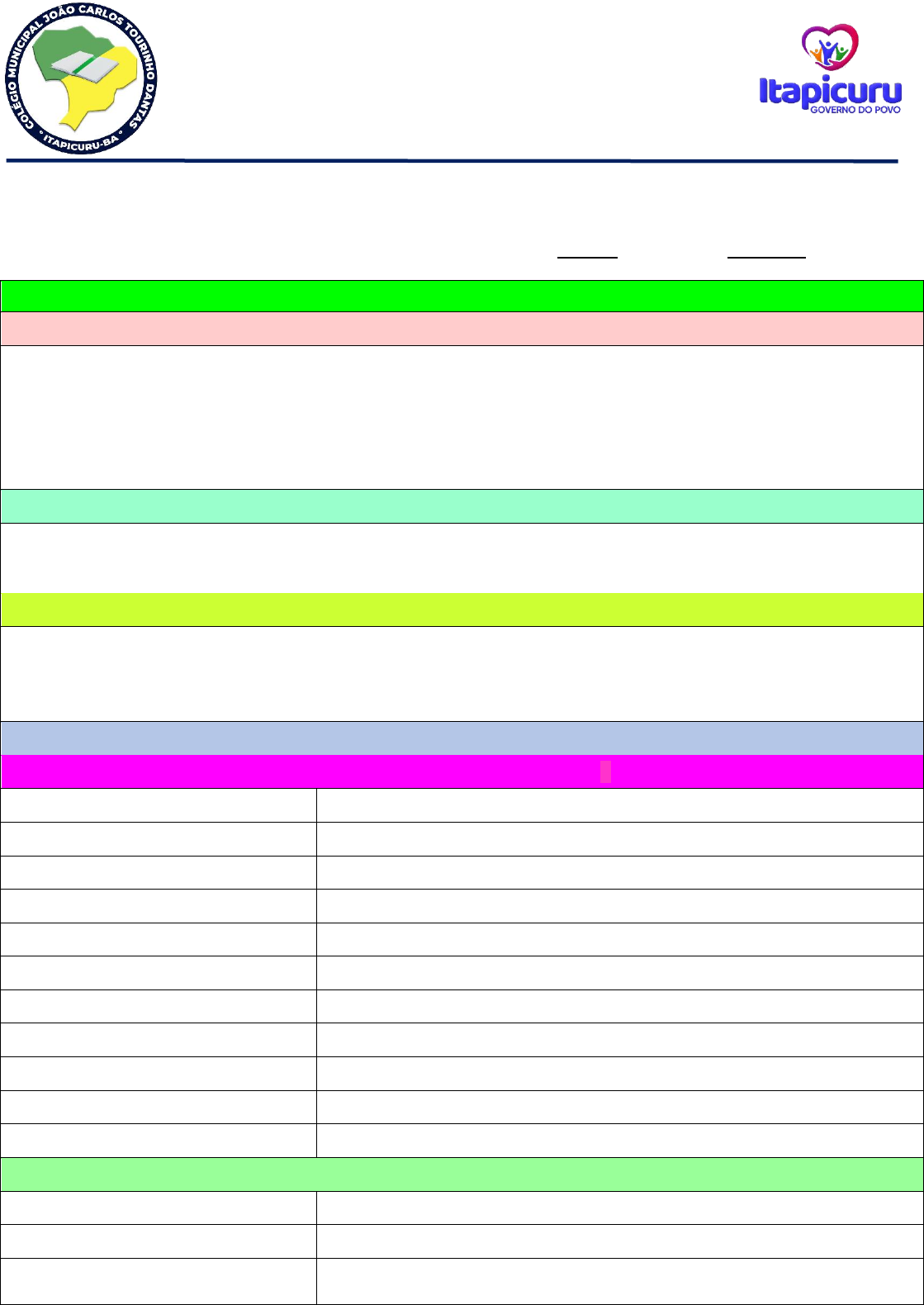 <p>ESTADO DA BAHIA</p><p>PREFEITURA MUNICIPAL DE ITAPICURU</p><p>SECRETARIA MUNICIPAL DE EDUCAÇÃO - SEDUC</p><p>COLÉGIO MUN. JOÃO CARLOS TOURINHO DANTAS</p><p>Avenida Antônio Carlos Magalhaes, Nº 153, Centro, CEP: 48.475-000, Itapicuru-BA</p><p>CNPJ: 13.647.557/0001-60 – INEP: 29129443</p><p>PLANO QUINZENAL ENSINO FUNDAMENTAL - ANOS INICIAIS</p><p>Professor (a): Daniel, Laudicéia e Wiracy. Série/Ano: 5º Ano Turno: Mat/Vesp</p><p>PERÍODO: 27/05/2024 à 08/06/2024</p><p>COMPETÊNCIAS GERAIS</p><p>( X ) Conhecimento</p><p>( X ) Pensamento cientifico, crítico e criativo</p><p>( X ) Repertório Cultural</p><p>( X ) Comunicação</p><p>( ) Cultura digital</p><p>( X ) Trabalho e Projeto de Vida</p><p>( X ) Argumentação</p><p>( X ) Autoconhecimento e autocuidado</p><p>( X ) Empatia e cooperação</p><p>( X ) Responsabilidade e Cidadania</p><p>ÁREAS DO CONHECIMENTO/BASE DIVERSIFICADA</p><p>( X ) Linguagens</p><p>( X ) Ciências Humanas</p><p>( X ) Matemática</p><p>( X ) Ensino Religioso</p><p>( X ) Ciências Naturais</p><p>( X ) Base Diversificada</p><p>COMPONENTE CURRICULAR</p><p>( X ) Língua Portuguesa</p><p>( X ) Artes</p><p>( X ) Educação Física</p><p>( X ) Redação</p><p>( X ) Matemática</p><p>( X ) Ciências</p><p>( X ) Geografia</p><p>( X ) História</p><p>( X ) Ensino Religioso</p><p>BASE COMUM e BASE SOCIOCULTURAL</p><p>COMPETÊNCIAS ESPECÍFICAS</p><p>DATA: 27/05/2024 (Segunda-feira) LP (03), LP (16), LP (21), MA (01).</p><p>DATA: 28/05/2024 (Terça-feira) MA (01), GE (08).</p><p>DATA: 29/05/2024 (Quarta-feira) LP (12), HI (01).</p><p>DATA: 30/05/2024 (Quinta-feira) FERIADO CORPUS CHRISTI.</p><p>DATA: 31/05/2024 (Sexta-feira) ER (01); MA (01), AR (01).</p><p>DATA: 03/06/2023 (Segunda-feira) LP (03), LP (16), LP (21), MA (01).</p><p>DATA: 04/06/2024 (Terça-feira) MA (01), GE (08).</p><p>DATA: 05/06/2024 (Quarta-feira) LP (12), HI (01).</p><p>DATA: 06/06/2024 (Quinta-feira) LP (24)/Redação; CI (02)</p><p>DATA: 07/06/2024 (Sexta-feira) ER (01); MA (01), AR (01).</p><p>DATA: 08/06/2024 (Sábado) LP (03), LP (16), LP (21), MA (01).</p><p>UNIDADE TEMÁTICA</p><p>DATA: 27/05/2024 (Segunda-feira) Oralidade, Leitura/escuta (compartilhada e autônoma); Números;</p><p>DATA: 28/05/2024 (Terça-feira) Números; Formas de representação e pensamento espacial;</p><p>DATA: 29/05/2024 (Quarta-feira)</p><p>Análise linguística/semiótica (Ortografização); Colonização e</p><p>Povoamento;</p><p>DATA: 30/05/2024 (Quinta-feira) FERIADO CORPUS CHRISTI.</p><p>DATA: 31/05/2024 (Sexta-feira)</p><p>Oralidade, Leitura/escuta (compartilhada e autônoma); Números; Artes</p><p>visuais; Esporte;</p><p>DATA: 03/06/2023 (Segunda-feira) Oralidade, Leitura/escuta (compartilhada e autônoma); Números;</p><p>DATA: 04/06/2024 (Terça-feira) Números; Formas de representação e pensamento espacial;</p><p>DATA: 05/06/2024 (Quarta-feira)</p><p>Análise linguística/semiótica (Ortografização); Colonização e</p><p>Povoamento;</p><p>DATA: 06/06/2024 (Quinta-feira) Produção de texto escrita compartilhada e autônoma; Matéria e energia;</p><p>DATA: 07/06/2024 (Sexta-feira)</p><p>Oralidade, Leitura/escuta (compartilhada e autônoma); Números; Artes</p><p>visuais; Esporte;</p><p>DATA: 08/06/2024 (Sábado) Oralidade, Leitura/escuta (compartilhada e autônoma); Números;</p><p>OBJETOS DO CONHECIMENTO</p><p>DATA: 27/05/2024 (Segunda-feira) Leitura e Interpretação de Texto; Propriedades da Multiplicação;</p><p>DATA: 28/05/2024 (Terça-feira) Propriedades da Multiplicação; A divisão política do Brasil;</p><p>DATA: 29/05/2024 (Quarta-feira) Acentuação; O Brasil Colônia: A Chegada dos Portugueses;</p><p>DATA: 30/05/2024 (Quinta-feira) FERIADO CORPUS CHRISTI.</p><p>DATA: 31/05/2024 (Sexta-feira)</p><p>Probleminha envolvendo multiplicação; A Religiosidade nas Festas</p><p>Juninas;</p><p>DATA: 03/06/2023 (Segunda-feira) Leitura e Interpretação de Texto; Propriedades da Multiplicação;</p><p>DATA: 04/06/2024 (Terça-feira) Propriedades da Multiplicação; A divisão política do Brasil;</p><p>DATA: 05/06/2024 (Quarta-feira) Acentuação; O Brasil Colônia: A Chegada dos Portugueses;</p><p>DATA: 06/06/2024 (Quinta-feira) Acentuação; As características do solo fértil.</p><p>DATA: 07/06/2024 (Sexta-feira) Probleminha envolvendo multiplicação; As Tradições das Festas Juninas;</p><p>DATA: 08/06/2024 (Sábado) Leitura e Interpretação de Texto; Multiplicação;</p><p>HABILIDADES</p><p>DATA: 27/05/2024 (Segunda-feira) (EF35LP01), (EF35LP03), (EF35LP04), (EF05MA01), (EF05MA07).</p><p>DATA: 28/05/2024 (Terça-feira) (EF35LP01), (EF35LP03), (EF15LP10), (EF05MA01), (EF05MA07).</p><p>DATA: 29/05/2024 (Quarta-feira) (EF35LP01), (EF35LP03), (EF35LP04), (EF15LP10), (EF05CI04).</p><p>DATA: 30/05/2024 (Quinta-feira) FERIADO CORPUS CHRISTI.</p><p>DATA: 31/05/2024 (Sexta-feira) (EF05ER01); (EF15AR01), (EF05MA01), (EF05MA07).</p><p>DATA: 03/06/2023 (Segunda-feira) (EF35LP01), (EF05LP02), (EF35LP12), (EF05MA01), (EF05MA07).</p><p>DATA: 04/06/2024 (Terça-feira) (EF05MA01), (EF05MA07), (EF05GE08).</p><p>DATA: 05/06/2024 (Quarta-feira) (EF35LP01), (EF15LP10), (EF15LP13),</p><p>DATA: 06/06/2024 (Quinta-feira) (EF35LP01), (EF35LP03), (EF35LP04), (EF15LP10), (EF05CI04)</p><p>DATA: 07/06/2024 (Sexta-feira) (EF05ER01); (EF15AR01), (EF05MA01), (EF05MA07).</p><p>DATA: 08/06/2024 (Sábado) (EF35LP01), (EF35LP03), (EF35LP04), (EF05MA01), (EF05MA07).</p><p>PROCEDIMENTOS METODOLÓGICOS</p><p>( X ) Aula expositiva com participação dos alunos.</p><p>( X ) Levantamento do conhecimento prévio.</p><p>( X ) Contrato didático (verbalizado).</p><p>( X ) Resolução de situações-problemas.</p><p>( ) Entrevistas.</p><p>( X ) Análises de resultados.</p><p>( X ) Intervenções para aulas expositivas.</p><p>( X ) Problematização e conceituação.</p><p>( ) Debates.</p><p>( ) Outros: ________________________________</p><p>AVALIAÇÃO FORMACIONAL DO PERÍODO</p><p>CRITÉRIOS INSTRUMENTOS</p><p>( X ) Processual e con