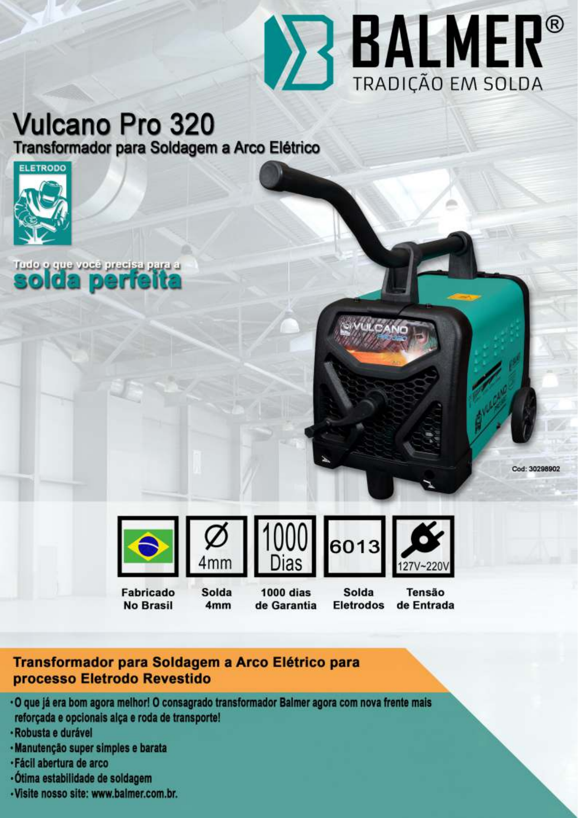 <p>R BALMER TRADIÇÃO EM SOLDA Vulcano Pro 320 Transformador para Soldagem a Arco Elétrico ELETRODO o que voce precisa para a solda perfeita Cod: 30298902 1000 6013 4mm Dias 127V-220V Fabricado Solda 1000 dias Solda Tensão No Brasil 4mm de Garantia Eletrodos de Entrada Transformador para Soldagem a Arco Elétrico para processo Eletrodo Revestido que já era bom agora melhor! 0 consagrado transformador Balmer agora com nova frente mais reforçada e opcionais alça e roda de transporte! Robusta e durável Manutenção super simples e barata Fácil abertura de arco Ótima estabilidade de soldagem Visite nosso site: www.balmer.com.br.</p><p>BALMER R TRADIÇÃO EM SOLDA Vulcano Pro 320 Transformador para Soldagem a Arco Elétrico Versão com Alça e Rodas Cod: 30298902 Características Técnicas Processo Eletrodo Revestido Tensão de Alimentação 127/220V Faixa de Corrente(A) 50 a 250 Tensão a Vazio (V) 54 Ciclo de trabalho (0 eletrodo @ %) 3,25 @ 15 Fator de Potência em Máxima Corrente 0,6 Dimensões (L C A)(mm) 390 315 222 Peso(Kg) 21 Classe de Proteção IP 21S "caracteristicas técnicas podem ser alteradas sem aviso prévio. Você estará recebendo: 01 Fonte de Soldagem modelo Vulcano Pro 320 01 Cabo Obra 01 Cabo para Porta Eletrodo 01 Porta Eletrodo 01 Garra Negativa 300A 01 Terminal para Aterramento 01 Manivela 01 KIT Alça e Rodas RALMER VULCANO Fricke Soldas Ltda. 55 3305 0700 Representante: CNPJ: 88.490.610/0001-61 BR 285, km 456,4, S/N 55 9 8437 0117 Bairro Lambari contato@fricke.com.br CEP: 98700-000 I - RS - Brasil Grupo Fricke f fb.com/balmersoldas</p>
