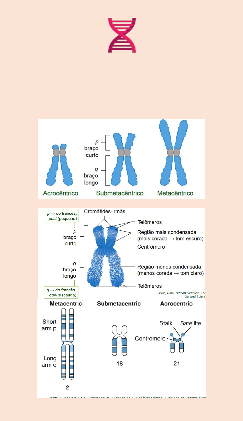 <p>GENÉTICA – CASO 5</p><p>· Descrever a morfologia geral de um cromossomo e identificá-los com base na posição do centrômero.</p><p>Quanto à forma, os cromossomos metafísicos humanos classificam-se em metacêntricos, submetacêntricos e acrocêntricos, como demonstrado na figura abaixo:</p><p>Essa classificação está baseada na posição em que o centrômero ocupa ao longo do cromossomo, dividindo-o em dois segmentos, chamados de braço curto (p) e braço longo (q).</p><p>a) Metacêntricos: o centrômero está localizado na porção central, dividindo o cromossomo em dois segmentos de tamanho muito semelhante. “p” e “q” são usados como referência, nesse caso, aos braços de cima e de baixo, respectivamente</p><p>b) Submetacêntricos: o centrômero está deslocado para uma das extremidades do cromossomo, gerando braços claramente de tamanhos diferentes.</p><p>c) Acrocêntricos: o centrômero está muito afastado para uma das extremidades. Além de termos uma constrição primária da cromatina (representada pelo centrômero), podemos observar uma segunda região de extrema condensação (constrição secundária). As constrições secundárias dos cromossomos acrocêntricos atuam como regiões organizadores de nucléolos.</p><p>· Determinar o tipo de alteração cromossômica a partir da análise de cariótipo</p><p>· Explicar as alterações cromossômicas do tipo euploidia, aneuploidia, deleção, duplicação, inversão e translocação (recíproca e Robertsoniana).</p><p>Antes de tudo, observemos o cariótipo humano normal:</p><p>Há 2 classificações de alterações cromossômicas</p><p>I. NUMÉRICAS: quando há mudanças no número padrão de cromossomos</p><p>a) Euploidia: haploidia (ou monoploidia) e poliploidia</p><p>São alterações que levam a uma célula a ter um número de cromossomos que é um múltiplo exato do conjunto haploide</p><p>Exemplo: poliploidia (3n, 4n, etc). Acontece quando o conjunto de cromossomos está representado triploidia (69 cromossomos), tetraploidia (n=92 cromossomos) ou mais. Levam a abortos espontâneos e podem ser encontradas em células tumorais.</p><p>Dois terços de todos os triploides resultam da fertilização de um oócito por dois espermatozoides. Outros casos surgem da formação de um gameta diplóide (1 espermatozoide haploide normal fertiliza um oócito diploide)</p><p>Algumas células humanas podem ser poliploides. O fígado, por exemplo, possui algumas células tetraplóides (4N) e até octaplóides (8N)</p><p>b) Aneuploidia: monossomia, trissomia, etc</p><p>Envolvem um ou mais cromossomos específicos, dando origem a células com um número de cromossomos que não é múltiplo do conjunto haploide característico</p><p>Células faltando um cromossomo ou com cromossomo extra são aneuplóides</p><p>Raramente, os aneuplóides podem ter mais de um cromossomo ausente ou extra</p><p>Aqueles que sobrevivem têm síndromes específicas, com sintomas dependendo de quais cromossomos estão ausentes ou extras</p><p>A aneuploidia do cromossomo sexual geralmente produz sintomas mais leves</p><p>As aneuploidias resultam da não disjunção, isto é, a não separação dos cromossomos durante a anáfase, podendo acontecer nas anáfases meióticas I ou II durante a formação dos games ou na anáfase da mitose após a formação do zigoto</p><p>A maioria das crianças nascidas com o número errado de cromossomos tem um cromossomo extra (trissomia) em vez de um ausente (monossomia)</p><p>Ocorrem devido à meiose defeituosa nos pais</p><p>Com exceção à monossomia do cromossomo Y, todas as aneuploidias envolvendo cromossomos sexuais (inclusive treta e pentassomias do X) são compatíveis com a vida e podem estar presentes em indivíduos com desenvolvimento normal ou próximo do normal. Isso graças à inativação epigenética do cromossomo X, que acontece em todos os cromossomos X adicionais</p><p>Exemplo. Trissomia (2n+1): ocorre quando um cromossomo específico está presente em três cópias em vez de duas, como o normal. Em geral, o aumento da expressão de genes em decorrência de trissomias é menos prejudicial para o organismo como um todo do que a perda gênica resultante das monossomias (2n-1). Por esse motivo, algumas trissomias são viáveis e apresentam grande importância sob o ponto de vista clínico, causando defeitos congênitos bem reconhecíveis. As principais trissomias conhecidas são as trissomias dos cromossomos 13, 18 e 21, associadas às síndromas de Patau, Edwards e Down, respectivamente. Há também a trissomia do cromossomo X, ou síndrome do triplo X.</p><p>Os autossomos (13,18 e 21) são os três que possuem menor número de genes. Nesse sentido, presume-se que a trissomia dos autossomos com maior número de genes seja letal na maioria dos casos</p><p>II. ESTRUTURAIS: há alterações na morfologia de um ou mais cromossomos</p><p>As alterações que envolvem a estrutura dos cromossomos resultam de uma ou mais rupturas transversais em um ou mais cromossomos, seguida de uma reconstituição cromossômica anormal. Podem ocorrer espontaneamente ou serem induzidas pela ação de agentes externos (radiação ionizante, drogas mutagênicas, infecções virais)</p><p>Também podem afetar todas as células do organismo ou apenas uma proporção delas (mosaicismo somático ou germinativo), podendo estar restritas aos gametas</p><p>a) Deleção: (del)</p><p>Representam quebras transversais que provocam perda de material cromossômico contido no segmento acêntrico. As manifestações clínicas em portadores de deleções dependerão da extensão do material cromossômico contido no segmento perdido, bem como a importância dos genes ali presentes. Geralmente, uma única cópia do gene deletado pode não ser suficiente para manter as funções originalmente desempenhadas pelas 2 cópias (haploinsuficiência)</p><p>Podem ser terminais (quebra simples na extremidade do cromossomo); intersticiais (quebra du