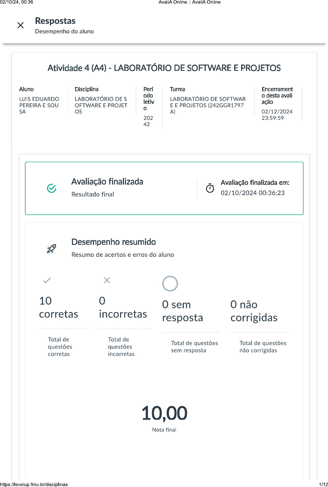 <p>02/10/24, 00:36 AvaliA Online :: AvaliA Online X Respostas Desempenho do aluno Atividade 4 (A4) - LABORATÓRIO DE SOFTWARE E PROJETOS Aluno Disciplina Perí Turma Encerrament odo o desta avali LUIS EDUARDO LABORATÓRIO DE S LABORATÓRIO DE SOFTWAR letiv ação PEREIRA E SOU OFTWARE E PROJET E E PROJETOS (242GGR1797 o SA os A) 02/12/2024 202 23:59:59 42 Avaliação finalizada Avaliação finalizada em: Resultado final 02/10/2024 00:36:23 Desempenho resumido Resumo de acertos e erros do aluno X 10 0 sem não corretas incorretas resposta corrigidas Total de Total de Total de questões Total de questões questões questões sem resposta não corrigidas corretas incorretas 10,00 Nota final https://levelup.fmu.br/disciplinas 1/12</p><p>02/10/24, 00:36 AvaliA Online : AvaliA Online Acertos Nome do Total de Questões Valor da Nota em aluno questões objetivas avaliação final objetivas LUIS EDUARDO 10 10 10 10,00 10,00 PEREIRA E SOUSA Questão em detalhes ?! Gabarito e respostas das questões Gabarito 1 2 3 4 5 6 7 8 9 10 Legenda das questões Corretas Incorretas Sem respostas Não corrigidas Discursivas corrigidas Questão anulada Questão 1: A primeira etapa no processo de um projeto de desenvolvimento de software, 1/1 Questão objetiva A primeira etapa no processo de um projeto de desenvolvimento de software, geralmente, é a entrevista. Durante essa etapa de desenvolvimento da entrevista, existem opções de perguntas a serem feitas de maneira que tenham sido preparadas anteriormente ou feitas de forma dinâmica. Em relação ao exposto, como se denomina esse tipo de entrevista? 2/12</p><p>02/10/24, 00:36 AvaliA Online :: AvaliA Online A Entrevista paralela. B Entrevista dirigida. Entrevista aberta. Resposta correta D Entrevista de requisitos. Entrevista fechada. E Questão 2: projeto de desenvolvimento de software é realizado a partir de um conjunto ... 1/1 Questão objetiva projeto de desenvolvimento de software é realizado a partir de um conjunto de metodologias, ferramentas, boas práticas, recursos e tarefas. Dentre o processo de desenvolvimento, existe uma tarefa que é responsável por encontrar falhas e validar se o software atende aos requisitos levantados. Nesse sentido, como essa tarefa é denominada? A Levantamento de requisitos. B Casos de uso. Teste de software. Resposta correta D Entrevista aberta. https://levelup.fmu.br/disciplinas 3/12</p><p>02/10/24, 00:36 AvaliA Online AvaliA Online Entrevista fechada. E Questão 3: processo de desenvolvimento de software é composto por um conjunto de 1/1 Questão objetiva O processo de desenvolvimento de software é composto por um conjunto de metodologias e processos que tem como objetivo garantir a qualidade do produto e gestão ágil do projeto. Nesse contexto, imagine que uma pessoa foi contratada para desenvolver um sistema a uma padaria de uma determinada cidade. Sobre o desenvolvimento de sistemas e a documentação, assinale a alternativa correta. Como é um software pequeno, não é necessário realizar a A documentação. Como é apenas uma pessoa, não é necessário realizar a B documentação. Independentemente do caso, é sempre necessário realizar a documentação. Resposta correta D Como é um software grande, não é necessário realizar a documentação. Nunca é necessário desenvolver a documentação do software. E Questão 4: teste de software é um processo fundamental no ciclo de desenvolvimento de 1/1 Questão objetiva teste de software é um processo fundamental no ciclo de desenvolvimento de software. Por meio dele, é possível identificar falhas e problemas que podem comprometer o devido funcionamento da aplicação. A qualidade do software está diretamente relacionada com a boa realização das práticas de teste, tornando essa atividade de fundamental importância para os profissionais de desenvolvimento de software. https://levelup.fmu.br/disciplinas 4/12</p><p>02/10/24, 00:36 AvaliA Online AvaliA Online JORGE, F. de F. et al. A evolução do jogo itest learning para o ensino das atividades de execução de testes de software. XX Conferência Internacional sobre Informática na Educação (TISE 2015)-Nuevas Ideas en Informática Educativa TISE, 2015. Anais (...). Há um documento que oferece suporte aos testes de sistema e tem como objetivo descrever toda a estratégia de testes utilizada. Diante do exposto, qual é o nome desse documento? A Plano de Uso. B Caso de Teste. Plano de Resposta correta D Caso de Uso. Plano de Classes. E Questão 5: Leia o excerto a seguir. "O teste de software é uma das atividades mais 1/1 Questão objetiva Leia o excerto a seguir. "O teste de software é uma das atividades mais custosas do processo de desenvolvimento de software, pois pode envolver uma quantidade significativa dos recursos de um projeto. rigor e o custo associados a essa atividade dependem, principalmente, da criticalidade da aplicação a ser desenvolvida. Diferentes categorias de aplicações requerem uma preocupação diferenciada com as atividades de teste." NETO, A. C. D. Introdução a teste de software. Engenharia de Software Magazine, 2015. Disponível em: https://levelup.fmu.br/disciplinas 5/12</p><p>02/10/24, 00:36 AvaliA Online AvaliA Online Teste_de_Software.pdf Acesso em: 25 fev. 2020. Quanto ao exposto, assinale a alternativa que apresenta corretamente as etapas de teste. Teste de desenvolvimento, teste de release, teste de usuário e teste A de classes. Teste de casos de uso, teste de release, teste de usuário e teste de B aceitação. Teste de desenvolvimento, teste de release, teste de usuário e teste C de aceitação. Resposta correta Teste de desenvolvimento, teste de equipe, teste de usuário e teste D de aceitação. Teste de programação, teste de release, teste de usuário e teste de aceitação. E Questão 6: Analise a seguinte figura:Fonte: Elaborada pelo autor. Ao ter em vista, ... 1/1 Questão objetiva https://levelup.fmu.br/disciplinas 6/12</p><p>02/10/24, 00:36 AvaliA O
