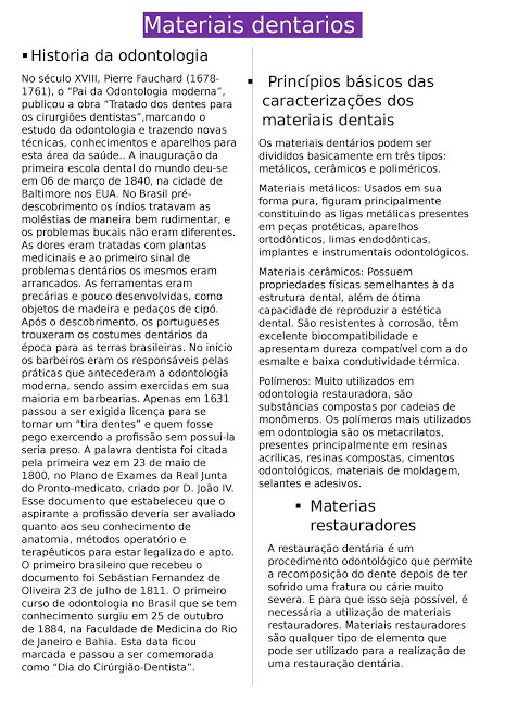 <p>Materiais dentarios Historia da odontologia No século XVIII, Pierre Fauchard (1678- Princípios básicos das 1761), "Pai da Odontologia publicou a obra "Tratado dos dentes para caracterizações dos os cirurgiões dentistas" marcando materiais dentais estudo da odontologia e trazendo novas técnicas, conhecimentos e aparelhos para Os materiais dentários podem ser esta área da A inauguração da divididos basicamente em três tipos: primeira escola dental do mundo deu-se cerâmicos e poliméricos. em 06 de março de na cidade de Materiais metálicos: Usados em sua Baltimore nos EUA. No Brasil pré- descobrimento os tratavam as forma pura, figuram principalmente moléstias de maneira bem rudimentar, e constituindo as ligas metálicas presentes os problemas bucais não eram em peças protéticas, aparelhos limas As dores eram tratadas com plantas medicinais e ao primeiro sinal de implantes e instrumentais odontológicos. problemas dentários os mesmos eram Materiais cerâmicos: Possuem As ferramentas eram propriedades físicas semelhantes à da e pouco como estrutura dental, além de ótima objetos de madeira e pedaços de capacidade de reproduzir a estética Após os portugueses dental São resistentes à corrosão, têm trouxeram os costumes dentários da excelente biocompatibilidade e época para as terras No início apresentam dureza compatível com a do os barbeiros eram os responsáveis pelas esmalte e baixa condutividade práticas que antecederam a odontologia Muito utilizados em moderna, sendo assim exercidas em sua maioria em Apenas em 1631 odontologia são passou a ser exigida licença para se compostas por cadeias de tornar um "tira dentes" e quem fosse Os mais utilizados pego exercendo a profissão sem possui-la em odontologia são os seria preso. A palavra dentista foi citada presentes principalmente em resinas pela primeira vez em 23 de maio de resinas compostas, cimentos no Plano de Exames da Real Junta materiais de moldagem, selantes e adesivos. do criado por D. João IV. Esse documento que estabeleceu que Materias aspirante a profissão deveria ser avaliado quanto aos seu conhecimento de restauradores métodos operatório e terapêuticos para estar legalizado e apto. A restauração dentária é um O primeiro brasileiro que recebeu procedimento odontológico que permite documento foi Fernandez de a recomposição do dente depois de ter Oliveira 23 de julho de 1811. O primeiro sofrido uma fratura ou cárie muito curso de odontologia no Brasil que se tem severa. E para que isso seja é conhecimento surgiu em 25 de outubro a utilização de materiais de 1884, na Faculdade de Medicina do Rio Materiais restauradores de Janeiro e Esta data ficou são qualquer tipo de elemento que marcada e passou a ser comemorada pode ser utilizado para a realização de como "Dia do uma restauração</p>