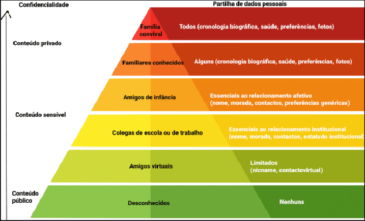 <p>Confidencialidade Partilha de dados pessoais Família Todos (cronologia biográfica, saúde, preferências, fotos) convival Conteúdo privado Familiares conhecidos Alguns (cronologia biográfica, preferências, fotos) Amigos de infância Essenciais ao relacionamento afetivo (name, morada, contactos, preferências genéricas) Conteudo Essenciais ao relacionamento institucional Colegas de escola ou de trabalho (nome, morada, contactos, estatudo institucional Limitados Amigos virtuais (nicname, contactovirtual) Conteúdo público Desconhecidos Nenhuns</p>